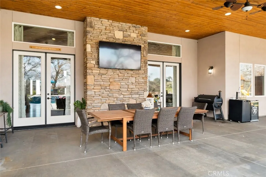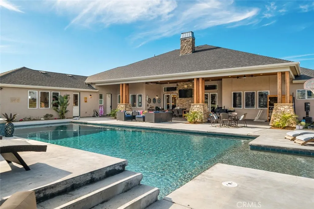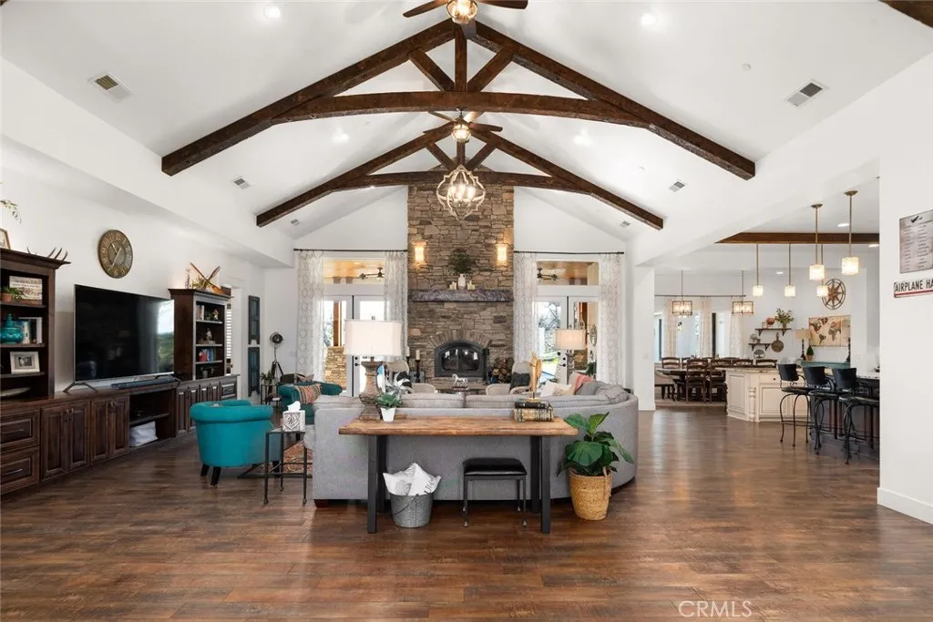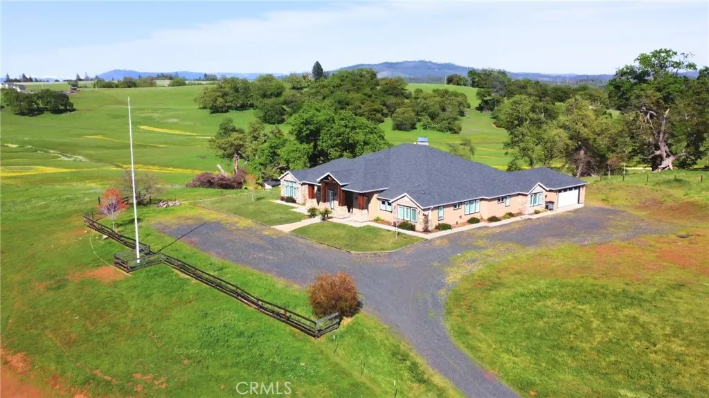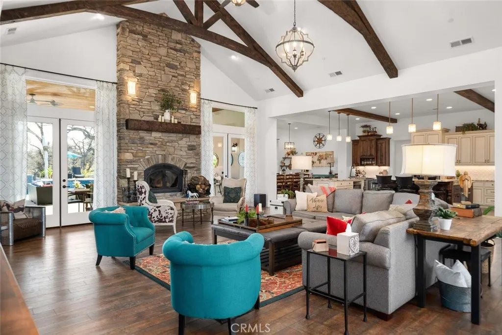 The California wild flowers have arrived on Table Mountain. Experience ranch style living, practicality, and natural beauty in this extraordinary luxury estate. From the moment you step inside, youll be captivated by the soaring 20-foot vaulted, beamed ceilings and the seamless open floor plan, designed for effortless entertaining. Light, neutral walls pair beautifully with the striking floor-to-ceiling stone fireplace, creating a warm and welcoming atmosphere. This is more than a home; its a place to truly unwind and enjoy. The gourmet kitchen is a culinary masterpiece, featuring granite countertops, custom soft-close cabinetry, a sleek tile backsplash, and premium LG stainless steel appliances. It also includes thoughtful details like a separate warming drawer, under-counter ice maker, and two spacious islands with seatingideal for hosting guests or enjoying casual family meals. Behind elegant double doors lies the luxurious primary suite, a private retreat designed for ultimate comfort. This spacious haven includes room for a cozy seating area, an expansive walk-in closet with its own laundry station, and a spa-like en suite bathroom. The bathroom boasts dual sinks, a dedicated vanity, a relaxing soaking tub, and a large tiled walk-in shower with dual showerheads. Each additional bedroom also features its own en suite bathroom, providing comfort and privacy for everyone. Additional features throughout the home include custom alder cabinetry, recessed lighting, plantation shutters, custom doors, a large laundry room with ample storage and a utility sink, his and hers offi