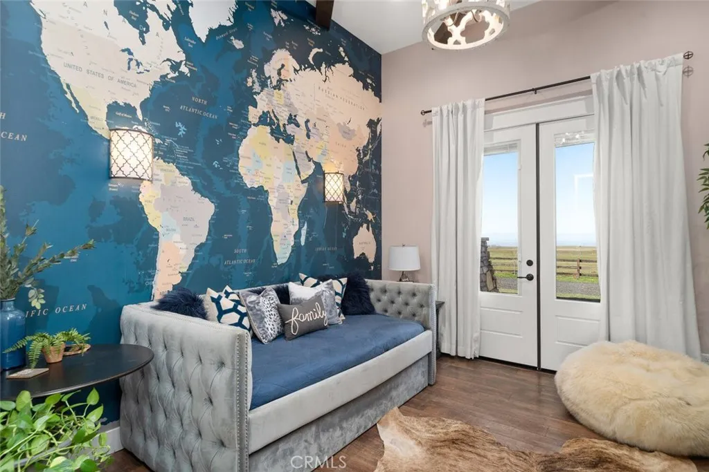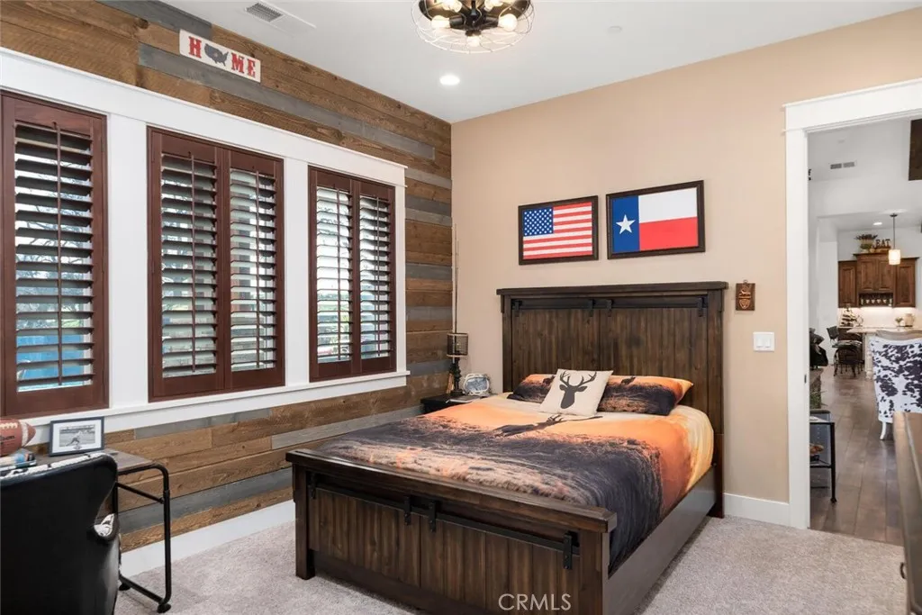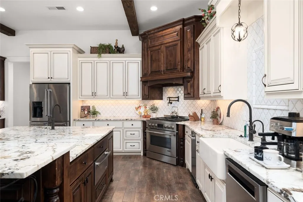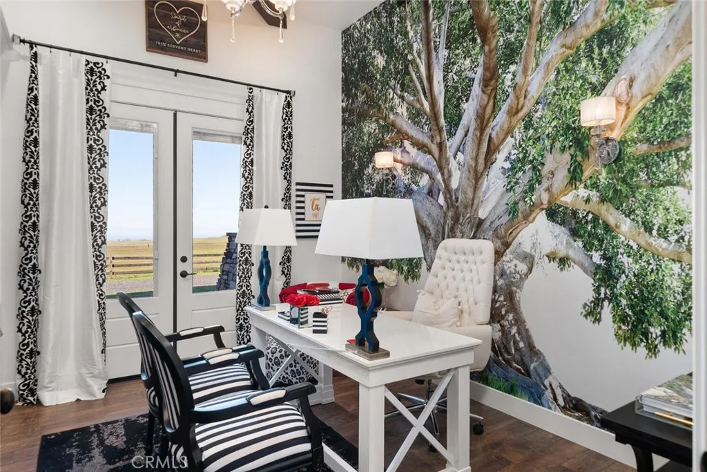 The California wild flowers have arrived on Table Mountain. Experience ranch style living, practicality, and natural beauty in this extraordinary luxury estate. From the moment you step inside, youll be captivated by the soaring 20-foot vaulted, beamed ceilings and the seamless open floor plan, designed for effortless entertaining. Light, neutral walls pair beautifully with the striking floor-to-ceiling stone fireplace, creating a warm and welcoming atmosphere. This is more than a home; its a place to truly unwind and enjoy. The gourmet kitchen is a culinary masterpiece, featuring granite countertops, custom soft-close cabinetry, a sleek tile backsplash, and premium LG stainless steel appliances. It also includes thoughtful details like a separate warming drawer, under-counter ice maker, and two spacious islands with seatingideal for hosting guests or enjoying casual family meals. Behind elegant double doors lies the luxurious primary suite, a private retreat designed for ultimate comfort. This spacious haven includes room for a cozy seating area, an expansive walk-in closet with its own laundry station, and a spa-like en suite bathroom. The bathroom boasts dual sinks, a dedicated vanity, a relaxing soaking tub, and a large tiled walk-in shower with dual showerheads. Each additional bedroom also features its own en suite bathroom, providing comfort and privacy for everyone. Additional features throughout the home include custom alder cabinetry, recessed lighting, plantation shutters, custom doors, a large laundry room with ample storage and a utility sink, his and hers offi
