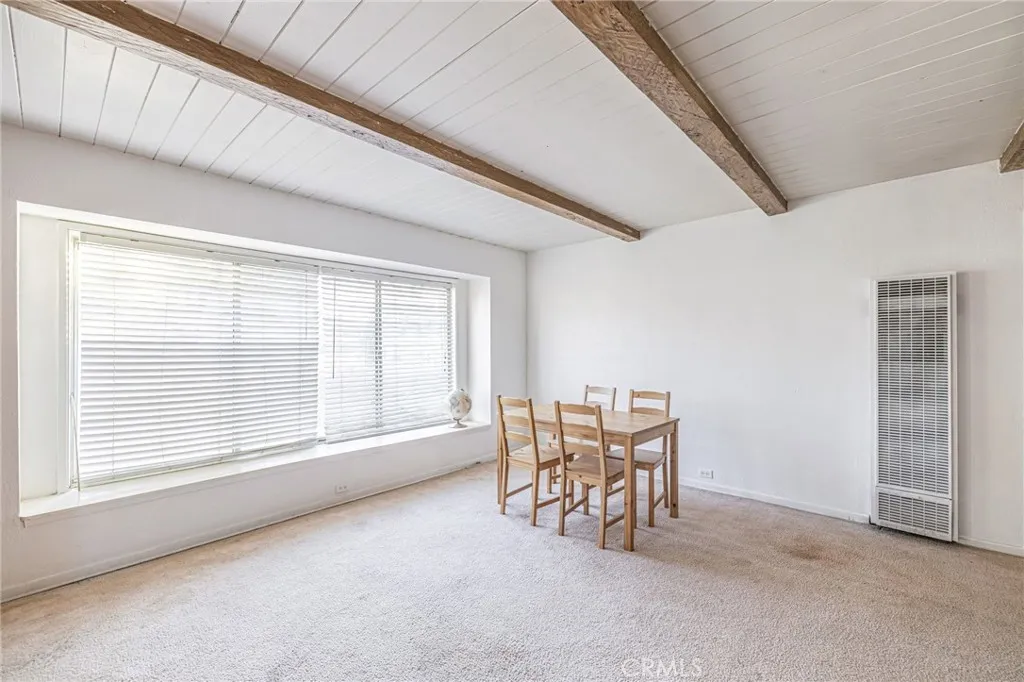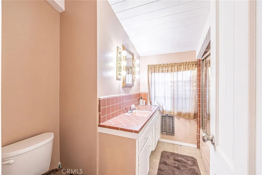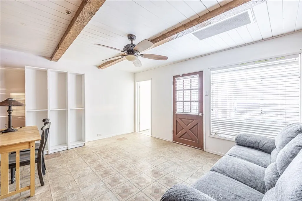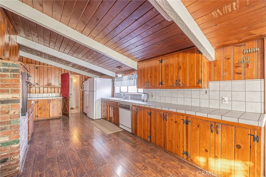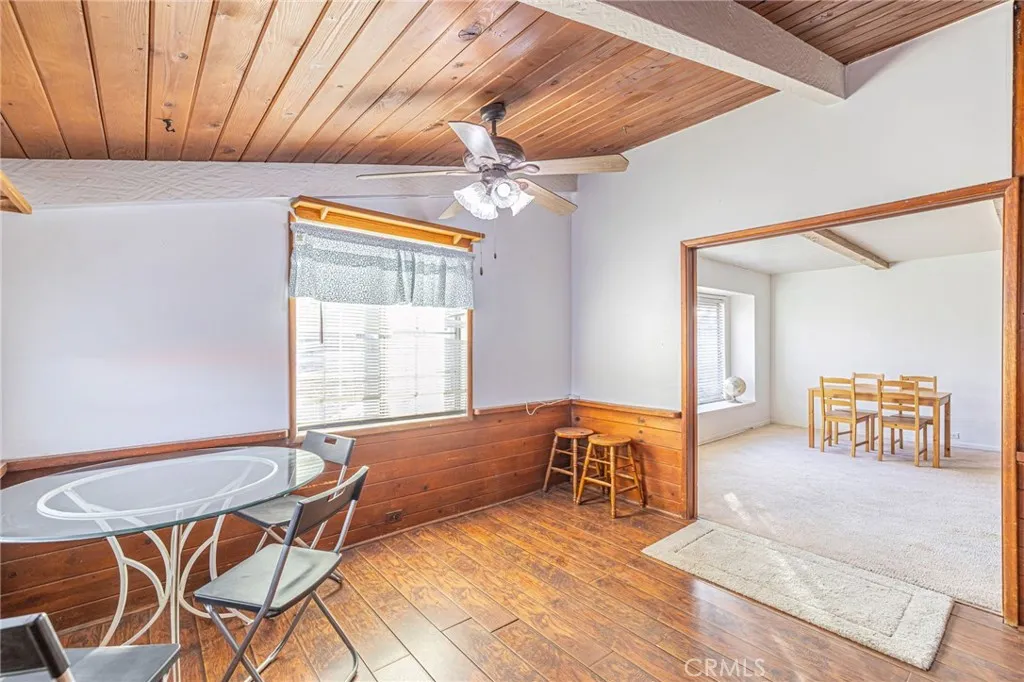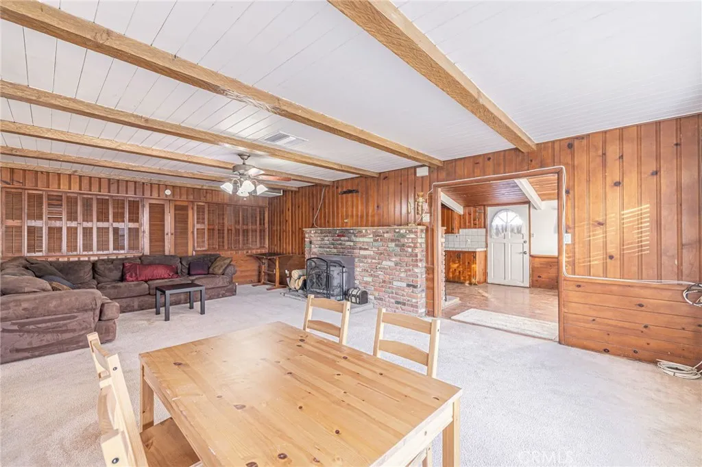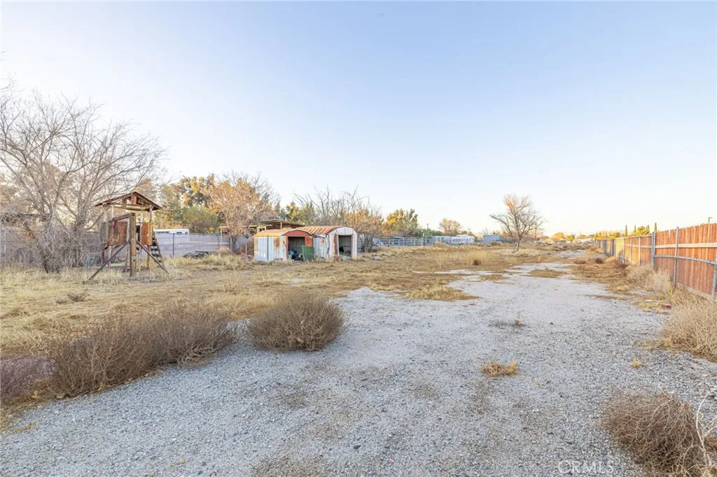 Nestled on over an acre of land in the sun-drenched city of Palmdale, this charming single-story residence offers both comfort and potential. A long driveway leads to a detached 4-car garage, providing ample space for your vehicles and recreational toys, while the expansive front patio invites you to unwind and enjoy the outdoors. Step inside to discover a rustic yet inviting home, where vaulted ceilings adorned with wooden paneling and exposed beams create a sense of grandeur. The blend of carpet and laminate flooring throughout complements the timeless beauty of a brick fireplace, exuding old-world charm. The spacious kitchen is a true focal point, featuring built-in appliances, rich wood cabinetry, and tile countertops accented with a tasteful backsplash. It seamlessly connects to the adjacent guest bathroom and laundry room, which offers convenient access to the open courtyard and patio space beyond. The expansive living room, with its large picture window, fills the space with natural light, while a cozy wood-paneled rumpus room offers a perfect retreat. The homes remodeled bedrooms showcase fresh paint, vinyl flooring, and ample built-in closet storage. The generous primary suite is a serene escape, featuring an en-suite bathroom with a dual sink vanity and a wealth of closet space. The outdoor courtyard area leads to a detached recreation room, offering endless possibilities for use. Notable updates include a new central air and heating system. With its prime location this property presents a rare opportunity to create your own personal oasis while enjoying the conve
