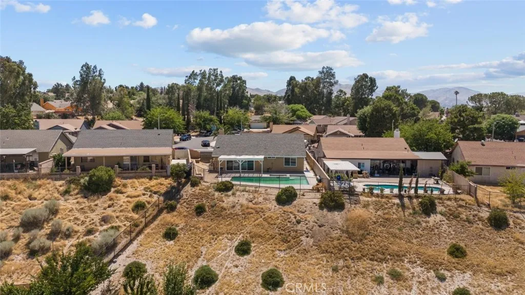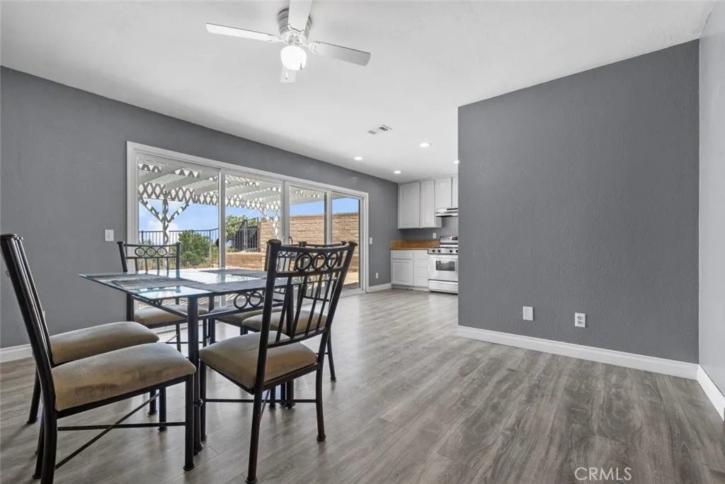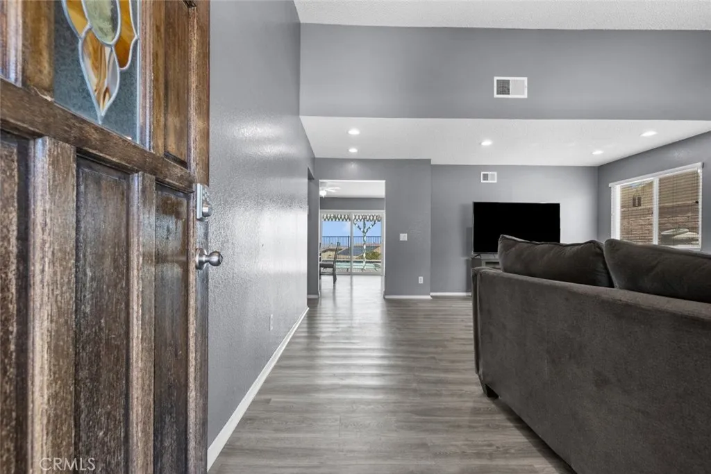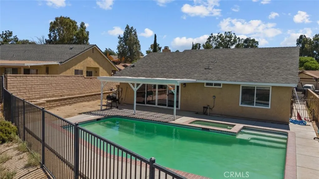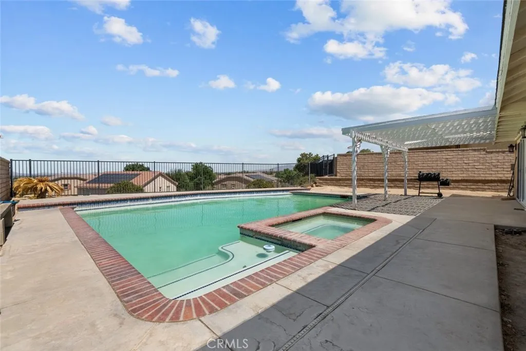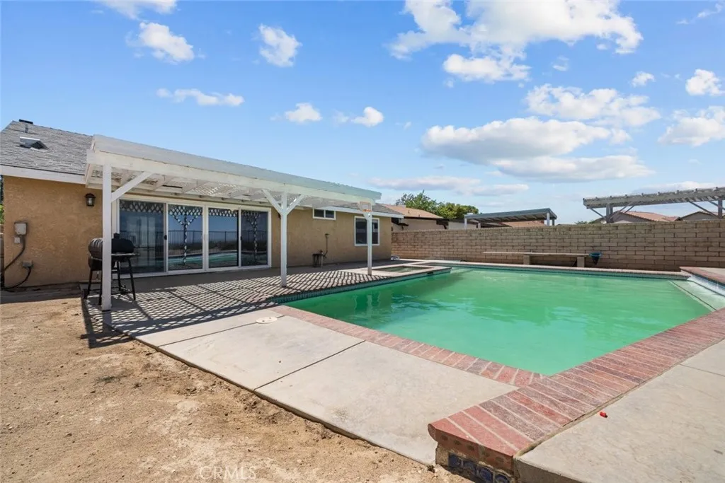 This beautiful Palmdale home offers 4 bedrooms, 2 bathrooms, and spans 1,558 SqFt. It boasts recessed lighting, a pool, and an attached two-car garage. The spacious family room features a vaulted ceiling and a cozy fireplace. The kitchen is well-appointed with granite countertops, white cabinets, and modern appliances including a refrigerator, dishwasher, and freestanding gas stove and oven. Laundry facilities are conveniently located in a hallway closet. The primary bedroom is generously sized and includes a private bathroom with a walk-in shower featuring a glass door, and dual sinks with granite countertops. The additional bedrooms are also spacious and include built-in closet features. The hall bathroom is a full bath with a granite countertop. Outside, the backyard is paved with a pergola-covered area adjacent to the pool.