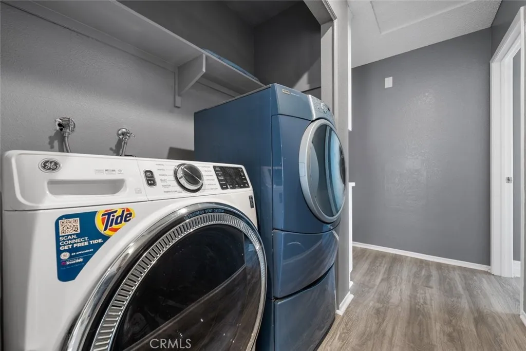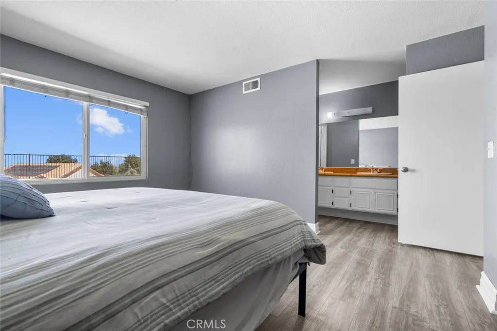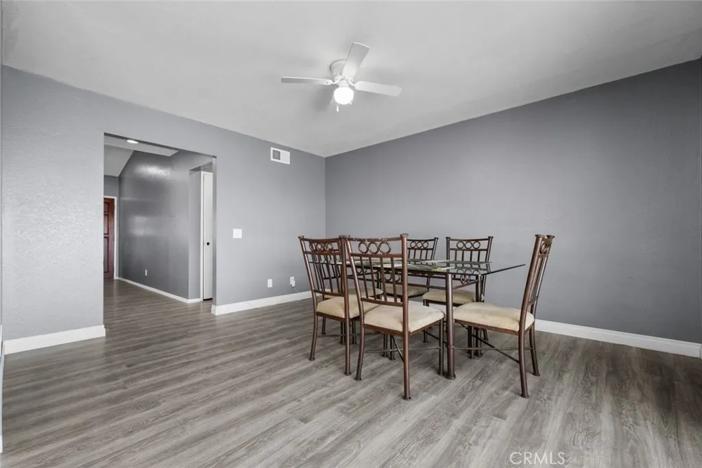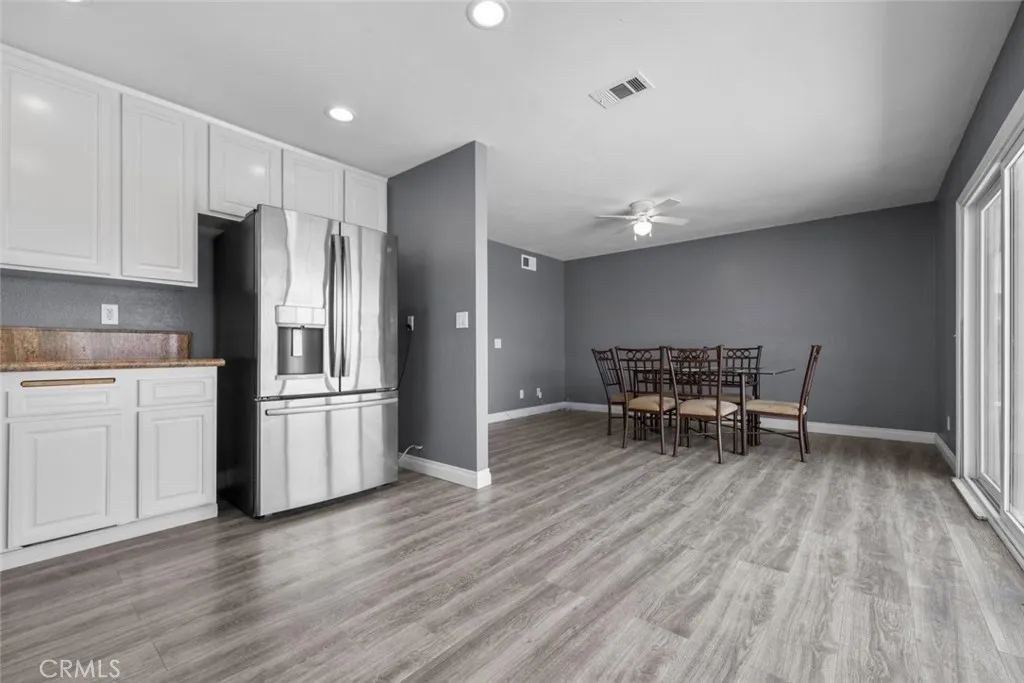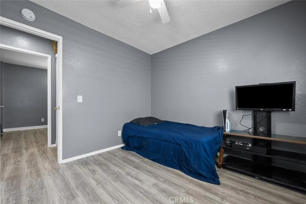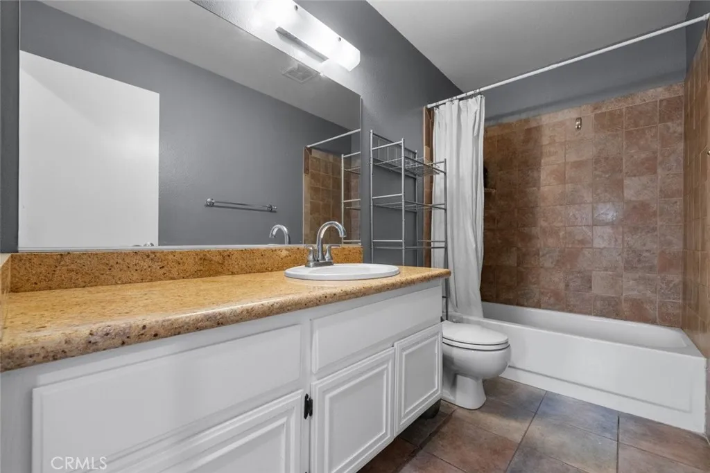 This beautiful Palmdale home offers 4 bedrooms, 2 bathrooms, and spans 1,558 SqFt. It boasts recessed lighting, a pool, and an attached two-car garage. The spacious family room features a vaulted ceiling and a cozy fireplace. The kitchen is well-appointed with granite countertops, white cabinets, and modern appliances including a refrigerator, dishwasher, and freestanding gas stove and oven. Laundry facilities are conveniently located in a hallway closet. The primary bedroom is generously sized and includes a private bathroom with a walk-in shower featuring a glass door, and dual sinks with granite countertops. The additional bedrooms are also spacious and include built-in closet features. The hall bathroom is a full bath with a granite countertop. Outside, the backyard is paved with a pergola-covered area adjacent to the pool.