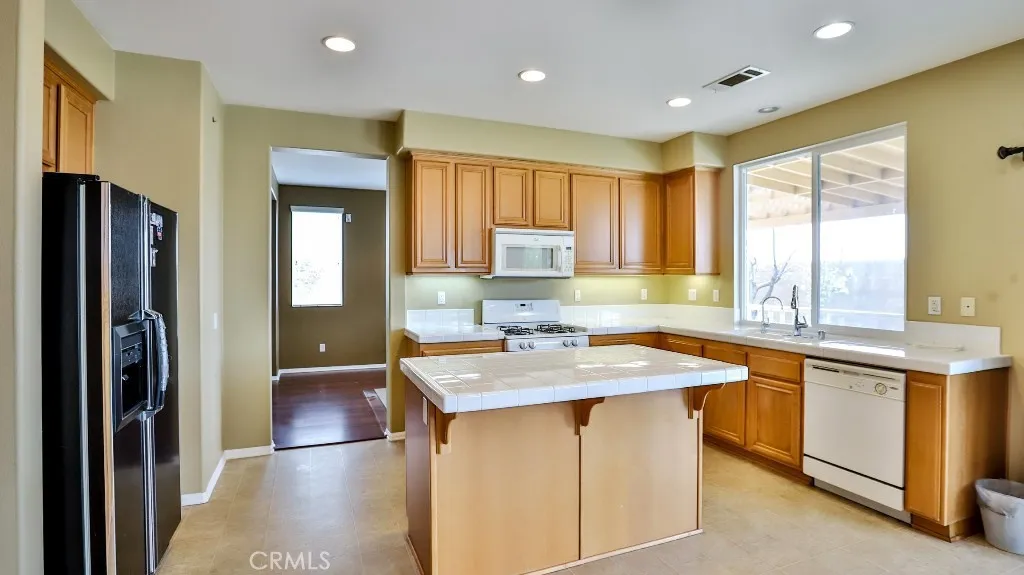 Located at 1339 Addison Way in Perris, CA 92571, this spacious two-story home offers 5 bedrooms and 3 full bathrooms across 2,657 square feet of living space. Built in 2009, the property features an open floor plan connecting the kitchen and family room, complete with a cozy fireplaceideal for entertaining. The kitchen boasts ample cabinet storage and an island with a breakfast bar. The first floor includes a bedroom and a full bathroom, while the second floor houses four additional bedrooms, including a master suite with a walk-in closet and an en-suite bathroom featuring dual sinks and a separate tub-shower combo. An upstairs laundry room adds convenience. The backyard is equipped with a patio slab and fruit trees, providing a pleasant outdoor space. Additional highlights include a 3-car attached garage and an assumable solar system to help reduce energy costs.