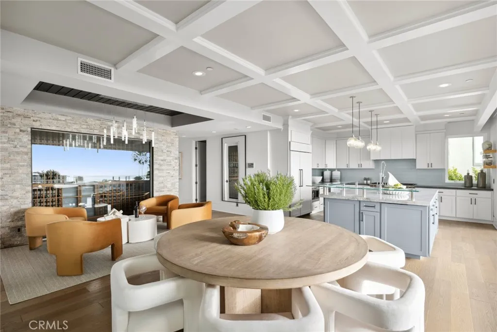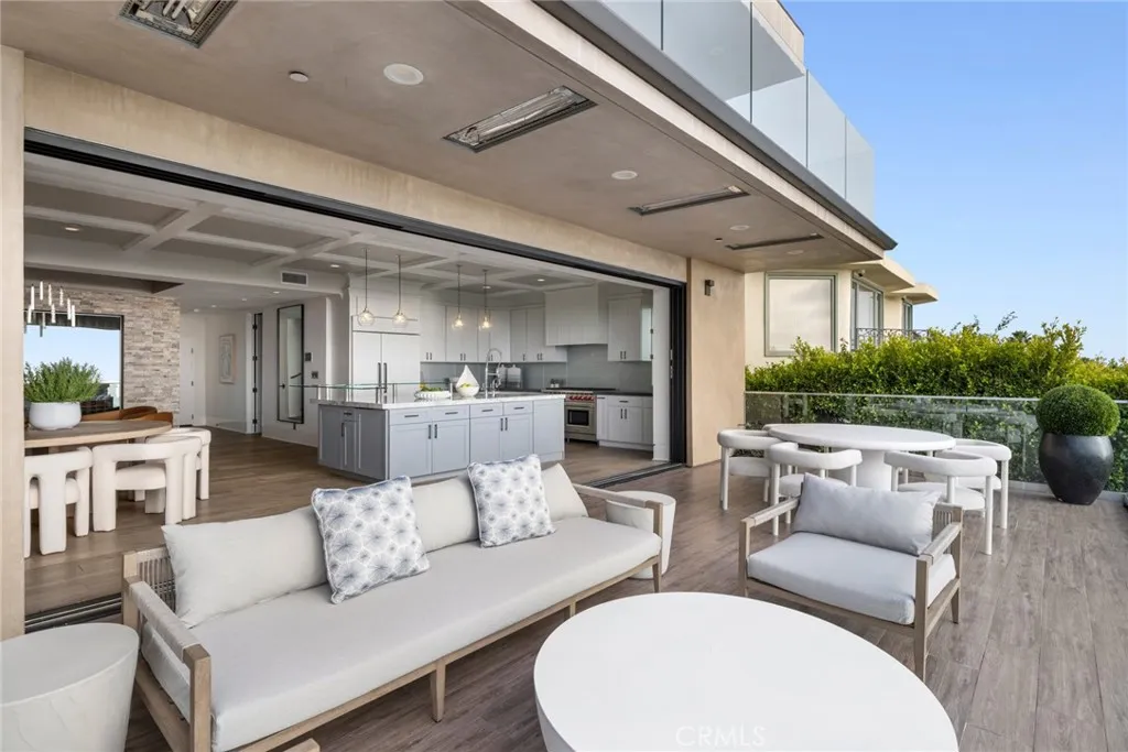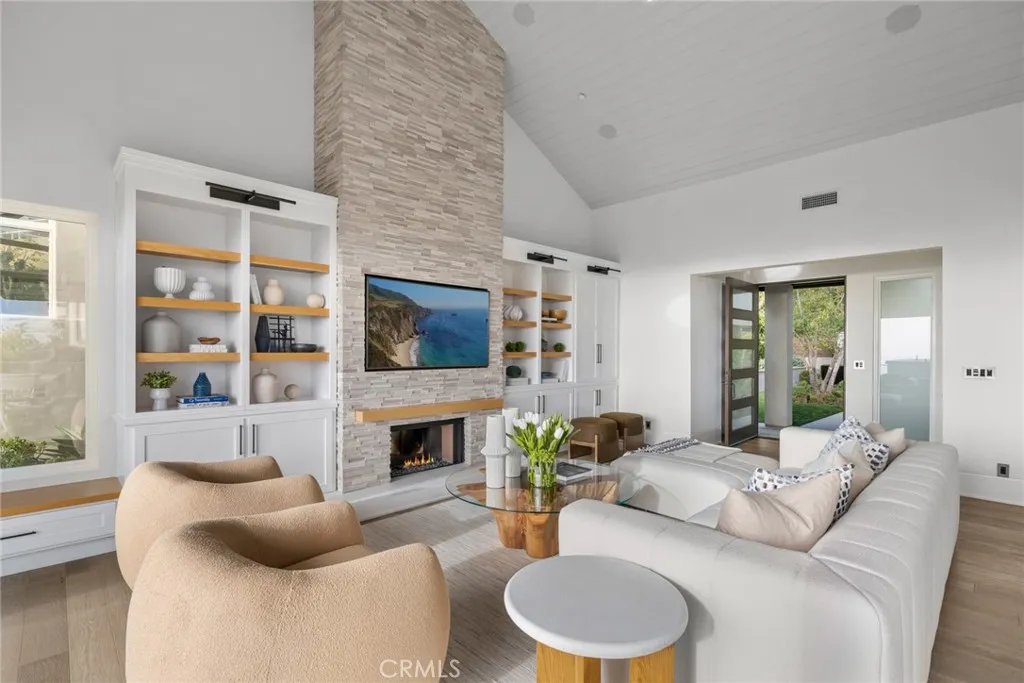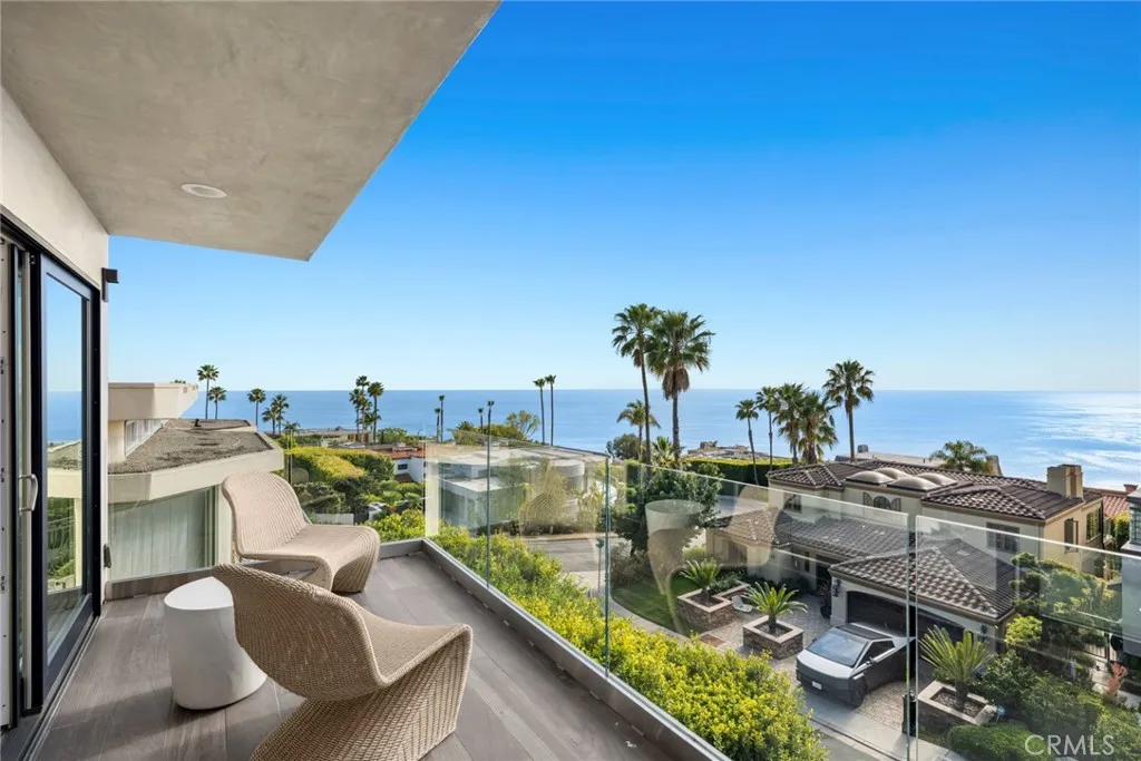 Nestled near the end of a peaceful cul-de-sac in Laguna Beachs desirable Portafina enclave, this stunning custom home is a true oasis offering exceptional privacy and unparalleled ocean views. Flashing sparkles of light reflecting off the Pacific Ocean, Catalina Islands iconic silhouette, and city lights twinkling after sunset are just some of the captivating visual delights that you will enjoy. Extensively remodeled and expanded, the modern showplace captures views from indoor and outdoor living spaces. Extending approximately 3,315 square feet, a phenomenal floorplan with four ensuite bedrooms and four- and one-half baths provides an impressive flow that accommodates easy entertaining, all with the ocean as a gorgeous backdrop. The main level is introduced by a large living room with vaulted ceiling and a stacked-stone fireplace flanked by custom built-ins. Walls of slideaway glass doors open this level to a generous heated deck where friends and loved ones will savor ever-changing ocean views. A lounge and glass-enclosed temperature-controlled wine room set the tone for elegant dinner parties in the dining room, which transitions seamlessly to a fabulous island kitchen. Chefs of all skill levels will appreciate the style and functionality of abundant Shaker cabinetry and stone countertops. A built-in refrigerator displays cabinet-matched panels, while a built-in coffee station is joined by a six-burner Wolf range and double oven. Truly one of a kind, the residence offers an elevated design aesthetic that is destined to stand the test of time. Wood flooring, coffered ceil