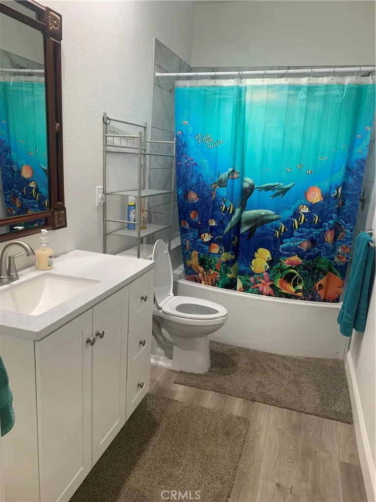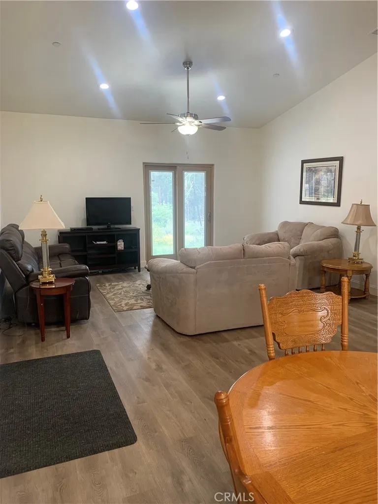 Nestled in the community of Paradise Pines, this charming single-story home offers the perfect blend of comfort, functionality, and style. Boasting 3 spacious bedrooms and 2 full bathrooms across 1,410 square feet of living space, this home is ideal for families, retirees, or anyone looking for a retreat with modern conveniences. Greeted by a bright and welcoming living room featuring a vaulted ceiling that enhances the sense of space and openness. Natural light pours in through the windows, highlighting the warmth of the beautiful wood flooring that flows through the main living areas. The thoughtfully designed kitchen is both stylish and practical, with ample cabinetry for storage, sleek countertops, on demand hot water, and a movable center island that offers flexible space for meal prep, casual dining, or entertaining. The bedrooms are carpeted and the bathrooms are clean, with modern fixtures and plenty of storage. The ceiling fans add an energy-efficient cooling option and help keep the home comfortable year-round. The 2-car garage provides secure parking and additional storage options, adding to the homes overall convenience. Located within the Paradise Pines Owners Association, residents enjoy access to community amenities, and a tranquil lifestyle. Shown by Appointment only!