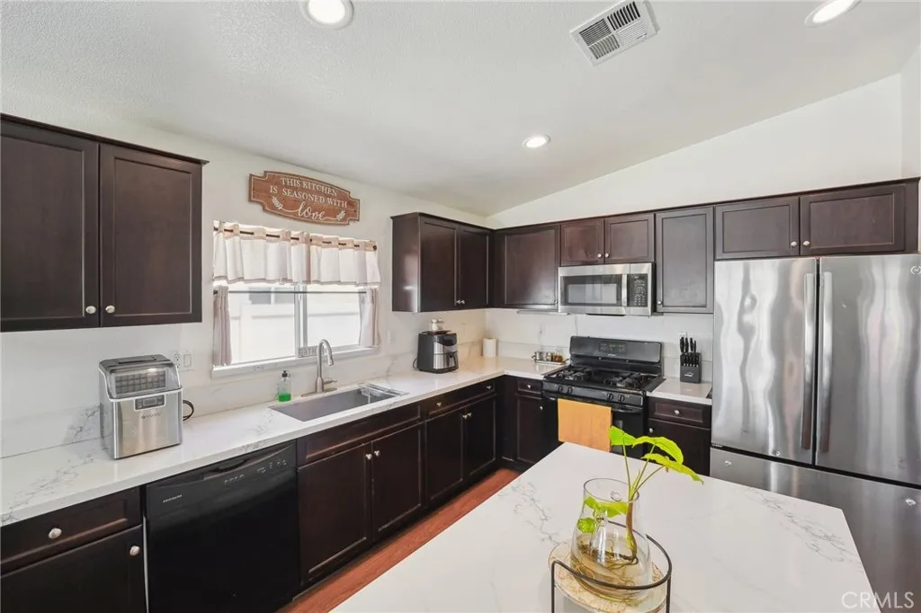 Upgraded & Ready to Impress 4-Bedroom Gem with a Custom Kitchen Island! Welcome to 15756 McVay Lane, a beautifully maintained DR Horton home built in 2017, located in the thriving community of South Adelanto. This spacious 4-bedroom, 2-bathroom home offers 1,892 square feet of thoughtfully designed living space with an open-concept layout, high ceilings, and a wide entry hallway that leads into a light-filled great room. FIRE SPRINKLER SYSTEM LOCATED INSIDE THE HOME! HOME ALSO COMES WITH A TANKLESS WATER HEATER! The kitchen has been enhanced with a newly added island, providing additional prep space and seatingperfect for casual dining and entertaining. It also features a full walk-in pantry, modern cabinetry, and matching stainless steel appliances, including a stove, dishwasher, and refrigerator. The flexible floor plan includes a fourth bedroom with gorgeous French doors that can also function as a den, office, or guest space. The private primary suite offers a spacious walk-in closet and an en-suite bath with dual sinks and a stand-up shower. A separate laundry room is conveniently located near the two-car garage and includes an oversized hallway storage closet. Outside, enjoy a well-maintained backyard with custom paver patio, block wall fencing, and vinyl side fencingideal for outdoor gatherings. The front and back yards are professionally landscaped for low maintenance and great curb appeal. The home is solar-ready, offering future energy efficiency. Located just minutes from Highway 395, the 15 Freeway, local schools, and shopping centers, this move-in-ready home c