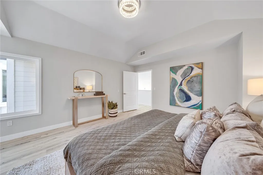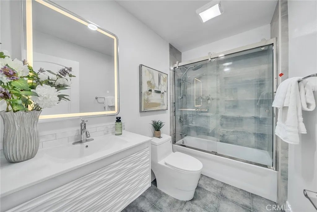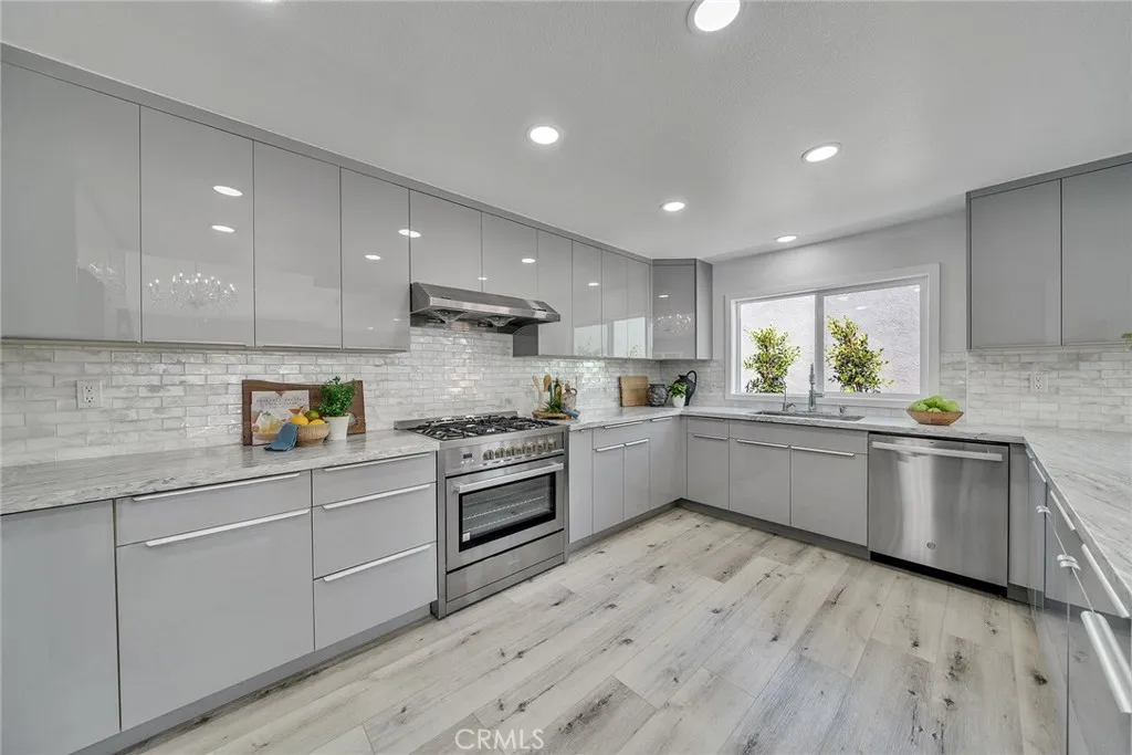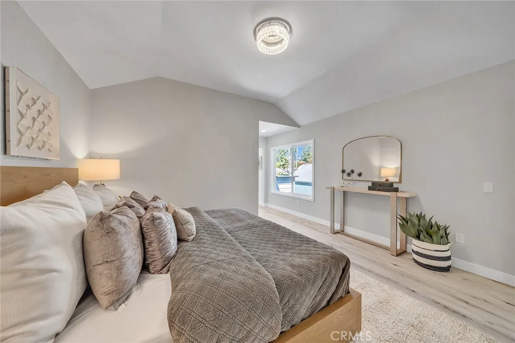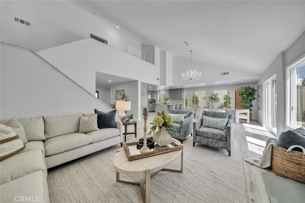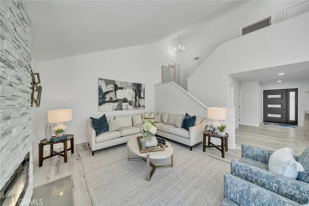 Truly one-of-a-kind and the only home of its kind in the area, this stunning, newly renovated property is located in Irvines desirable Northwood neighborhood. This extensively upgraded 4-bedroom, 3-bathroom home includes a 237-sqft permitted addition, expanding the total living space and enhancing its unique, functional layout. Featuring a permitted two downstairs bedrooms and full bathroom, it's perfect for multigenerational living or a private guest suite. Set on a spacious 4,815 sqft lot, the expanded 2,222 sqft home boasts striking curb appeal with a gated front yard, mature flowering shrubs, and low-maintenance landscaping. Step through the luxury modern front door and be greeted by a bright, open interior featuring soaring vaulted ceilings, new vinyl flooring, and expansive dual-pane windows that bathe the space in natural light. The open-concept kitchen is a chefs dream, designed with high-end European-style cabinetry, quartz countertops, a large center island with breakfast bar, designer backsplash, and premium stainless steel appliances including a professional-grade gas range. Adjacent living and family rooms are anchored by a stunning floor-to-ceiling stacked stone electric fireplace, perfect for relaxing or entertaining. The main level also includes two bedroomsone ideal as a home office with bay windowand a beautifully designed full bathroom with sleek tile work, floating vanity, LED mirror, and modern finishes. Upstairs, retreat to the luxurious primary suite, complete with a private balcony, walk-in closet, and spa-like en-suite bath with a freestanding soaki
