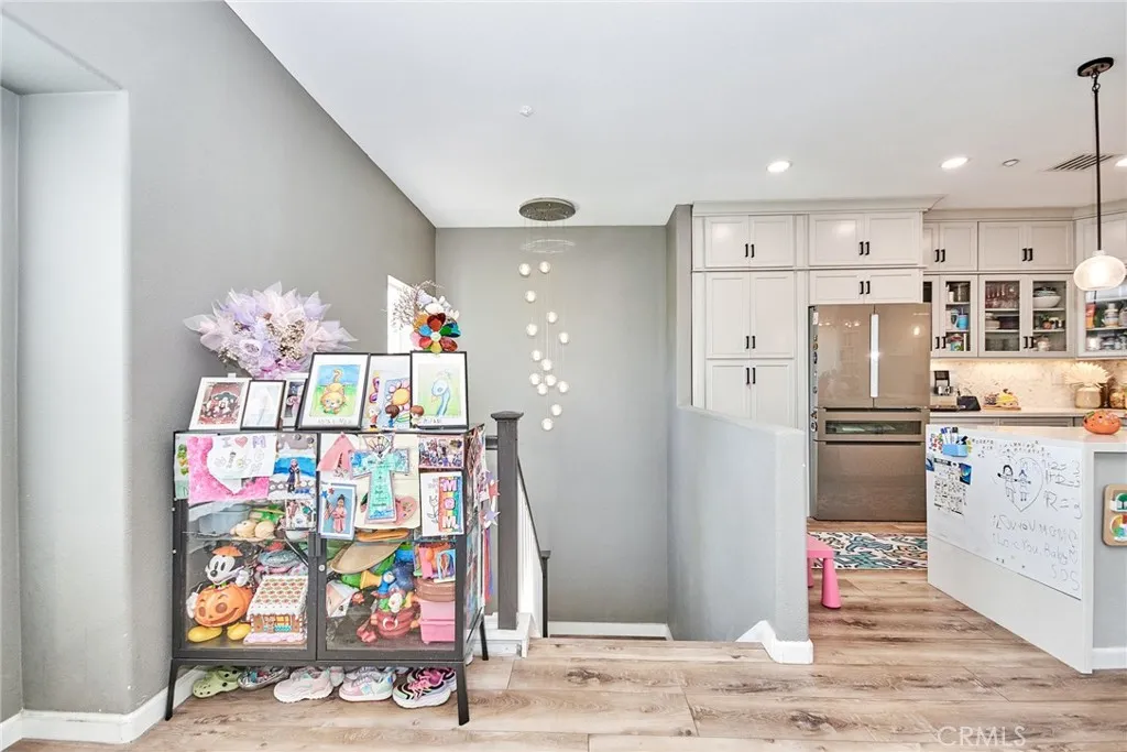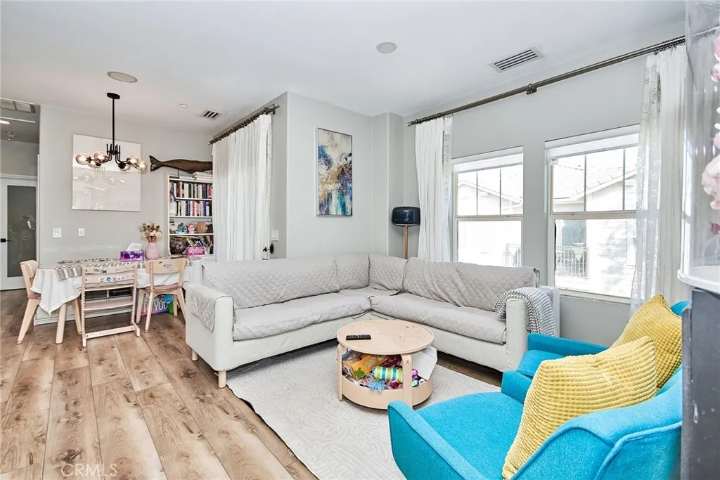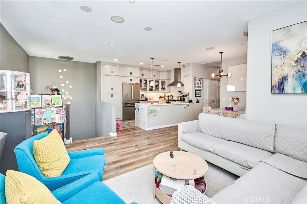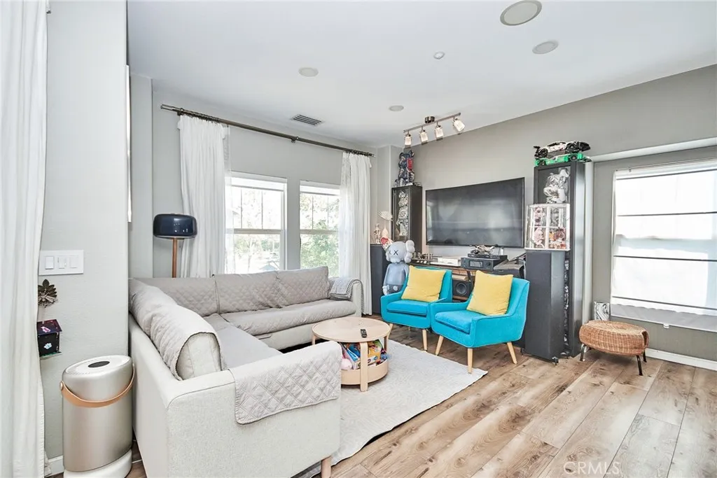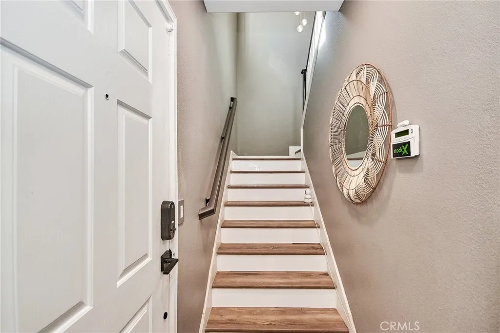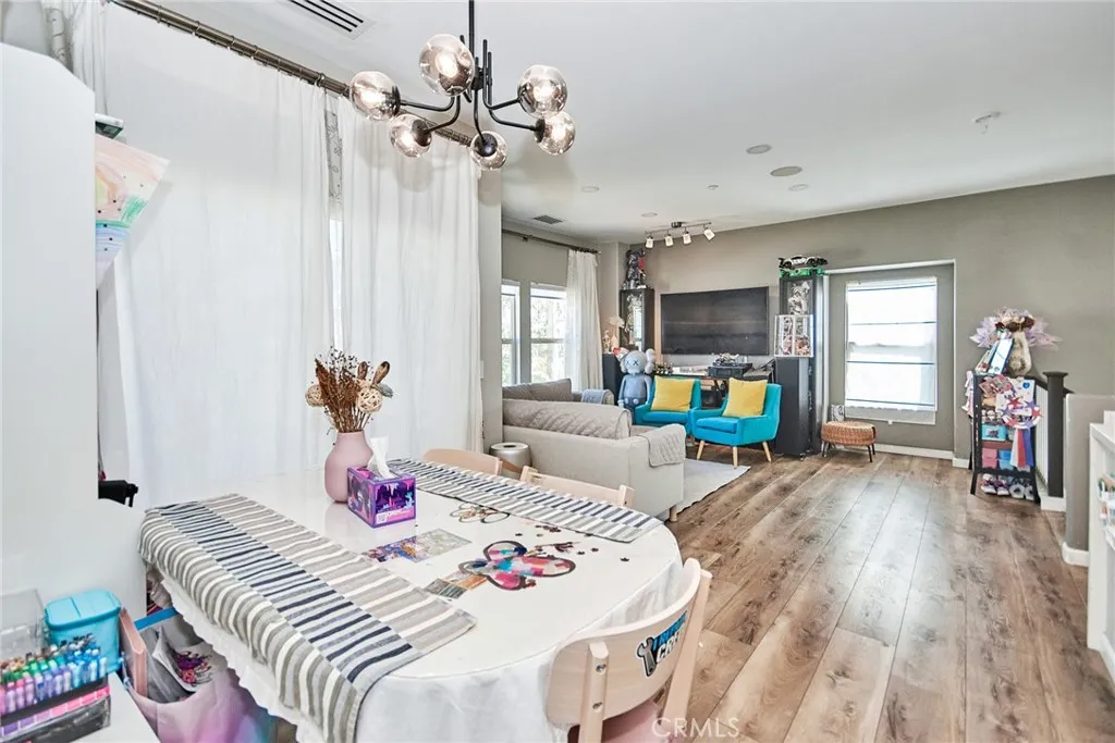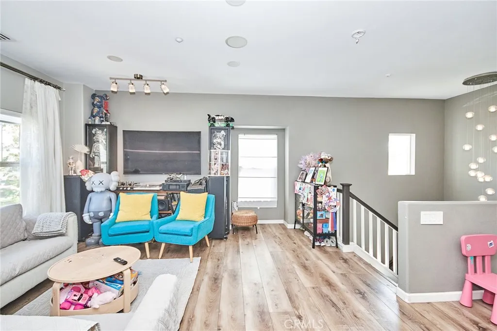 Price REDUCTION! Discover the epitome of modern living in this exquisite corner unit within Rancho Cucamonga's prestigious Brighton at Etiwanda community. This thoughtfully upgraded 2-bedroom, 1-bath residence boasts an open-concept layout with soaring ceilings, where all living spaces are conveniently situated upstairs for enhanced privacy. The contemporary kitchen stands out with its self-closing cabinets, premium quartz countertops, stainless steel appliances, and generous pantryideal for everyday meals or hosting gatherings. Adjacent, the dining area features a chic light fixture and seamlessly connects to the living room, bathed in natural light from expansive windows. Step out from the living space or the master bedroom onto one of two private balconies, perfect for morning coffee or evening unwinding. The master suite offers a spacious walk-in closet, direct balcony access, and an en-suite bath with dual sinks, modern cabinetry, quartz vanity, and a walk-in shower. Throughout the home, durable wood-look waterproof luxury vinyl flooring adds a touch of elegance, complemented by a convenient indoor laundry area for full-sized appliances. Additional highlights include a large attached 2-car garage with direct access and extra storage, plus recent remodels in the kitchen and bath. Community perks abound with low HOA dues covering water, along with access to a resort-style pool, spa, outdoor showers, BBQ and picnic areas, and a playground. Ideally positioned just moments from Victoria Gardens for upscale shopping, dining, and entertainment, and with seamless connectivity
