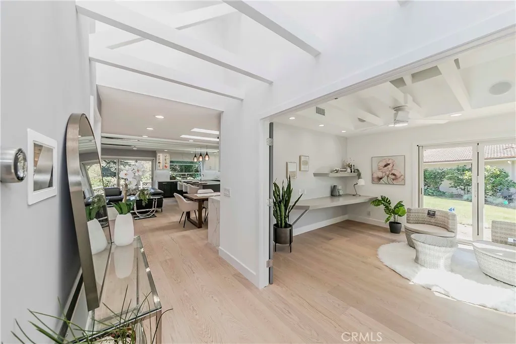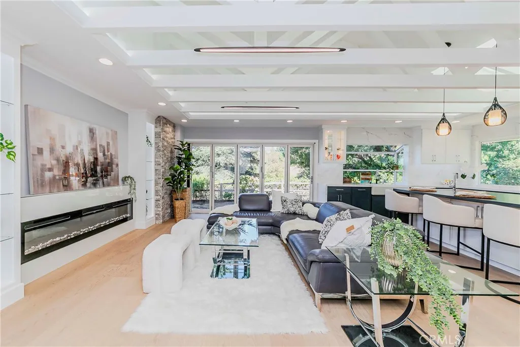 Experience this one-of-a-kind gem in the highly desirable 55+ community of Laguna Woods Village. Thoughtfully and extensively renovated, this exceptional custom home blends timeless design with modern livability. Situated on a quiet street, this detached residence offers over 2,200 sq. ft. of luxury living space, a spacious two-car garage, and elegant architectural details enhanced by high-end designer finishes. The expansive floor plan features 4 bedrooms and 3.5 baths, including three private bedroom suiteseach with its own bathroomfor ultimate comfort and convenience. The fourth bedroom offers flexible use as an office or den. At the heart of the home, the gourmet kitchen impresses with stainless steel appliances, a large quartz island, a garden window, abundant cabinetry, and a walk-in pantry. The open-concept living room is a showpiece, complete with a sleek LED fireplace, illuminated glass shelving, and an integrated sound system with ceiling speakers throughout. Natural light floods the interiors through remote-controlled skylights, Solatubes, and dramatic folding doors in the living room and bedrooms. These doors open to a private patio with breathtaking mountain viewsideal for seamless indoor-outdoor living. Additional highlights include a dedicated laundry area for everyday convenience. This rare offering is located within Laguna Woods Village, a premier guard-gated 55+ community featuring 27 holes of golf, 2 fitness centers, 7 clubhouses, 5 swimming pools, over 250 clubs, and just minutes from Laguna Beach. Dont miss the chance to own one of the Villages most pre