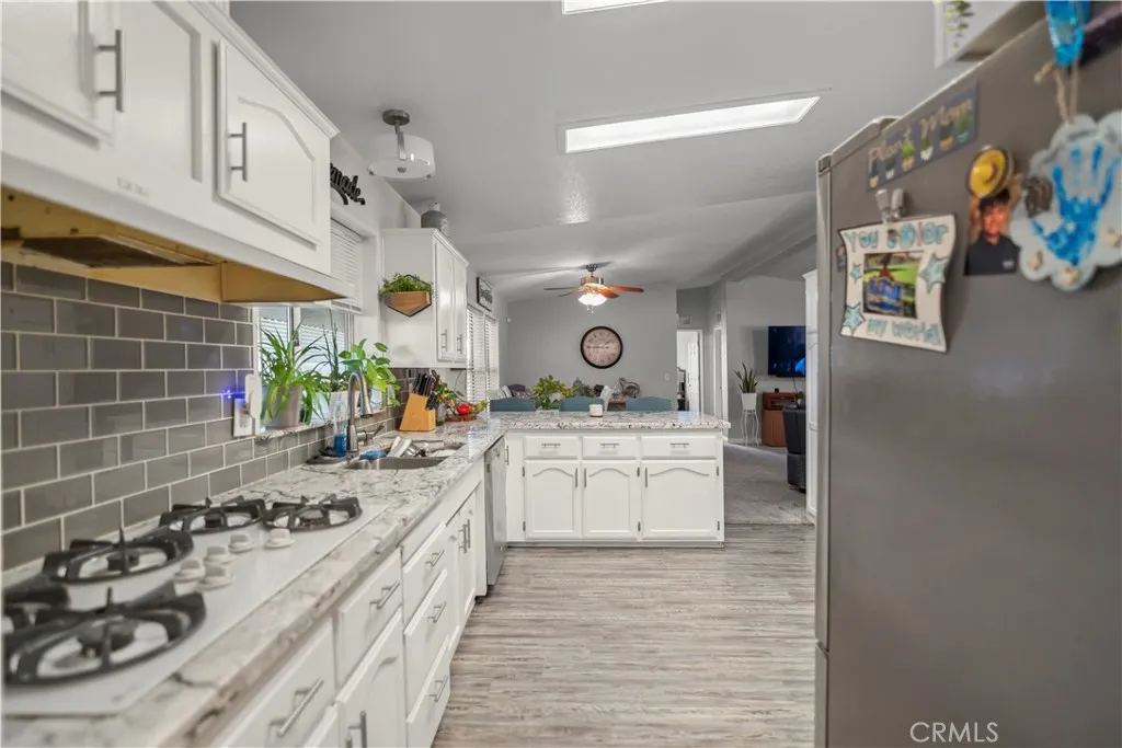 Spacious and beautifully maintained 3-bedroom, 2-bath manufactured home in the desirable 55+ West Hills Mobile Home Park, conveniently located near Highway 99. This home features an open-concept floor plan with a large living area, modern kitchen with granite countertops, white cabinets, and stainless steel appliances. The primary suite offers a soaking tub, walk-in shower, and dual sinks. Enjoy relaxing on the covered patio surrounded by lush greenery or the cozy front porch. Updated flooring, bright natural light, and thoughtful details throughout make this home move-in ready. Community offers a peaceful setting close to shopping, dining, and schools.