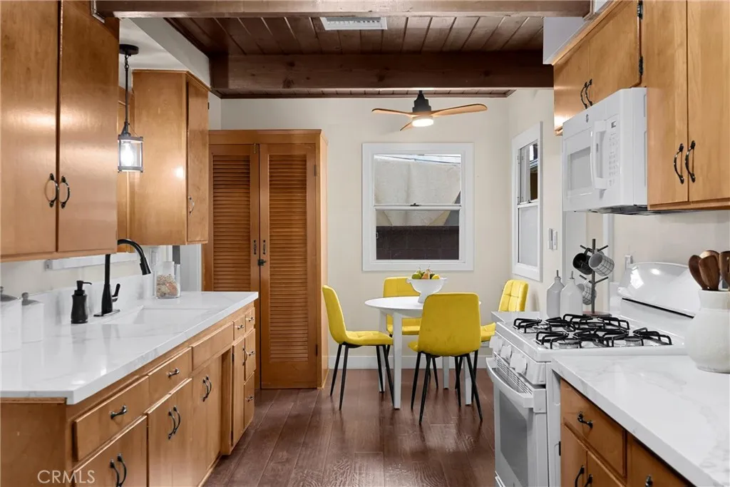Welcome home to 18018 E Ghent St! Thoughtfully remodeled 4-bedroom, 2-bath residence located in the serene cul-de-sac neighborhood of Azusa. Built in 1954 and recently refreshed to its original charm! Upon arrival, youll notice the classic mid-century exterior. Step inside to discover open wood-beam ceilings and abundant natural light, creating a warm yet airy ambiance. The heart of the home is the remodeled kitchen featuring quartz countertops, a new sink, rustic lighting, new stainless appliances, and refinished wood cabinets that celebrate their original character. An expansive great room adjoining the kitchen serves as a flexible space for family gatherings, game nights, or a cozy media zone. The four bedrooms are all well-sized, including a master suite with its own full bath. New flooring, ceiling fans in every room, updated windows, and refinished doors emphasize the homes turn-key appeal. Outside, enjoy your private backyard with a grassy lawn, patio deck, and large storage shed. A two-car attached garage rounds out the convenient features. This home masterfully blends original mid-century charm with modern amenitiesan ideal option for families or buyers seeking a move-in ready residence in a welcoming neighborhood.