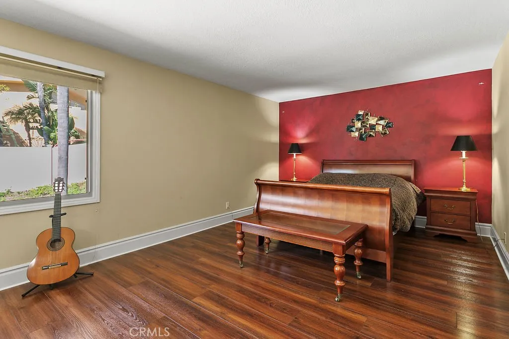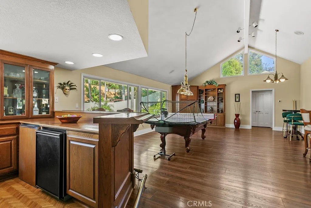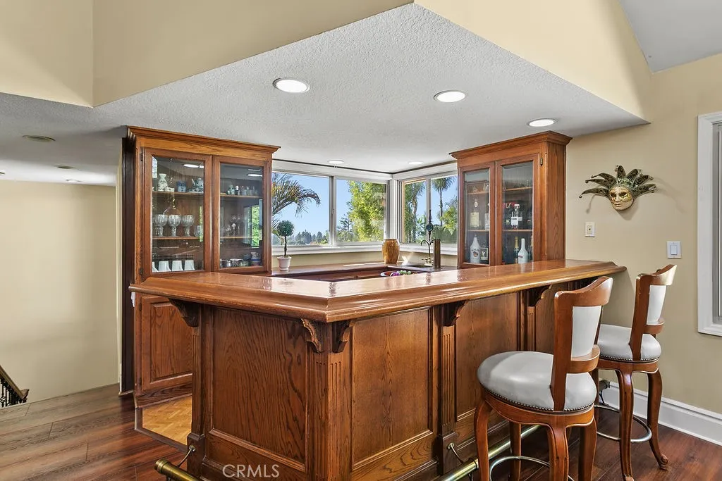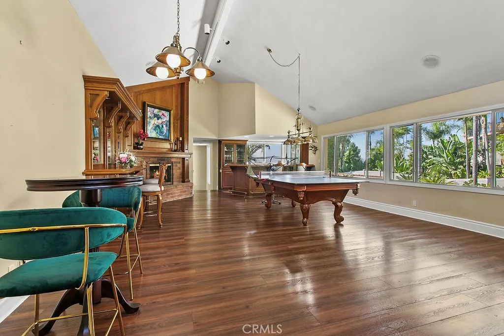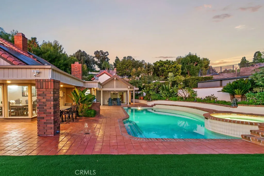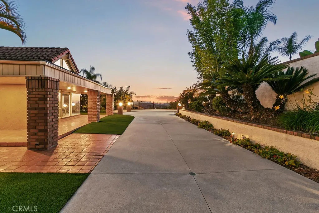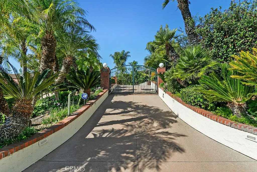 This serene and tranquil Villa Park lux estate enjoys one of the most unique and exclusive locations available on the market today. Tucked away in Villa Parks rolling hills, this expansive 5362 square foot gem boasts a true cul-de-sac location, complete with gated entry. The mix of mid-century modern style and extremely private location gives this estate a feeling reminiscent of the historic Hollywood Hills. Enter through the automated privacy gate into lush grounds with mature landscape, drought tolerant turf and ample on-site parking. Glass inlaid double doors give way to a spacious and inviting entry. Travertine floors, floor to ceiling windows, and crisp architectural lines set the tone for this elegantly finished estate. The living room boasts soaring ceilings, corner fireplace, custom base, and clear pane elevated windows for lots of natural light. The dining room is spacious and expertly located between the kitchen and formal living room. With plenty of room for a 10-person dining set, this dining room is perfect for quiet family nights or those busy holiday events. The kitchen is for the culinary enthusiast, complete with high end Thermador appliances, Sub Zero Fridge, double ovens, 6 burner gas range w/ hood, granite counters, stain grade custom cabinets, and an open ceiling concept. The family room is open and kitchen adjacent giving a great room concept feel and lends itself perfectly to family gatherings and entertainment. The primary bedroom feels open and awash with light due to the cathedral ceilings and corner window set complete with views of the beautiful