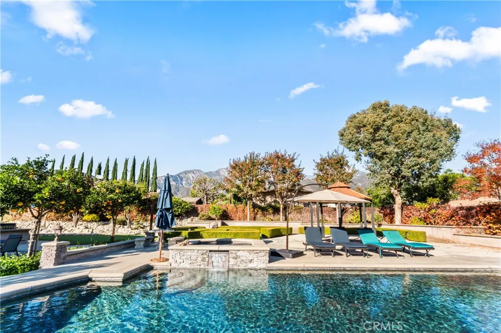 Nestled on a peaceful cul-de-sac within the sought-after equestrian community of Alta Loma, this beautifully maintained residence is perfect for both the weekend warrior and the frequent entertainer. Immaculate inside and out, this home exudes pride of ownership at every turn. The front yard is a showpiece of curb appeal with lush mature trees, meticulous landscaping, and bold masonry accents of rock, slate, and stone. Wooded side gates open to a private backyard retreat that truly feels like your own resort oasis. Enjoy RV parking, four storage sheds, a massive gable-style covered patio, gazebo, and wood arbor trellisideal for entertaining or even hosting special events. The outdoor amenities continue with a Pebble Tec saltwater pool and spa, outdoor fireplace, putting green, and winding hardscape walkways surrounded by block wall fencing. Theres even space to build a two-horse stable with direct access to the communitys bridle paths leading to Heritage Park Equestrian Center. Inside, the grand dual-door entry opens to a spacious foyer and wood-accented staircase. The formal living room and expansive family room flow seamlessly into the kitchen and dining area, offering stunning views of the backyard oasis. Highlights include recessed lighting, a wood-burning fireplace with a grand hearth, and flexible living spaces with 5 bedrooms (or 4 plus a dedicated office, conveniently located downstairs with access to the putting green). The upstairs bathroom also has a jacuzzi tub and tile upgrades. The chefs kitchen features stainless steel appliances, a six-burner cooktop, dual o