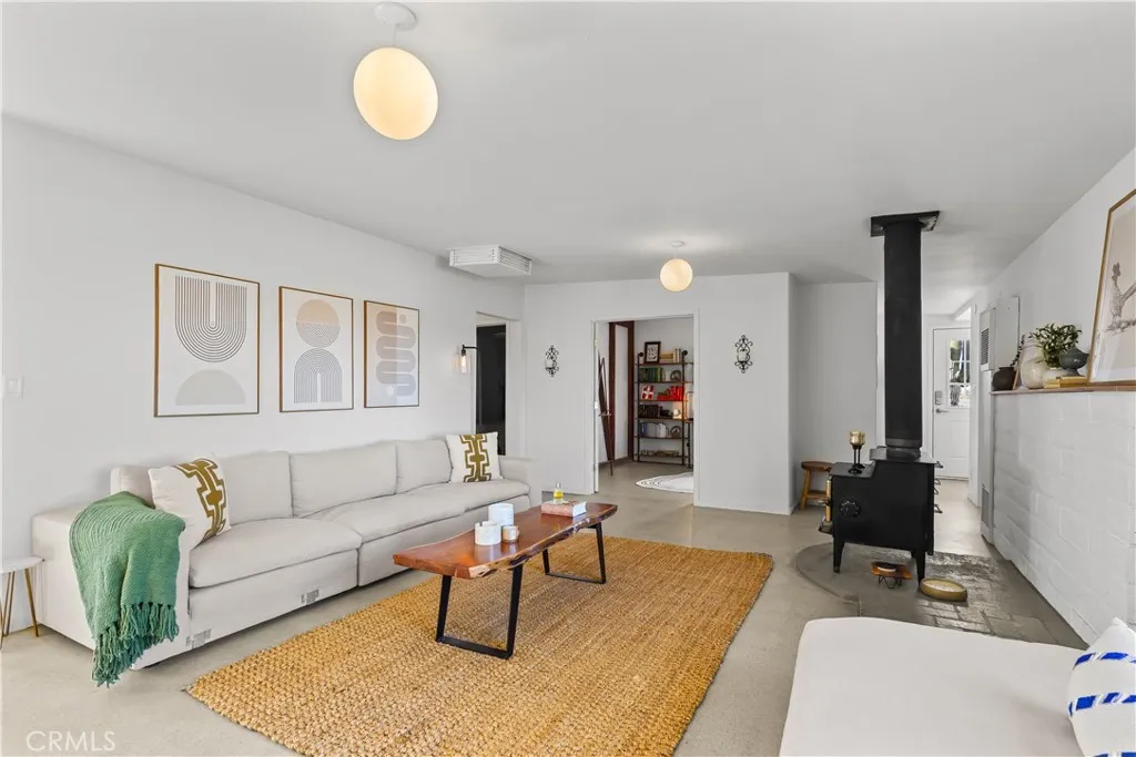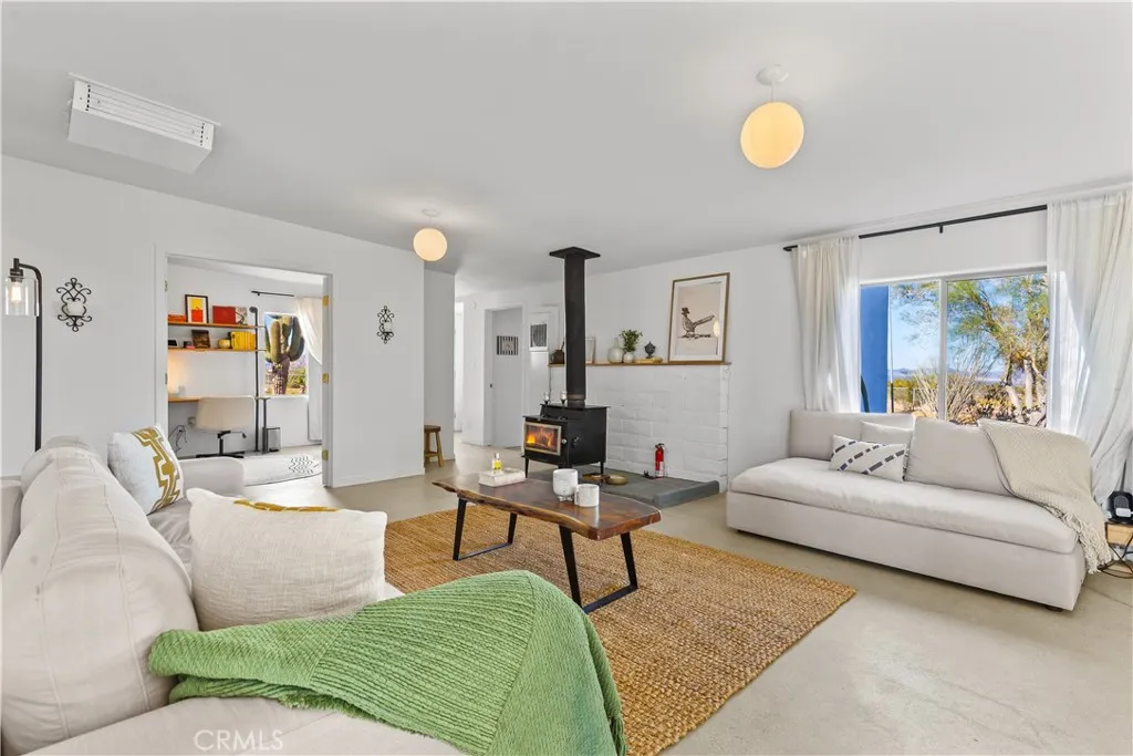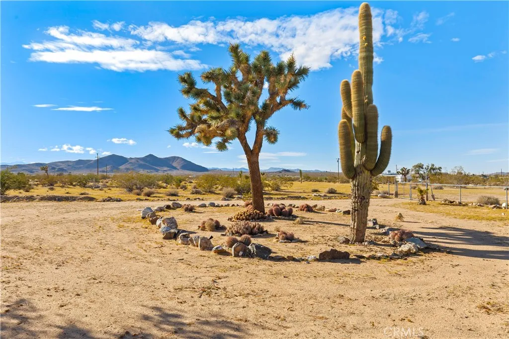 Escape to 5 private acres where desert magic meets mid-century charm. This 1956 home blends vintage character with modern comfort - polished concrete floors with stunning aggregate detail, a cozy wood-burning fireplace, and brand new ductless heating and cooling for year-round comfort. The home's open floor plan connects living and dining spaces flooded with natural light. Three bedrooms capture gorgeous afternoon sun, while the primary suite features a walk-in closet. French doors open to a versatile third room - perfect home office or creative space. The huge 770+ sq ft garage offers many possibilities - in fact, the original owner built a private airplane inside. Whether you envision a workshop, art studio, or conversion to an ADU, you're looking at over 2,200 sq ft of potential. Two detached storage sheds provide ample room for all your desert toys and equipment. Your 5 acres showcase the desert's natural beauty. Two giant saguaro cacti (decades old) stand alongside a majestic Joshua Tree all in your front yard - treasures rarely found in private yards, even in the desert - while ocotillo, barrel cactus, and fan palms create layers of desert texture. Every sunset paints the sky electric. Every clear night offers an out-of-this-world view of the stars. The privacy and tranquility of this property make it an ideal desert retreat or full-time residence.