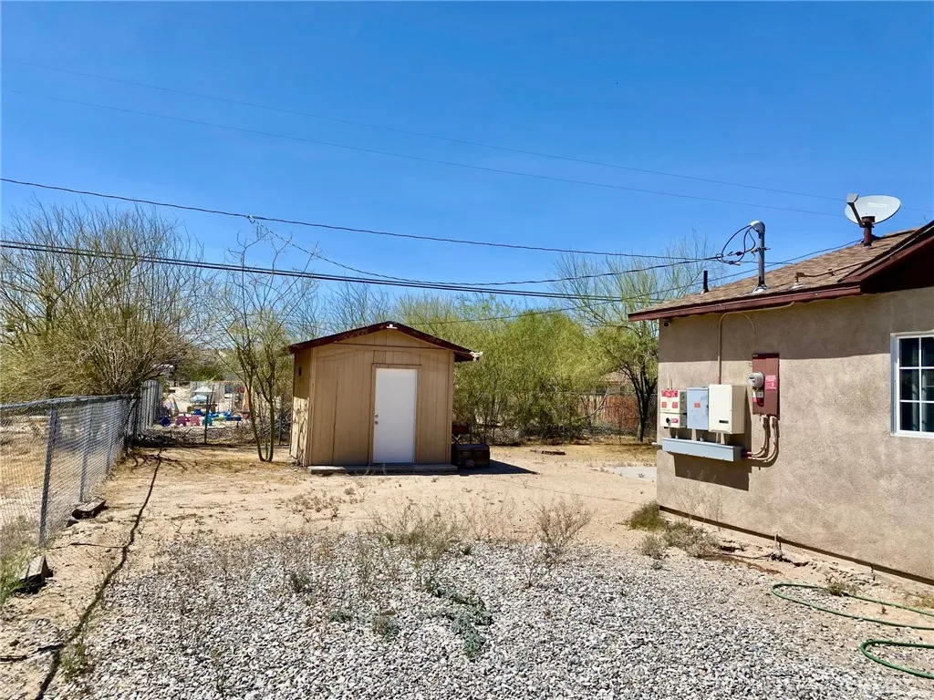 Well-located and functional, this 2-bedroom, 2-bath property has over 1000 sq ft of living space and sits on a fully chain-link fenced lot. large, flat yardideal for outdoor living, pets, or future projects. Tile floors throughout and recessed lighting. The large kitchen is equipped with granite countertops, dark cabinets, freestanding gas stove, and attached microwave. A convenient interior laundry closet right off of the kitchen. Huge master bedroom has recessed lighting and an attached master bath. A backyard shed provides additional storage or workspace. Conveniently located close to Highway 62, this property also features leased solar already installed for added energy efficiency. Current lease is $109/month buyer to take over contract. Current lease is paying for monthly electricity usage. A solid opportunity with a large, flat lot and great potential.