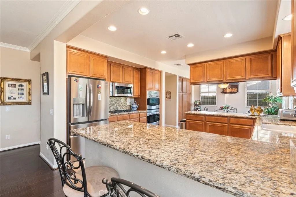 Price Improvement!!! Beautifully upgraded home in the Murrieta Country Roads neighborhood, adjacent to Spencers Crossing. This stunning property features extensive hardscape, including a charming front-yard courtyard that creates exceptional curb appeal. The home offers five bedrooms, including a desirable downstairs bedroom highlighted by a gorgeous metal double-door entry. Soaring vaulted ceilings, plantation shutters, and elegant crown molding add to the homes refined style. A grand double staircase welcomes you from the formal living room and leads upstairs. The main level features wood and tile flooring, while the upstairs bedrooms are comfortably carpeted. In addition to the formal living and dining rooms, the home boasts a spacious family room and a bright breakfast nook. The chefs kitchen offers abundant counter space, granite countertops, stainless steel appliances, double ovens, and a five-burner cooktop, making it ideal for both everyday living and entertaining. The backyard is set up for entertaining with tropicals, built in BBQ and island and extensive hardscape. Easy care yard! This home also has: 4 Car Garage.