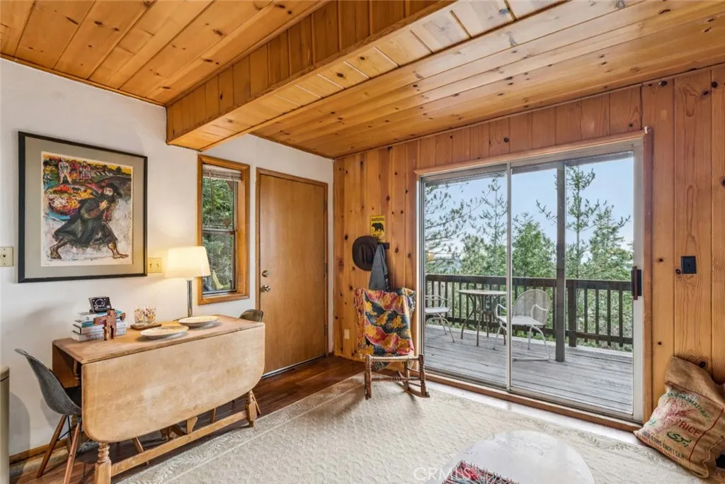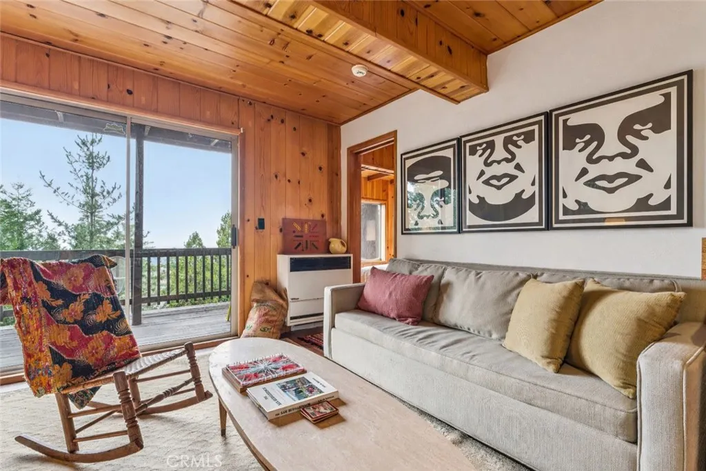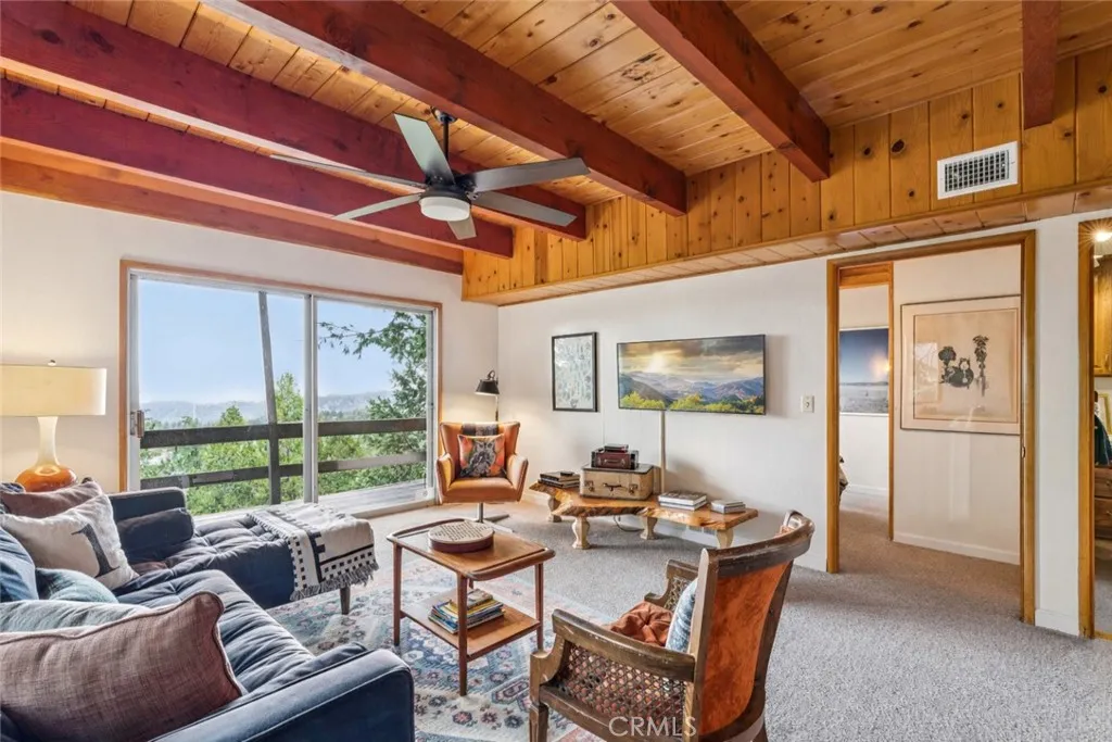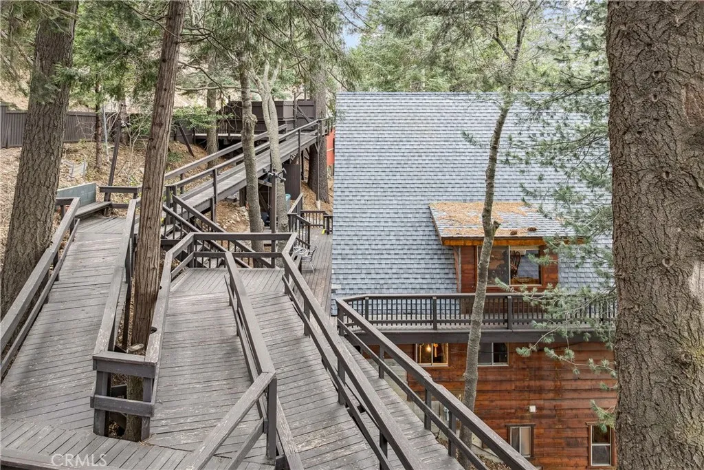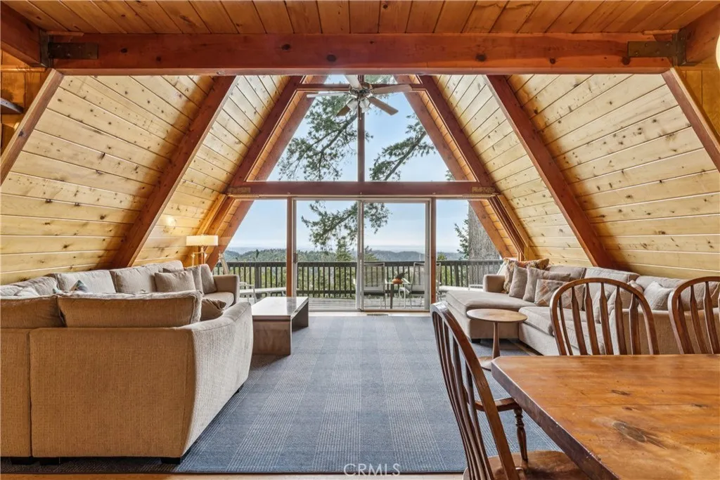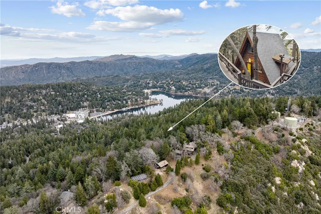 Cabin in the Sky is a one-of-a-kind custom mid-century A-frame cabin perched above the treetops, offering spectacular panoramic views and successful short-term rental history. This unique mountain retreat features 3 bedrooms and 3 bathrooms, including a separate apartment ideal for guests or rental flexibility. Set on three lots, the property offers multiple outdoor entertaining spaces, expansive view decks, and a private hot tub for year-round enjoyment. Vaulted A-frame ceilings and large picture windows fill the home with natural light and showcase breathtaking mountain and valley views. The thoughtful layout maximizes both privacy and functionality. Additional highlights include level entry access and parking deck for three cars. A rare combination of architectural character, income potential, and stunning views, perfect as a full-time residence, weekend escape, or continued STR investment. A truly unique architectural gem. Conveniently located close to Crestline amenities, Lake Gregory, dining, and recreation 90 minutes from Los Angeles. Cabin in the Sky is a true mountain original offering elevated mountain living with unforgettable views, mid-century character, and versatile living spaces- where timeless design meets unforgettable scenery. A one-of-a-kind opportunity. Come experience it.
