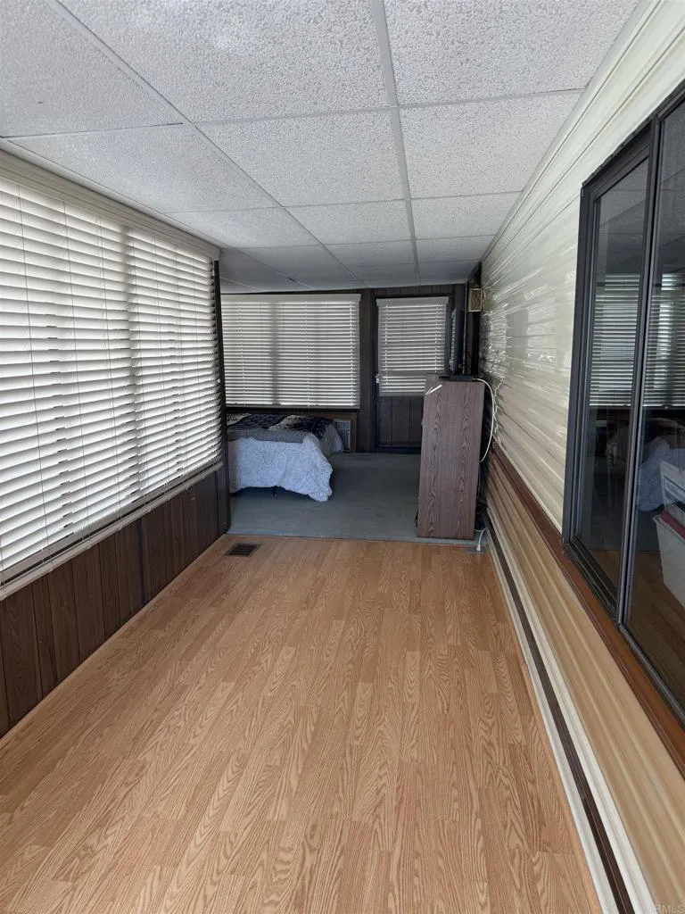 Welcome to beautiful, resort-style tiny house living in the highly sought-after Desert Shadows RV Resortwhere you own the land and enjoy NO space rent! This charming 1 bedroom, 1 bathroom home features a rear brick patio, storage shed, and attached carport. The bedroom offers a ceiling fan and mirrored closet doors. The kitchen is equipped with ceramic tile countertops, wood cabinetry, refrigerator, stove/oven, and microwave. The living room showcases a custom wooden leaf ceiling fan, adding unique character. An enclosed porch provides additional living space, with laminate flooring that continues through the kitchen and dining area. The home features all copper plumbing with a lifetime guarantee. Desert Shadows is an amenity-rich, gated community offering 6 pools (including a large lap pool), a fully equipped fitness center, library with WiFi and broadband, two well-maintained clubhouses, indoor shuffleboard pavilion, tennis courts, a 16,000-square-foot ballroom, card and hobby rooms, putting green, and picnic areas. HOA dues include landscaping, recycling, water, sewer, and cable. Ideally located just minutes from Palm Springs, Palm Desert, Rancho Mirage, and all other Coachella Valley citiesthis is the perfect seasonal desert retreat.