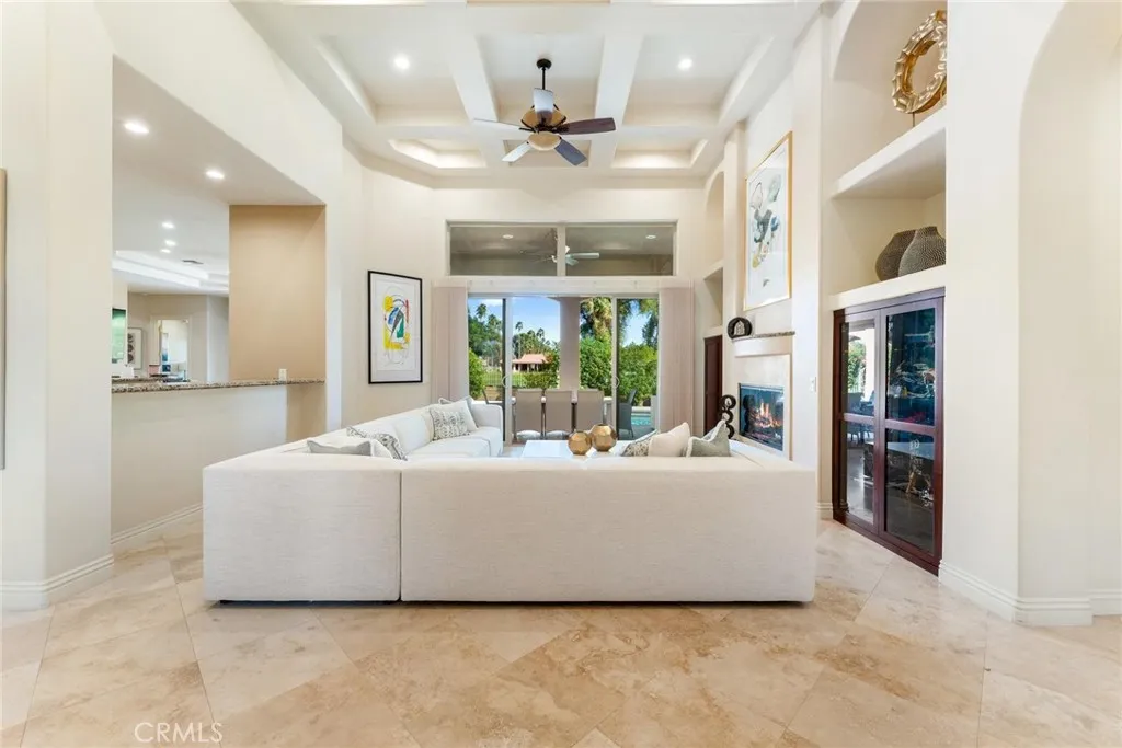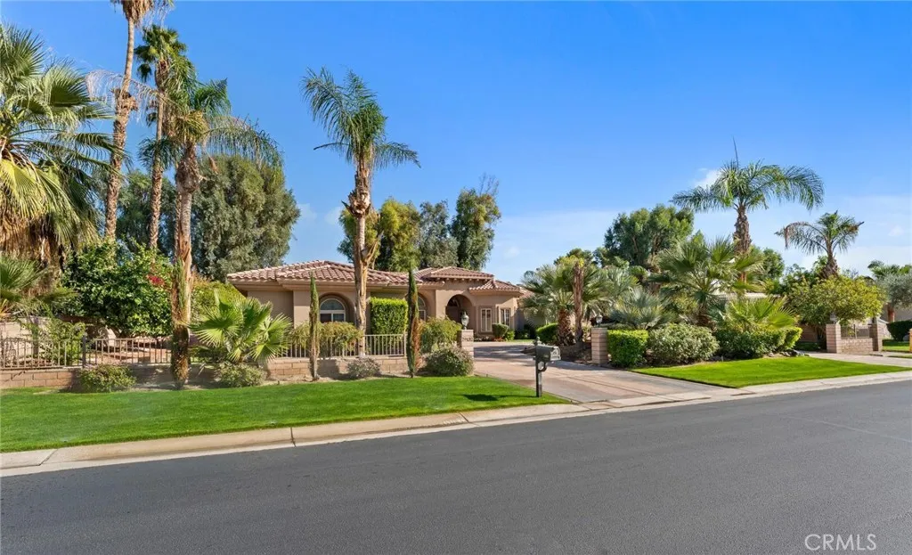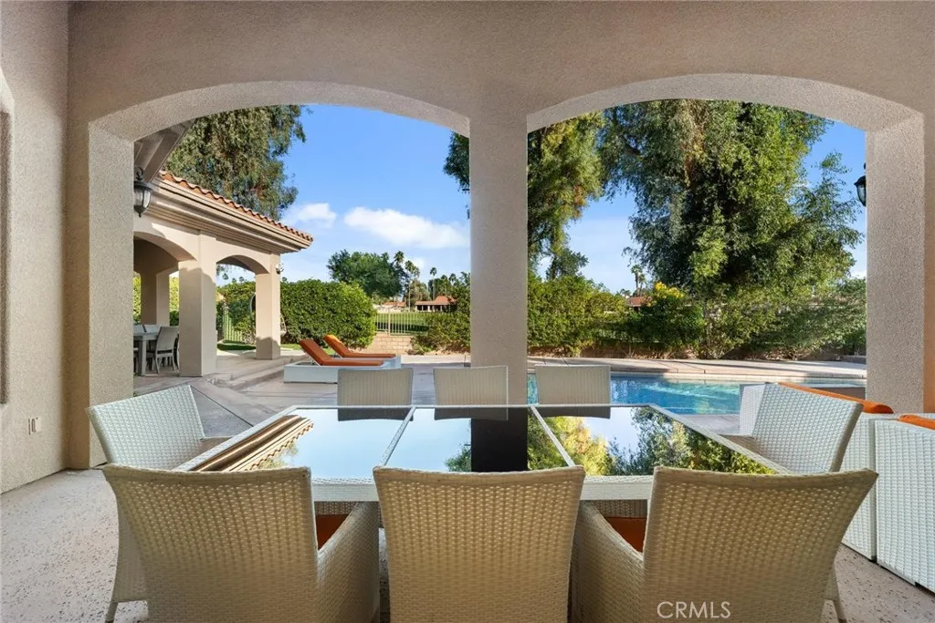 Set along the 13th fairway of Bermuda Dunes Country Club, this custom-built residence offers an exceptional blend of space, privacy, and timeless design. Built in 2006 and thoughtfully finished throughout, the home showcases quality craftsmanship with extensive travertine flooring, granite surfaces, and refined architectural details. The primary suite is a private retreat, featuring a separate sitting or fitness area with serene views of the pool and golf course. The en-suite bath includes a jetted soaking tub, oversized walk-in shower with Kohler body jets, and two spacious walk-in closets. Three additional bedrooms are complemented by a media room, great room, family room, and game roomproviding remarkable flexibility for living, working, and entertaining. At the center of the home is a well-appointed kitchen that opens seamlessly to the surrounding living spaces. It features stainless steel appliances, slab granite countertops, and an oversized walk-in pantry, making it both functional and inviting. Beamed and coffered ceilings, along with expansive walls of glass, create a bright, open atmosphere and a strong connection to the outdoors. Situated on an approximately one-thirdacre lot, the backyard is designed for relaxation and enjoyment, anchored by a saline Pebble Tech pool and spa with ample room for outdoor living. The HOA fee of $214 per month includes cable television with premium channels (Showtime and HBO), internet service, and 24-hour gated securityoffering outstanding value for a home of this caliber. This is a rare opportunity to own a spacious, custom home o