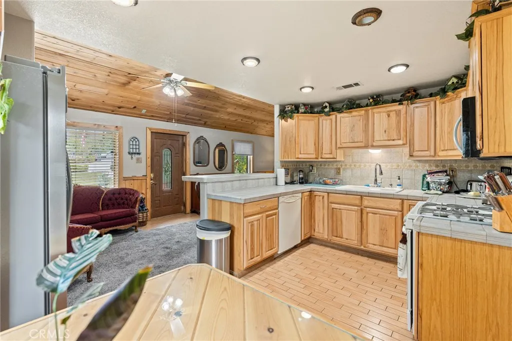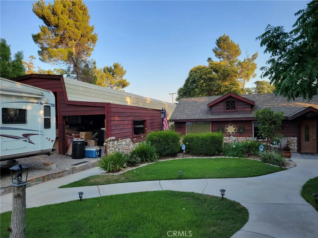 Tucked away on a private street in the desirable Cherry Valley area, this truly rare and unique property feels like your own mountain retreat, one you must see to fully appreciate! This 3-bedroom, 2-bath home (bonus room currently used as a third bedroom) features a rustic aesthetic with natural cedar wood and stone throughout. The interior is defined by the rich warmth of cedar, showcased across vaulted ceilings and hand-crafted framing that carries through the entire floor plan. At the heart of the open living space is a cozy central stone fireplace, creating the perfect gathering spot. The kitchen offers plenty of storage with a kitchenette, a deep pantry, and a separate dining area. A versatile back area with French doors provides an ideal space for a home office or family room, along with the convenience of an indoor laundry area and full bath. Outside, the landscaping creates a year-round sanctuary with mature trees, fruit trees, and a tranquil koi pond complete with koi fish, all on a large lot of 21,780 sq ft. For those needing space, the property includes 53-foot and 40-foot storage trailers for secure, weatherproof storage, one equipped with electric and water connections, plus an oversized RV carport metal building ready for all your storage and recreational needs. This is a rare opportunity at an affordable price, dont miss it!