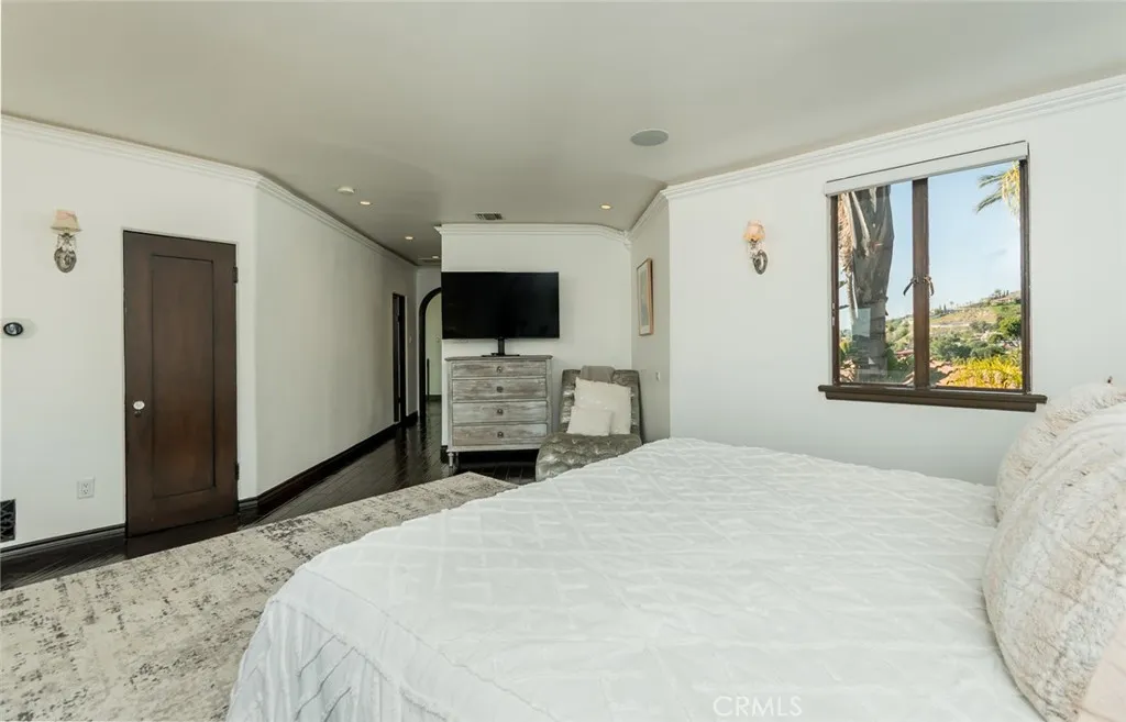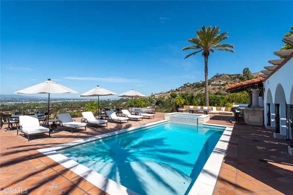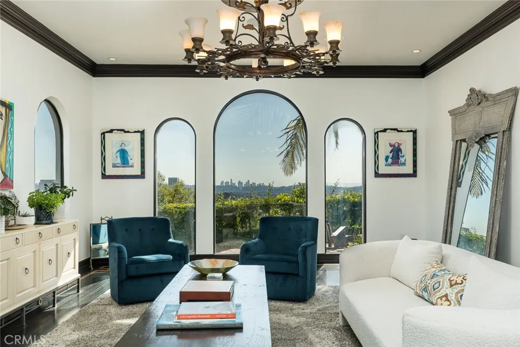 Perched above historic Verdugo Viejo, Lorelei is a rare and commanding Spanish Revival estate offering timeless architecture, exceptional privacy, and sweeping panoramic views stretching from downtown Los Angeles across Glendale and Burbank to the San Gabriel Mountainsand, on clear days, the Pacific Ocean. Originally constructed in 1929 by renowned architect Peter Damm, the main residence spans approximately 7,700 square feet and is thoughtfully designed to honor its historic character while accommodating modern living. A grand gated courtyard with hand-painted Spanish tile and a tranquil fountain sets an unforgettable arrival. Inside, arched doorways, Venetian plaster walls, trellis-pattern marble floors, and rich hardwoods define the homes authentic craftsmanship. The formal living room is anchored by dramatic windows framing the skyline, while the adjacent family room features an original hand-carved stone fireplace. Entertaining spaces flow effortlessly into a refined formal dining area and a sunlit gourmet kitchen equipped with high-end appliances, breakfast nook, and garden views. The primary suite is a private retreat with commanding vistas, balcony, walk-in closet, spa-inspired bath, and adjacent office or nursery. A private gym and dance studio, discreetly located below, completes the owners wing. The estate functions as a true compound, offering a spacious guest house with kitchen and living room, an additional pool house or office, and separate staff or guest accommodationsideal for extended stays or multigenerational living. Outdoors, lush multi-tiered grounds s