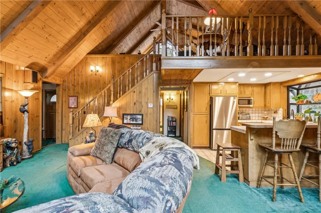 First Time on the Market! Offered by the original owner, this truly special custom-built prow-style mountain home is a rare opportunity with a special surprise. Surrounded by towering evergreens on a generous -acre lot, this one-of-a-kind retreat blends classic mountain architecture with unforgettable personality. The main level features 2 bedrooms and 1 bathroom, along with an open-concept floor plan that seamlessly connects the kitchen, dining area, and living room. Soaring ceilings and a dramatic wall of glass flood the space with natural light and frame the surrounding forest, leads directly to an expansive entertaining deck. Kitchen has updated appliances and counter seating. The primary suite loft offers a private elevated retreat overlooking the main living space offering has ductless AC. Adding even more artistic charm, select rooms showcase custom-painted wall murals created by a talented local artist, giving the home a unique sense of story and personality that complements its mountain setting. Home is perfect for gatherings, relaxing, and making lifelong memories. Downstairs, prepare for a surprise: a truly unique lower-level family room designed as a vintage 1950s diner, complete with authentic original pieces salvaged from a historic Los Angeles diner. Highlights include nostalgic counter and booth seating, a vintage Coca-Cola vending machine, and classic dcor that transports you to another era, an entertainers dream and a conversation piece like no other. With 3 bedrooms, 3 bathrooms, custom construction, and a setting that feels worlds away yet close to mount