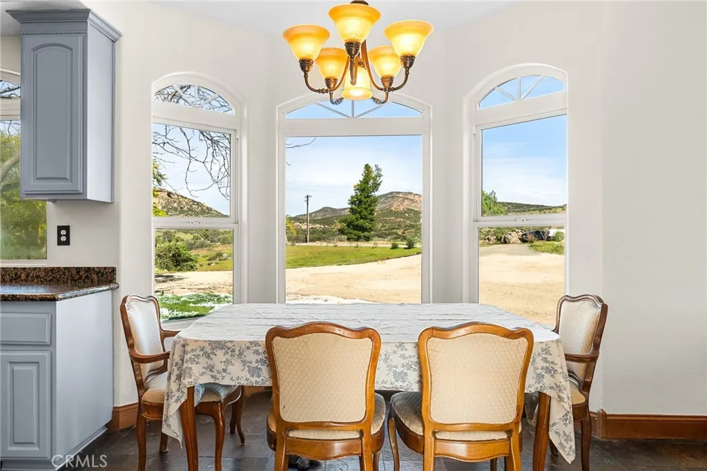 Experience serene country living in Temecula Wine Country at this stunning single-story ranch estate. Nestled within the Oakridge Ranches community, this custom-built home offers privacy, panoramic views, and refined indoor-outdoor living on nearly 10 acres of gently rolling hillside. Constructed to be view centric, each window and door is a portal to breathtaking valley and hillside views. Spanning 2,844 square feet, this thoughtfully designed residence features 4 spacious bedrooms and 2.5 bathrooms, with a functional single-level layout that unites the common areas and provides privacy for the bedroom wing. The kitchen is well appointed with stainless steel appliances, commercial range, double ovens, granite counter tops, and breakfast bar seating. Designed for unforgettable gatherings, the backyard is a true showpiece. The pool and attached pavilion are masterfully integrated into the natural hillside, creating an opulent resort-style experience while preserving the unobstructed panoramic views. At over 40 long, the pool offers dual baja steps, expansive stained decking, and a raised spa with a cascading waterfall. A swim up bar is adjacent to the attached pavilion. Soaring ceilings with exposed roughhewn lumber shade the outdoor kitchen, fireplace, bar, and entertainment areas. This outstanding build out can accommodate nearly any gathering or simply serve as a restful retreat to enjoy the sunset from. A fire pit lounge and multiple outdoor seating areas complete this private retreat. Additional highlights include a 4-car attached garage with ample space for toys and st