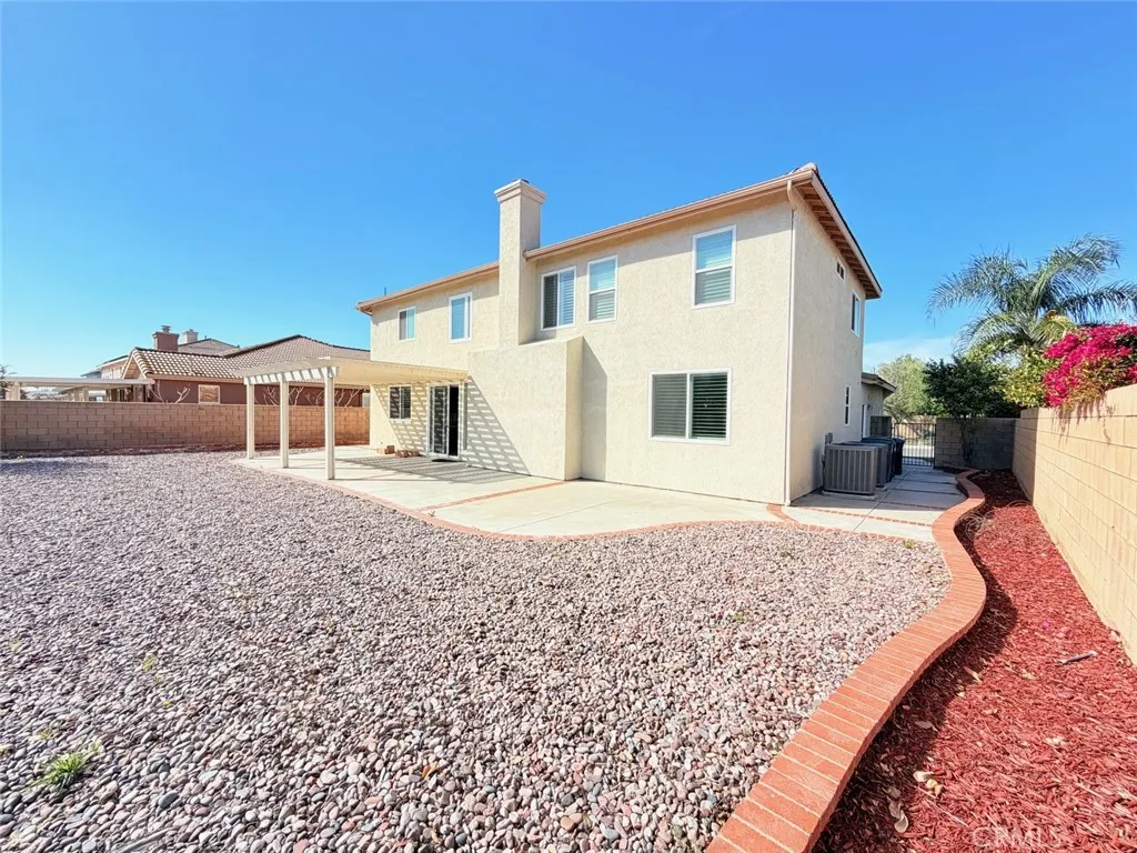 Welcome to this fully upgraded, move-in ready two-story home. It features 4 bedrooms and 3 bathrooms, Tiles floor on the main floor. Newer double-pane windows throughout the entire house with shutters, newer dual A/C units, a three-car garage with driveways, an artificial turf front yard with a rose garden, two side gates, and a drought-resistant pebble landscaping backyard with fruit trees. The home has a bright open floor layout with a formal living and dining space, high ceilings, and a patio door connecting to the backyard. The family room has a ceiling fan and a cozy fireplace. The spacious kitchen also features a large island, corian countertops, generous cabinets, a fridge, built-in stainless-steel microwave and oven, and a separate pantry for storage. It has a newer gas stove-top with Pacair range hood. The main floor has a generous-sized bedroom, a walk-in closet, and a full bath. It is perfect for guests and in-laws. An upgraded iron-wrought staircase leads you to the second level. It features the master bedroom with a tub and a separate shower, dual vanities, his and her walk-in closets. A Jack and Jill bathroom connects the second and third bedrooms. Vinyl floor planks throughout the upper bedrooms, with tiles throughout the high traffic area. A separate laundry room is also upstairs for convenience. Located in the heart of Eastvale, this home is close to Costco, 99 Ranch Market, Home Depot, restaurants, and is easily accessible from 15, 60, and 91 freeways.