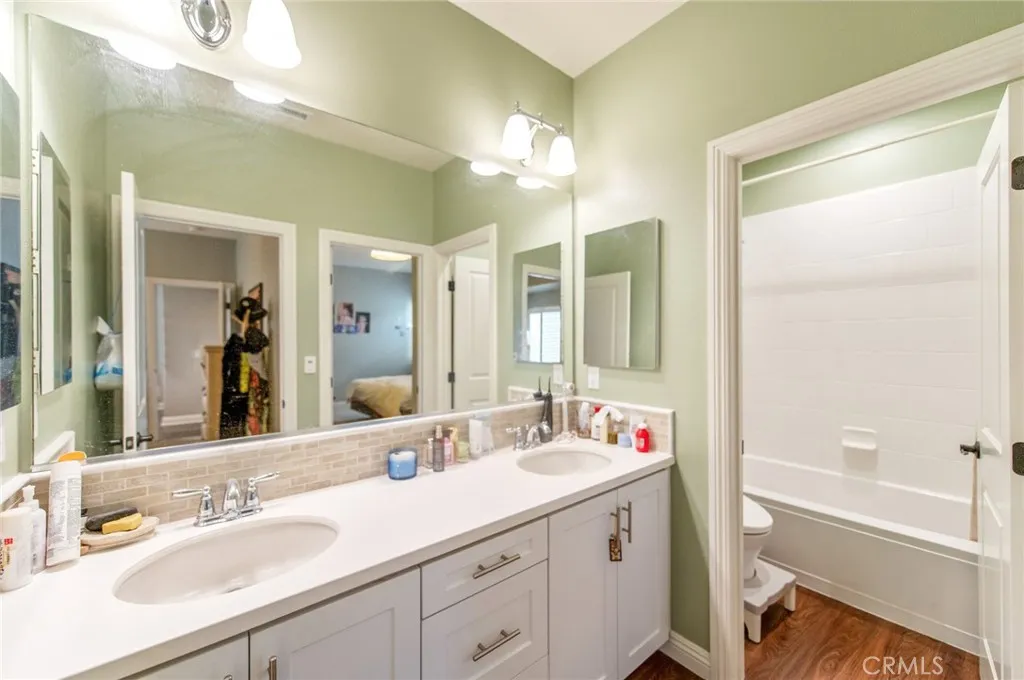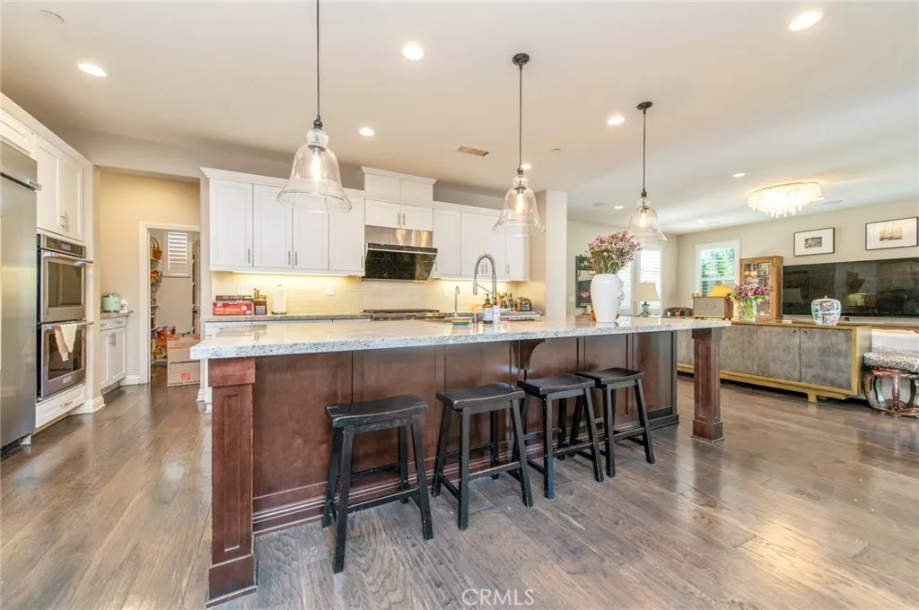 Welcome to modern luxury and versatile living in the highly sought-after Greenwood Community. This expansive residence captivates with a sun-drenched open floor plan designed for daily living and entertaining. The home is further elevated by custom plantation-style shutters throughout, offering a clean, modern aesthetic while enhancing privacy, light control, and long-term durability. The heart of the home is a true chefs kitchen, appointed with professional stainless steel appliances, rich espresso cabinetry, and exquisite Bianca Romano granite countertops. Seamlessly flowing from the great room, spectacular panoramic doors open to a covered outdoor space, blurring the lines between indoors and out to create the ultimate Southern California retreat. Step outside to a private, well-maintained backyard oasis designed for entertaining. This beautiful, low-maintenance courtyard features elegant stone tile hardscaping and is equipped for cookouts with a built-in barbecue island, stacked-stone detailing, and a custom wood pergola. Accentuated by fruit trees and tasteful landscaping, this serene space offers a sophisticated aesthetic without extensive upkeep. A highly desirable feature of this property is the flexible guest suite layout, including its own living area, kitchenette, private bedroom, and bathroom, making the home perfect for multi-generational living or accommodating guests with ease. Upstairs, the lavish primary suite serves as a tranquil sanctuary. Reflecting the premium upgrades found throughout the entire residence, the spa-inspired en-suite bath showcases high-