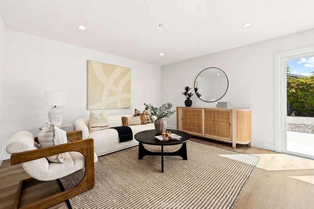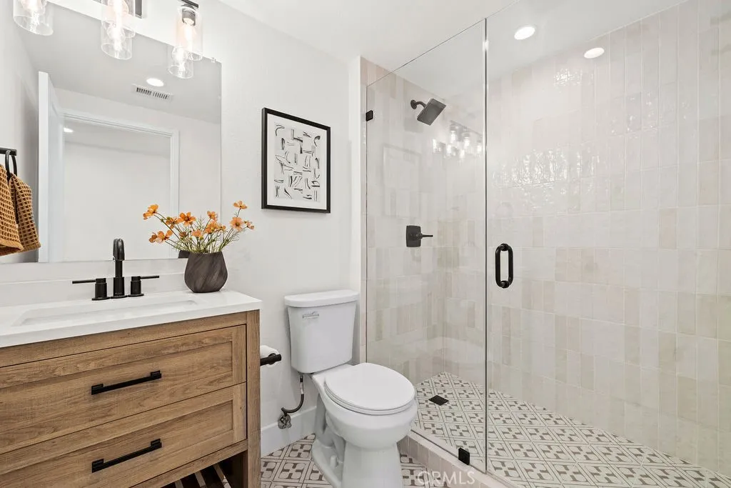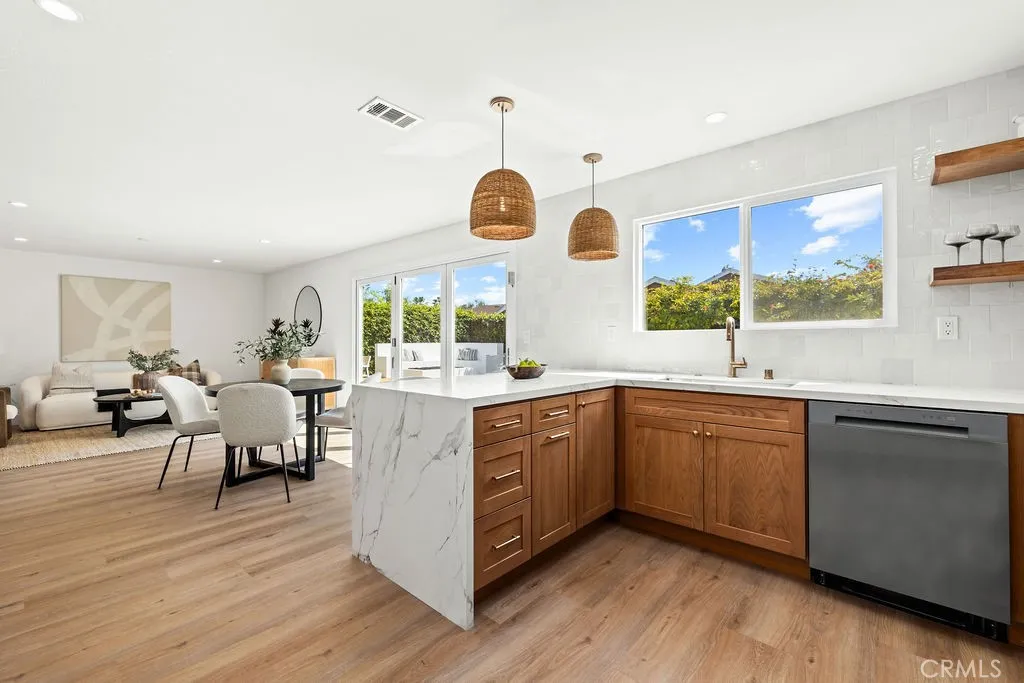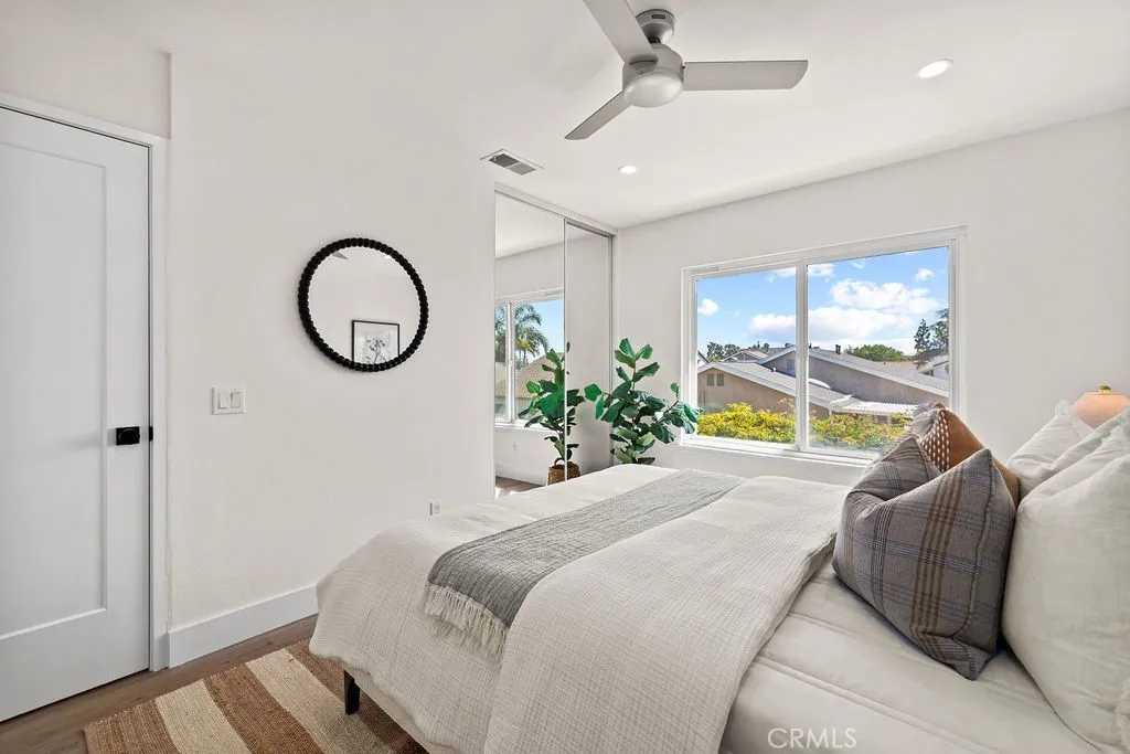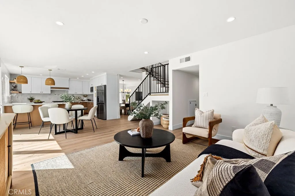 Tucked away on a quiet cul-de-sac in the highly desirable South Coast Metro area, this completely remodeled 5-bedroom, 3-bath residence offers approximately 2,400 square feet of thoughtfully designed living space, and is perfectly suited for comfortable everyday living. Step inside to a bright open-concept floor plan highlighted by luxury plank flooring, vaulted ceilings, and an abundance of natural light that fills the living room, accented by a cozy fireplace. The formal dining room features new French doors that open to the spacious wrap around yard, creating a seamless indoor-outdoor connection. The beautifully renovated kitchen has been redesigned with modern finishes, showcasing striking two-tone cabinetry, sleek quartz countertops, stainless steel appliances, designer fixtures, generous counter space and a functional layout making it as practical as it is stylish. The kitchen flows seamlessly into the adjacent family room, creating a warm and inviting space ideal for everyday use and effortless entertaining. Open the newly expanded sliding doors into your private backyard retreat, where the best of Southern California living comes to life. A sparkling in-ground pool invites you to cool off on warm summer afternoons, while the beautifully designed outdoor spaces create the perfect setting for entertaining. Gather with friends for poolside dining, or relax beside the oversized fire pit with built-in seating, the ideal spot for evening conversations and unforgettable nights under the stars. A main-level bedroom and full bathroom provide excellent flexibility for guests,