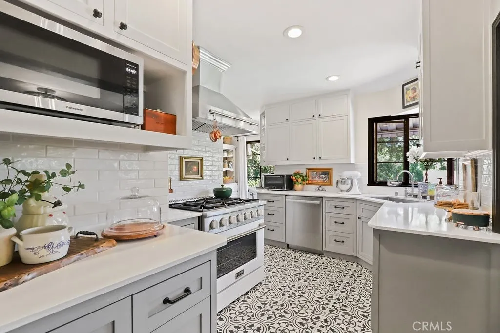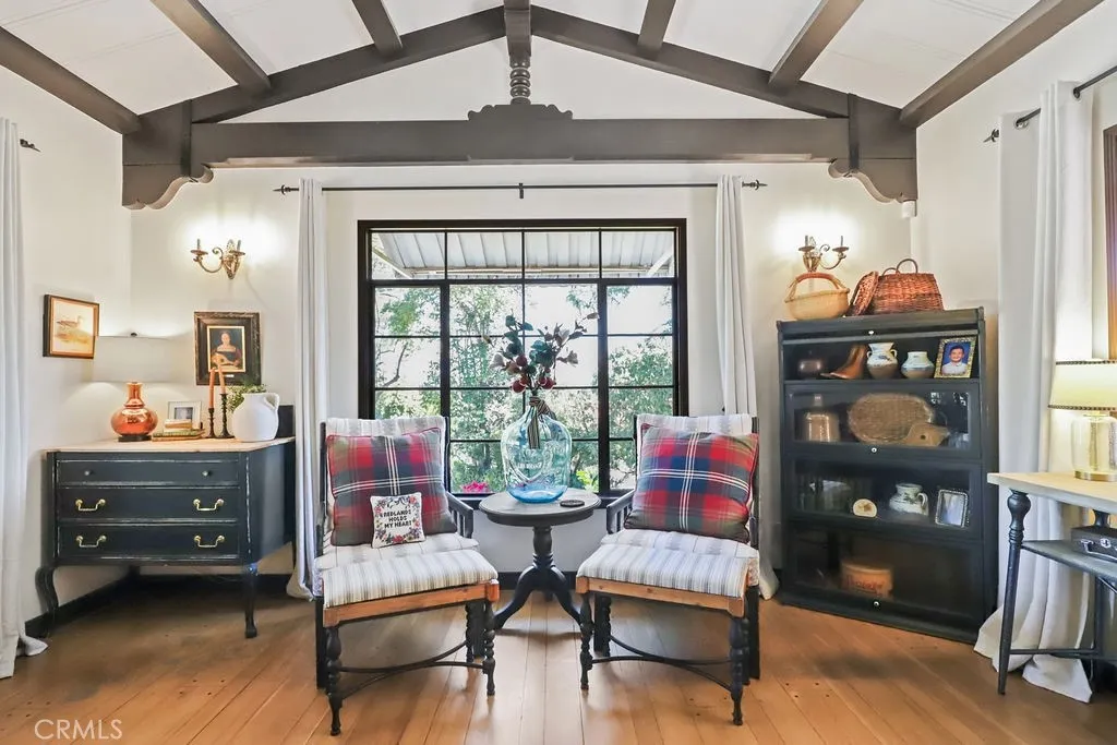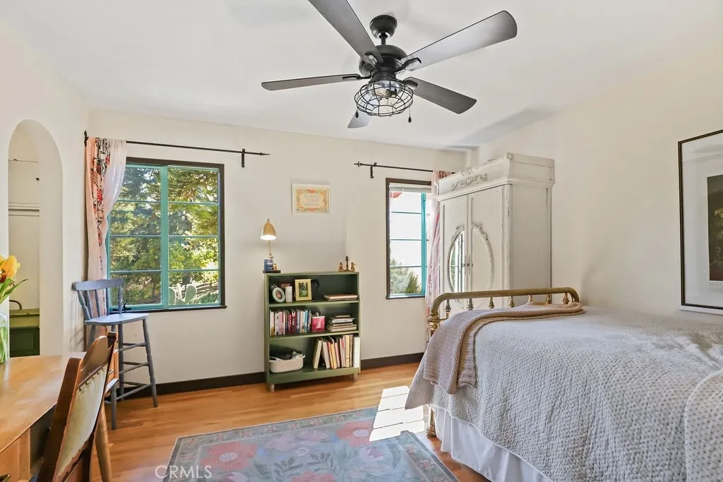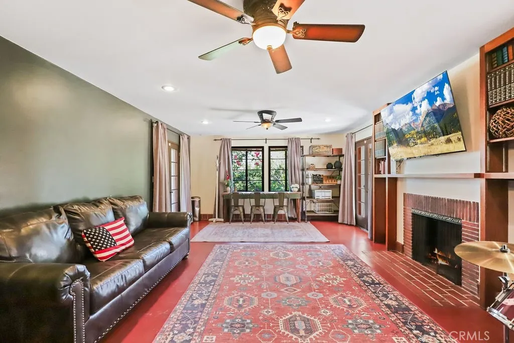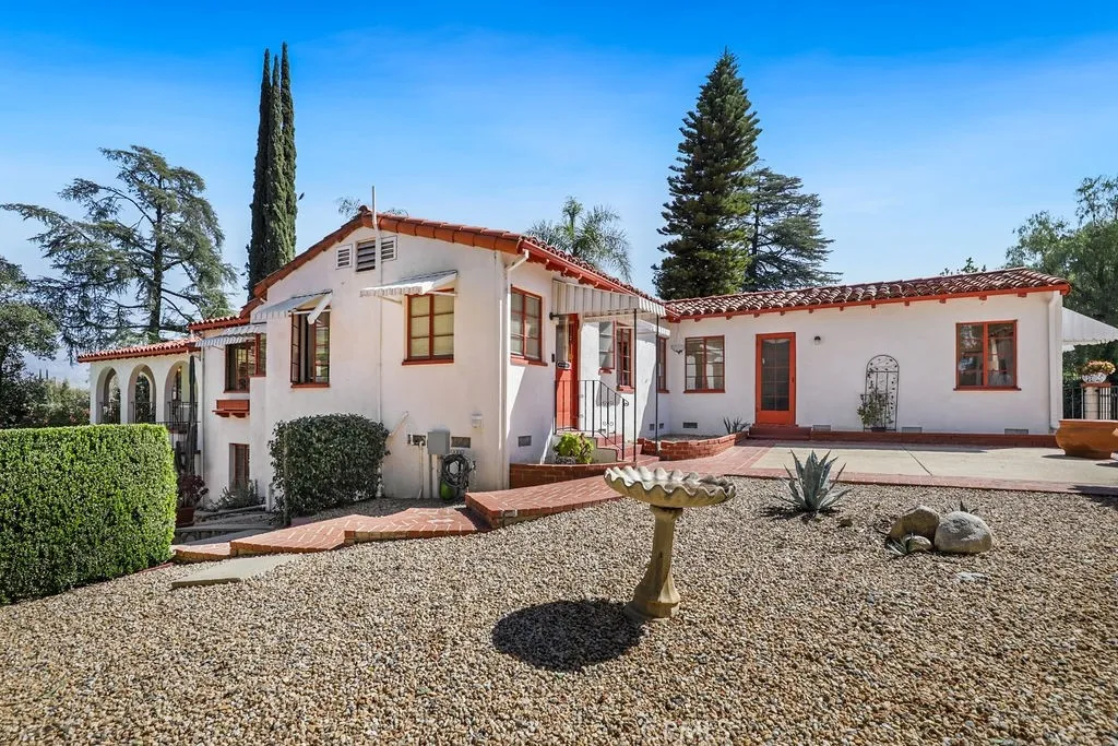 Rare opportunity to own a 1940 Spanish-style estate on approximately 1.25 acres in highly sought-after South Redlands, located just 0.6 miles from Redlands Country Club. Rich in architectural charm and character, this unique estate property with two bedroom guest house/2nd residence offers privacy, versatility, and timeless appeal. The main residence features four bedrooms and four bathrooms, including three bedrooms with direct bathroom access and a front office/study that could also serve as an additional bedroom. Hardwood floors highlight the formal living room with gas fireplace, with view and balcony off front and back. Elegant dining area. The lower level includes a spacious family room with fireplace and built-in storage, an additional bedroom with bathroom, and a former darkroom that could be converted into a kitchen for multigenerational, wine cellar, hobby room, or creative space. Outdoor living is ideal for entertaining with multiple private courtyards, a covered wood-beamed patio with built-in sink and fireplace, and a sparkling pool with separate changing rooms and a half bath. Mature fruit trees and winding garden paths create a peaceful park-like setting throughout the grounds. Adding exceptional value is a fully permitted detached second residence (ADU/guest house) completed in late 2020, approximately 864 sq ft, featuring two bedrooms, full kitchen, living area with fireplace, laundry room, and covered parking. Perfect for multi-generational living, guests, executive office space, or potential rental income. Recent improvements include updated electrical, n