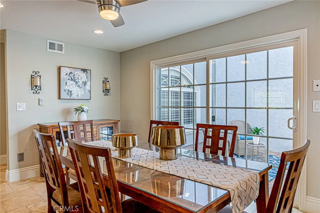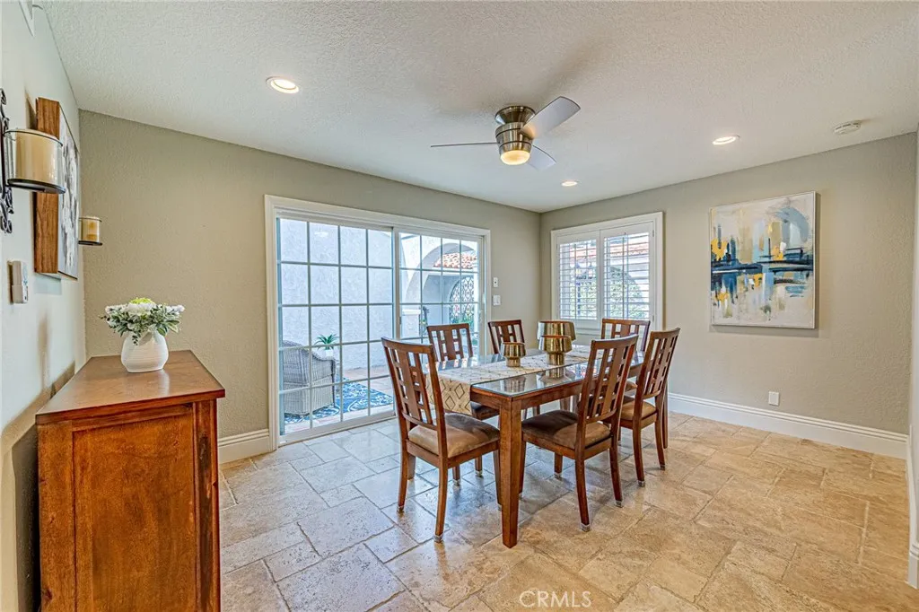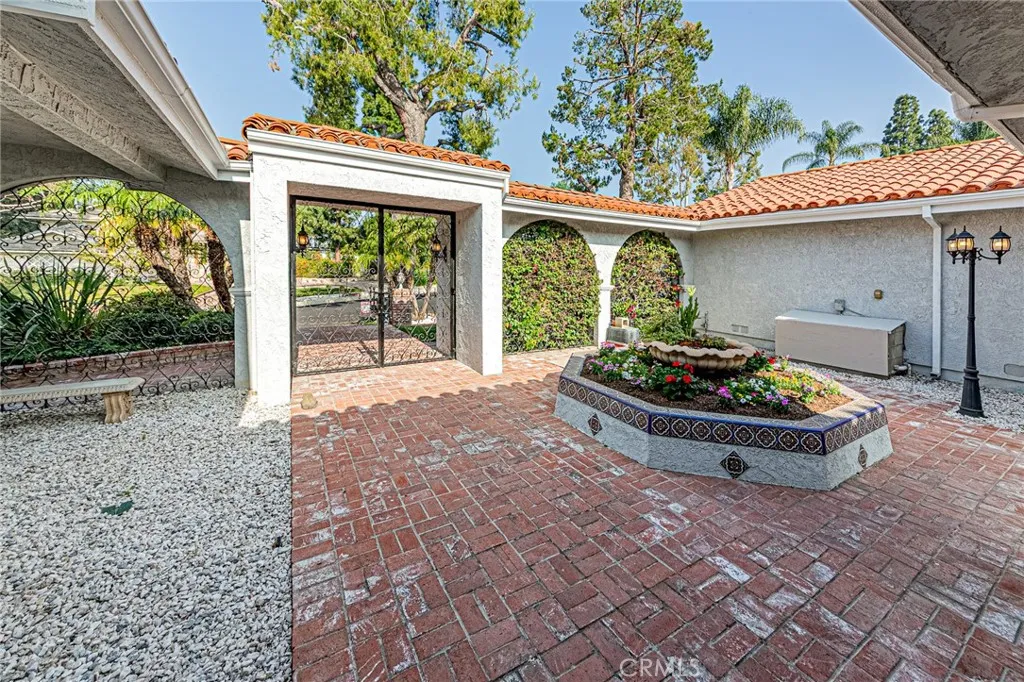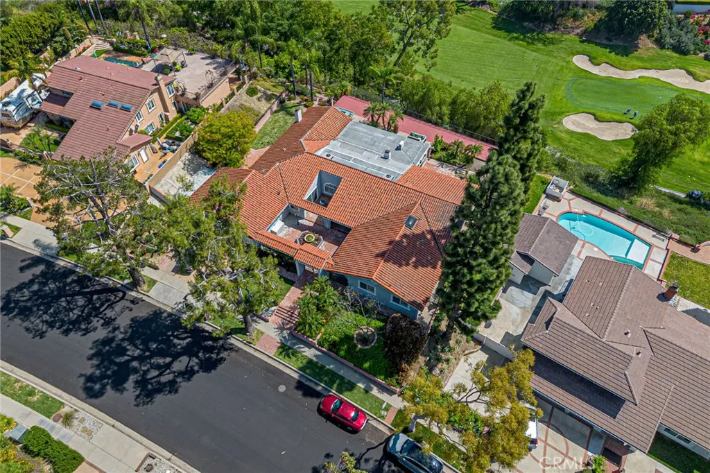 Rare opportunity to own a true single-story Spanish-style home in the prestigious North Friendly Hills community overlooking the Friendly Hills Golf Course (4th hole). Featuring 4 bedrooms, 4 bathrooms, and approximately 3,808 sq ft, this home offers a spacious and functional layout ideal for everyday living and entertaining. Privately gated, the home welcomes you into a charming courtyard with a custom planter centerpiece. Inside, the layout is enhanced by arched architectural details and travertine and wood flooring throughout. The floor plan includes a formal living room and family room with fireplaces, while the formal dining room is currently used as an office. The upgraded kitchen features an oversized island with granite countertops, designer drop lighting, and seating, along with dual sinks including a farmhouse-style sink, gas cooktop, stainless steel appliances, built-in desk, garden window, and an adjoining eating area. The kitchen opens to the living areas, and the family room features wood-beamed ceilings, a fireplace, and French doors leading to the outdoor spaces. A standout feature is the light-filled enclosed sunroom-style bonus space, ideal for a gym, game room, or additional living area. Situated on a 16,711 sq ft lot, the backyard features a built-in BBQ, spacious patio areas, grassy area, and a wood deck with golf course views. The primary suite offers a walk-in closet, a bathroom with separate shower and tub, and direct backyard access. Additional features include a three-car garage with epoxy-coated flooring and a separate storage room, crown molding,