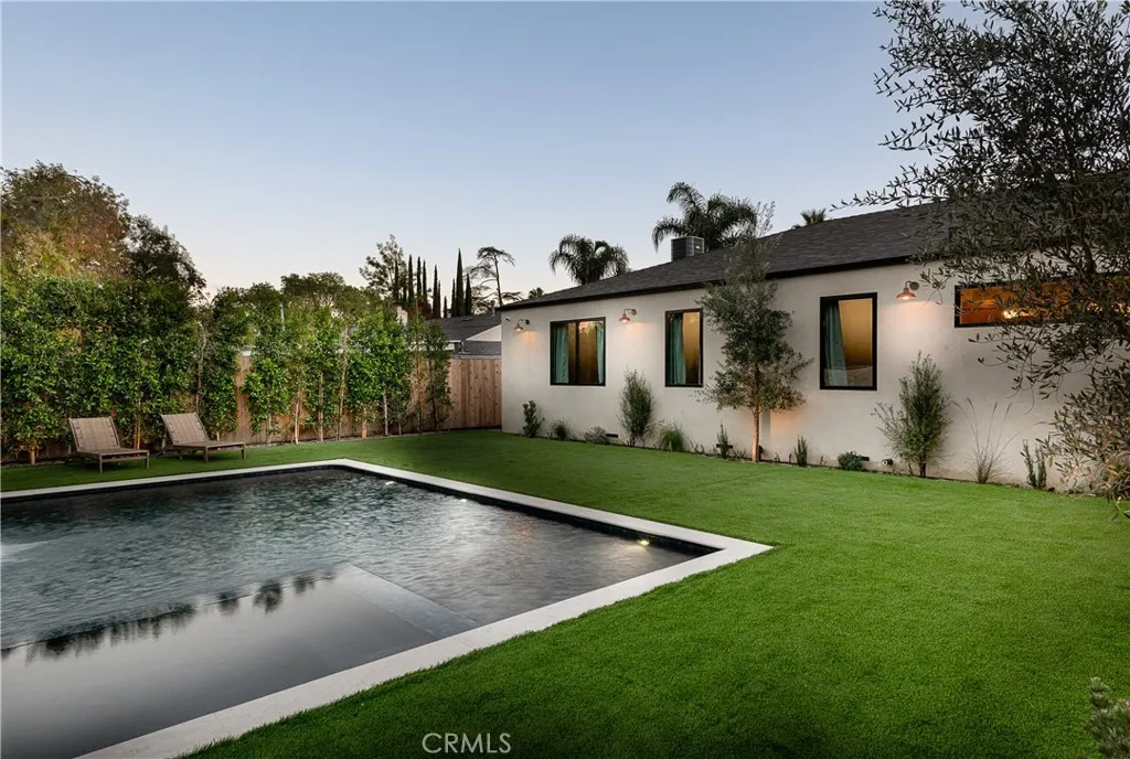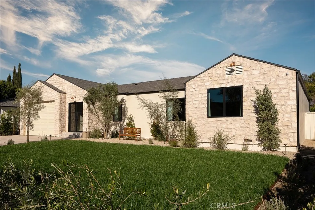 Envisioned at the crossroads of European elegance and modern Southern California living, this newly built single-level 3,428 sq ft residence in Encino offers a rare blend of timeless design and resort-style living. Situated on a beautifully landscaped 9,820 sq ft lot, the home features four bedrooms plus an office, with each bedroom designed as a private en-suite retreat for comfort and privacy. The tranquil backyard creates a true outdoor sanctuary, highlighted by a heated pool, cascading limestone waterfall, integrated spa, and Sonos outdoor sound system, all designed for seamless entertaining and relaxation. A refined exterior of smooth stucco, limestone accents, and mature olive trees sets a striking first impression, while the interior showcases warm natural materials, clean architectural lines, and curated finishes throughout. The chefs kitchen serves as the centerpiece of the home, featuring custom walnut cabinetry with brass hardware, hand-selected natural stone countertops, a dramatic stone-wrapped island, handmade zellige tile hood, Viking appliances, and a spacious walk-in pantry. Designed for modern California living, the home includes oak wood floors, tall walnut doors, brass lighting fixtures, data wiring to every bedroom, whole-home Sonos audio indoors and out, built-in surround sound, and a fully wired camera system. Expansive pocket doors in the great room open effortlessly to the backyard, creating seamless indooroutdoor living. The primary suite offers a spa-inspired bath and generous walk-in closet, completing a residence that combines thoughtful craftsm