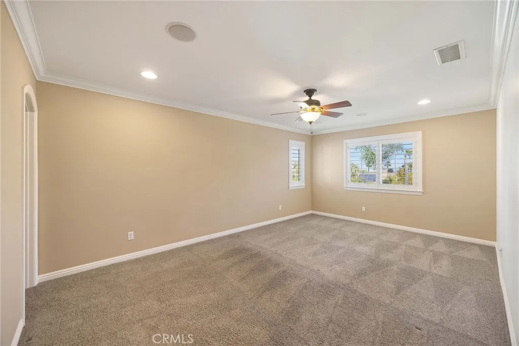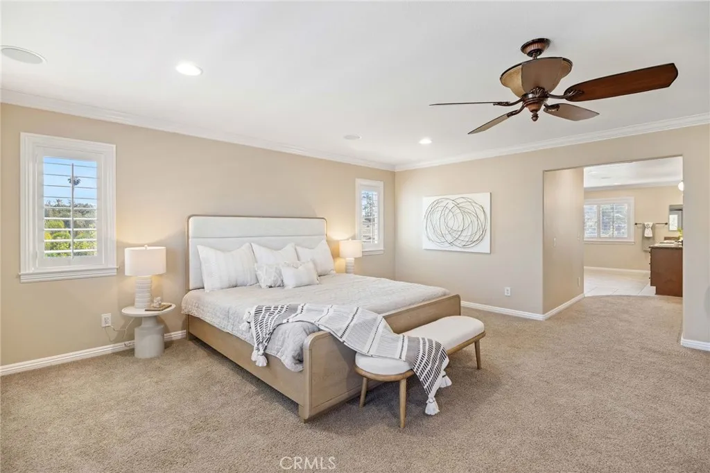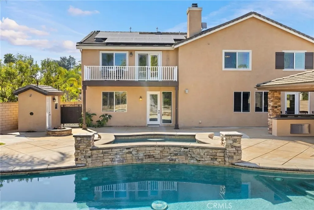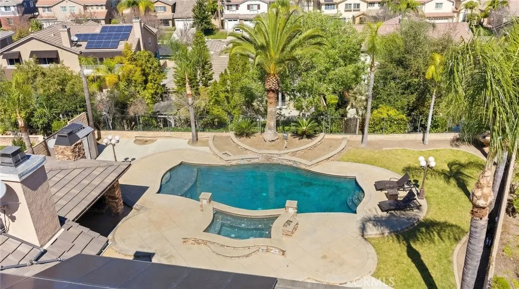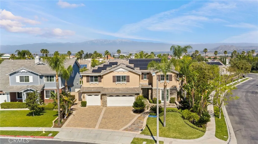 Located within the gated Fieldstone community, this expansive residence offers over 4,000 square feet of thoughtfully designed living space with 6 bedrooms and 6 bathrooms, combining refined interiors with resort-inspired outdoor amenities. Positioned on an elevated corner lot, the home enjoys added privacy along with beautiful mountain views on clear days. Designed for both everyday comfort and elevated entertaining, this home creates a seamless connection between indoor living and the outdoor entertaining spaces. The backyard is a true highlight of the property, designed as a private retreat for hosting and relaxation. A sparkling solar-heated pool anchors the space, complemented by a fully equipped outdoor cabana-style kitchen with built-in BBQ, bar seating, fire pit, and outdoor fireplace. No less than 16 palm trees surround the property, with a magnificent Sago as its centerpiece, creating resort-like vibes all year round. An outdoor bathroom adds convenience for guests enjoying the pool and entertaining areas. The flexible floor plan includes a private downstairs suite with its own entrance and patio, offering an ideal setup for extended family, guests, or a private office retreat. The first floor great room combines a fully equiped kitchen with a large living and dining space, with easy access to your incredible yard. Upstairs, the primary suite serves as a spacious sanctuary with an adjoining private balcony, featuring a large en-suite bath with a walk-in shower, soaking tub, and walk-in closet. Additional features include PAID-OFF SOLAR PANELS, upstairs laundry, a