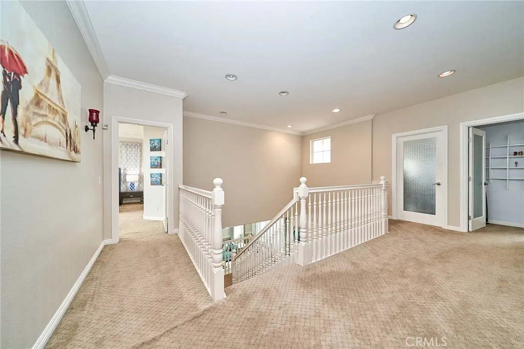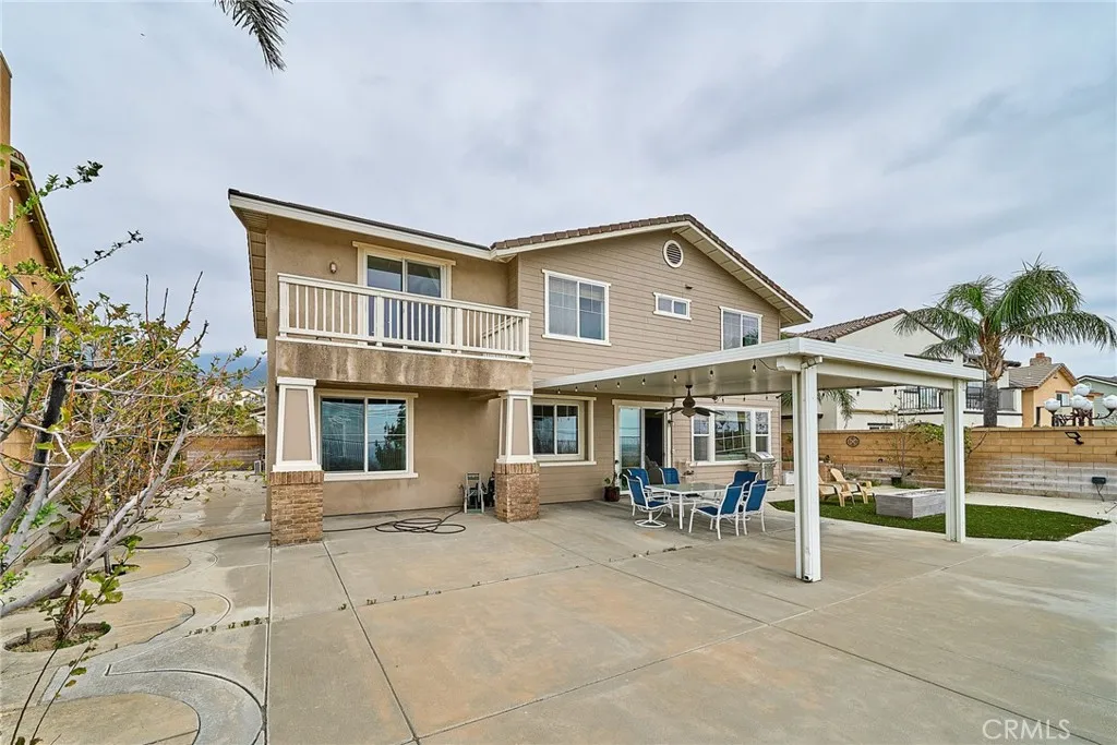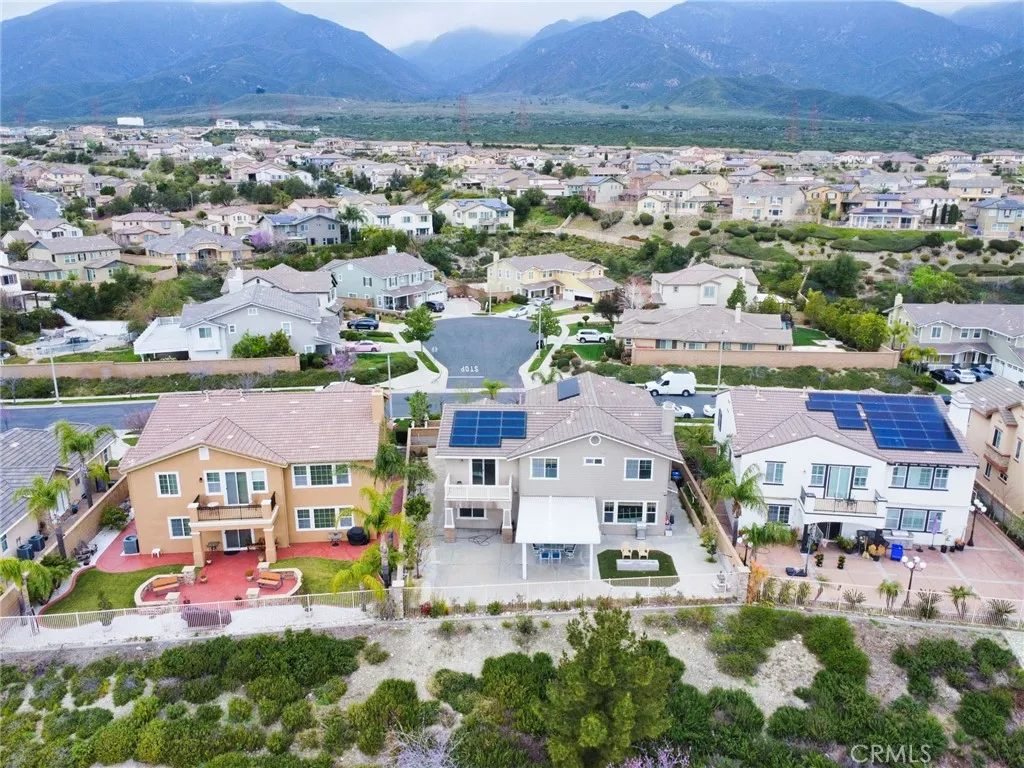 Located in one of Rancho Cucamongas most sought-after gated communities within the highly acclaimed Etiwanda School District, this exceptional 5-bedroom, 5-bathroom residence offers nearly 3,900 square feet of expansive living space with panoramic city and mountain views. Built in 2006 and positioned south-facing for optimal natural light, the home blends architectural elegance with long-term value including fully paid solar panels for energy efficiency and savings. A charming private courtyard with decorative pergola entry creates a striking first impression, setting the tone for the spacious interior beyond. Inside, the thoughtfully designed floor plan offers open-concept living areas and a generously sized loft that has been creatively configured into additional flexible-use spaces, currently serving as a private retreat and home office. Whether for extended family, remote work, or personal hobbies, the layout offers exceptional versatility without sacrificing openness. The luxurious primary suite provides a peaceful escape, while the rare casita-style guest suite near the entrance adds privacy and convenience for multigenerational living or visitors. The beautifully finished backyard features a 357 sq. ft. covered patio, fruit trees, and ample space for entertaining all complemented by sweeping foothill and city light views. Additional highlights include a wide driveway and 3-car garage, all within the prestigious Rancho Etiwanda Estates community, just minutes from award-winning schools, Victoria Gardens, dining, parks, and freeway access. A rare opportunity to own a