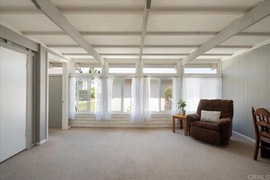 Set within the highly desirable Oceana 55+ community in Oceanside, this beautifully updated 2 bedroom, 1 bathroom end-unit offers privacy, natural light, and easy single-level living. Thoughtfully maintained and lovingly cared for, the home features quartz countertops, updated cabinetry, and replaced windows throughout, creating a bright, clean, move-in ready feel. Vaulted ceilings add to the spacious open layout, while multiple sunroom-style spaces offer flexible use for a home office, hobby room, reading nook, or extra lounge area. Enjoy peaceful mornings from your private porch with slight valley peak views, a charming touch that sets this home apart. Laundry is located inside the home, and a detached 1 car garage is conveniently located nearby. Residents of Oceana enjoy a vibrant and social lifestyle with access to pools, clubhouse activities, walking paths, and resort-style amenities. HOA is $562 and includes water, trash, and basic cable, all just minutes from shopping, dining, and a short trip to Oceansides beautiful beaches.
