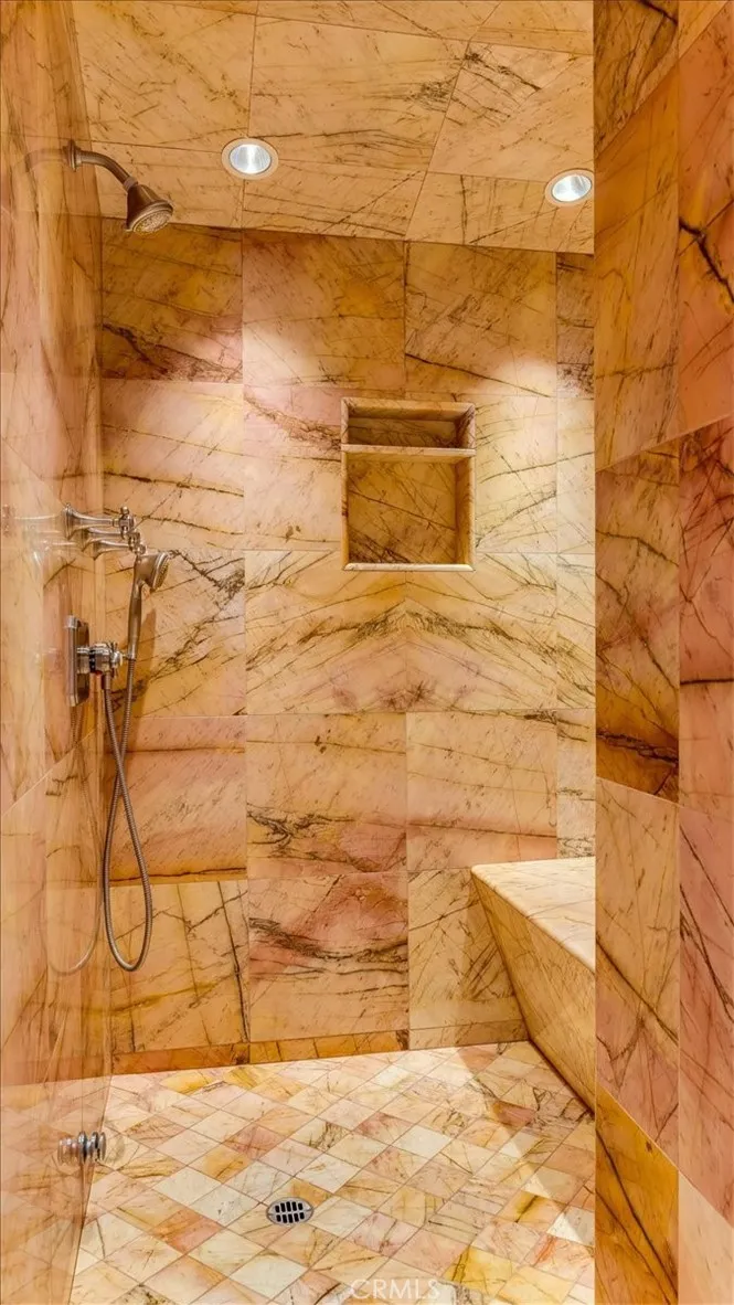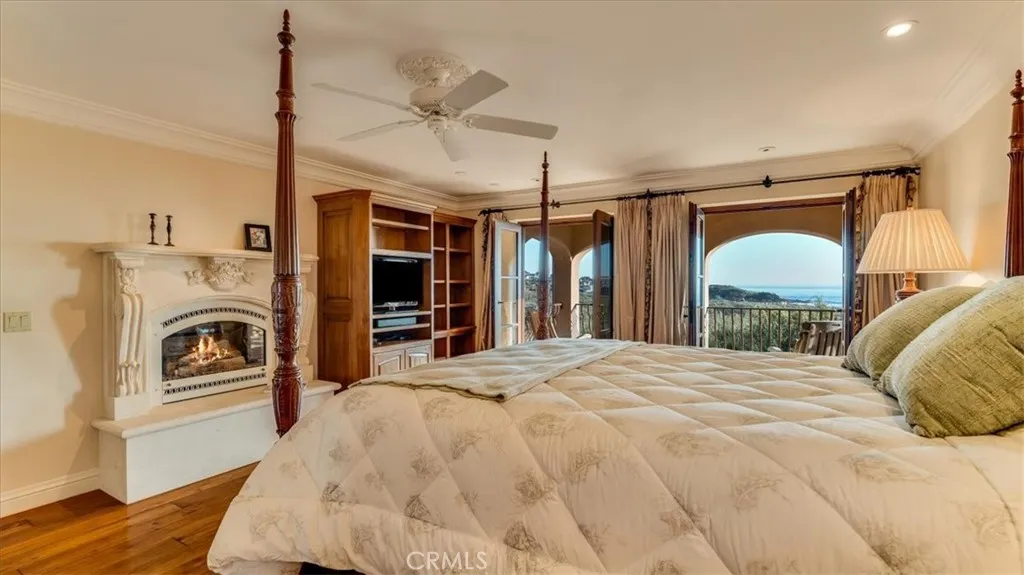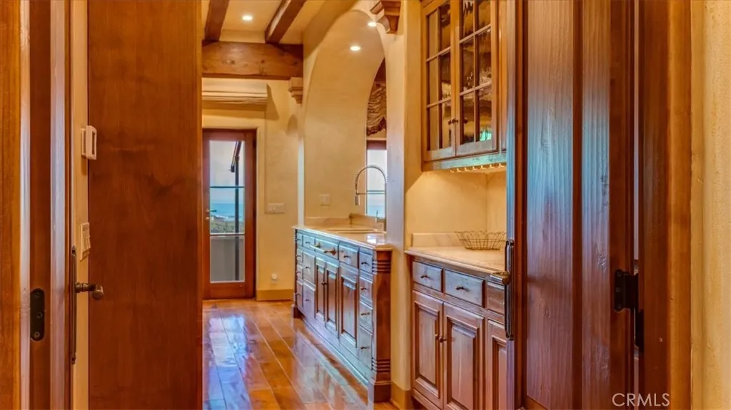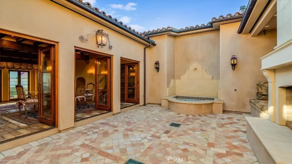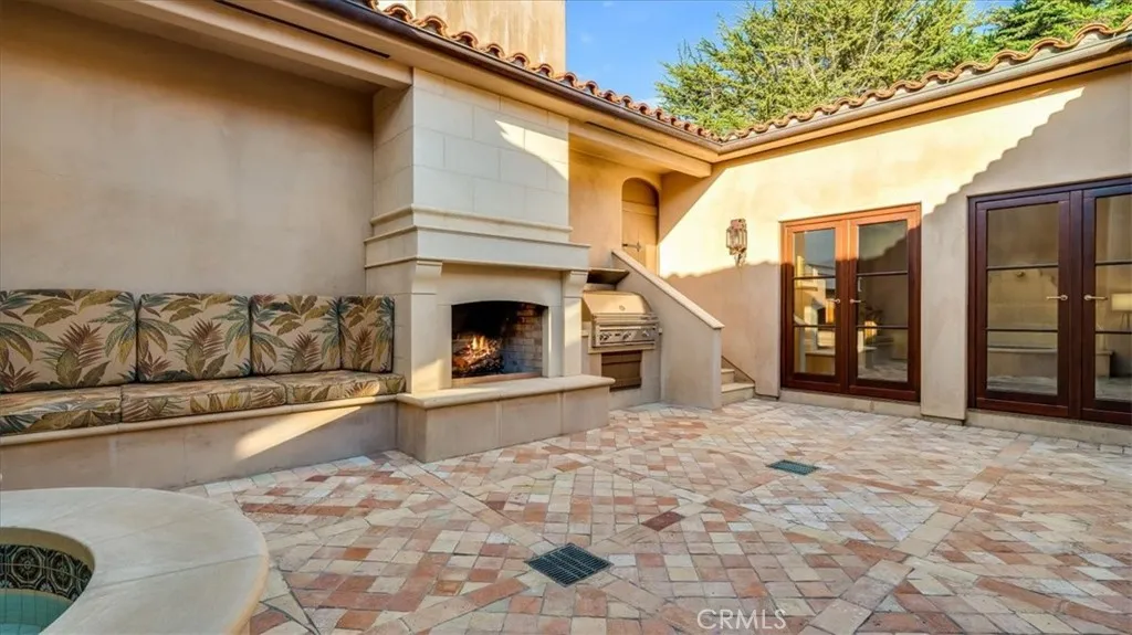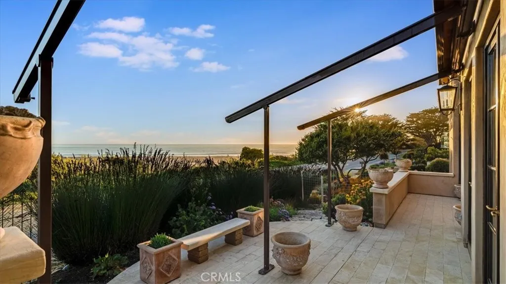 This elegant Italian Villa, Bellangelo, overlooking Moonstone Beach in Cambria is a jewel in craftsmanship and location. This spectacular villa was designed for ocean views and is situated on a south facing, street to street parcel optimized for incredible weather. Designed by famed architect John ONeil of Laguna Beach and built by Tony Peters, many materials were sourced from Italy and Tunisia. Generously sized rooms adorned with beams, hand scraped wood floors, and tall ceilings look out toward the sea or into an open-air inner courtyard. Glass doors from every room access the stone patios surrounding the home extending, the living areas and views. The villa has three bedrooms, large office/4th bedroom, 3.5 bathrooms, open living/dining area, chefs kitchen with walk-in pantry, walk-in wine cellar, oversized 2 car garage, private open air courtyard with fireplace, in-ground spa and built-in grill, plus many patios with mature landscaping. The large boulders interspersed with mature plants evoke an Italian landscape. The primary suite enjoys dramatic white water views from both the room and the patio. It has a cast stone fireplace, extensive closets and a sumptuous ocean view, marble bathroom. Exquisite details and character fill this home such as Murano glass chandeliers and wall sconces, marble floors and counters from Fire Mountain in Tunisia, windows and doors are Albertini (made and imported from Italy,) antique terra cotta floors sourced from old Italian homes, hand quarried limestone from Loveless Texas, and hand scraped wood floors. The location is close to the West
