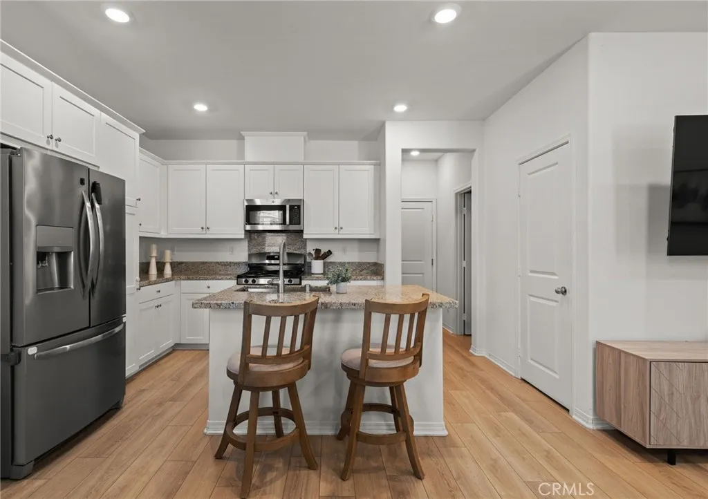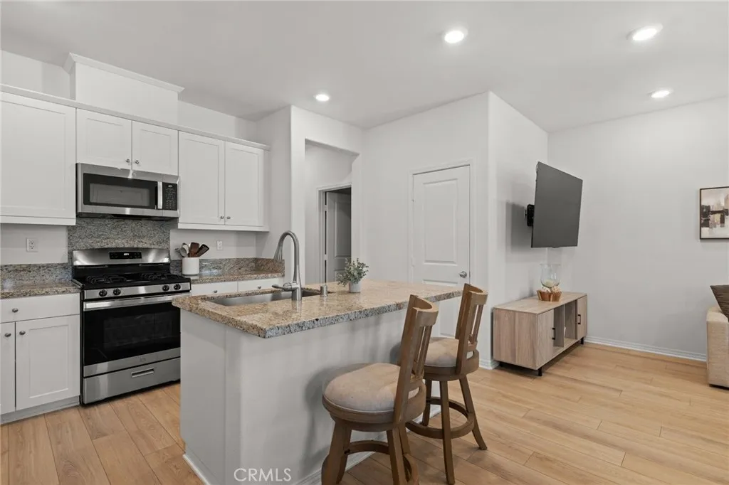 One of the few 2024 built condominiums in the Sevilla community with an open courtyard setting, offering added space and separation. Located within the Temecula Valley Unified School District. Open concept main level with upgraded luxury vinyl plank flooring, kitchen with granite countertops, white cabinetry, and center island. Includes half bath, enclosed front courtyard patio, and attached 2 car garage. Upstairs features a primary suite with dual vanities, soaking tub, separate shower, and walk-in closet, plus two additional bedrooms, full bath, and laundry with washer and dryer included. Energy efficient leased solar (transferable). HOA covers exterior maintenance and the master insurance policy, with buyers responsible for interior contents coverage only adding convenience and helping simplify ownership. Residents enjoy resort style amenities including pool, spa, clubhouse (available for rent for private events), BBQ areas, fire pit, picnic areas, park, cornhole, and walking paths throughout the community. FHA & VA approved.
