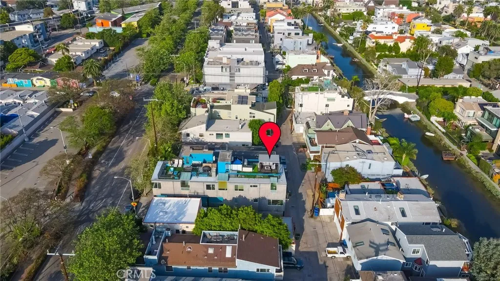 Architectural single-family home with a rooftop deck overlooking the Venice Canals. This south-facing residence with no common walls is set back from the street and filled with natural light, offering a sense of privacy in the heart of Venice. The main level features an open floor plan with two living areas, a gas fireplace, dining area, and a well-appointed kitchen with breakfast bar. The Venice Farmers Market is within walking distance. Upstairs includes two bedrooms, two bathrooms, a loft space ideal for an office or flexible use, and a dedicated laundry room. The primary suite features a walk-in closet and a bathroom with dual sinks, soaking tub, and separate shower. Additional features include high ceilings, a rooftop deck with canal and mountain views, built-in outdoor kitchen and BBQ, direct-access two-car garage, EV charging, and secured entry.