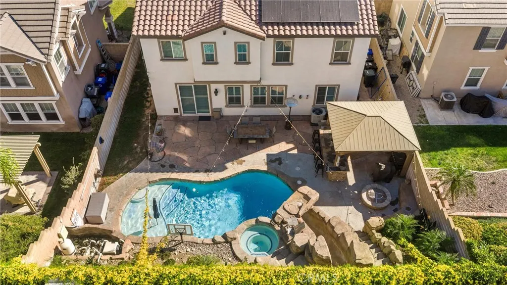 Two story POOL home located in the Citrus Heights gated community of North Fontana. Open floorplan with open living and family room and kitchen with tile floorings ! Custom Built shutters through family and living room . The downstairs features a large open kitchen with center Island, coffee nook and pantry. One bedroom and 3/4 bath downstairs. Upstairs, you will find 3 large guest bedrooms . Guest bath with dual sink vanity and tile flooring . Great size laundry room located upstairs. Great over-sized Master Suite and spa-like ensuite with separate tub/shower & large walk-in closet. Resort looking Oasis with water slide and Build in Island with natural gas and over sized Gazebo with two built in refrigerators . Firepit with natural gas . SOLAR PANELS to keep electricity bill to a minimal even during hot summer days .240 V EV car charger for your convenience already installed in the garage .