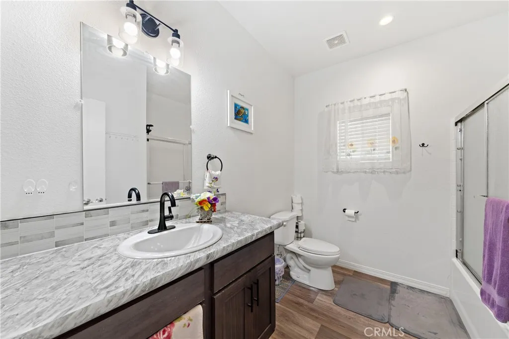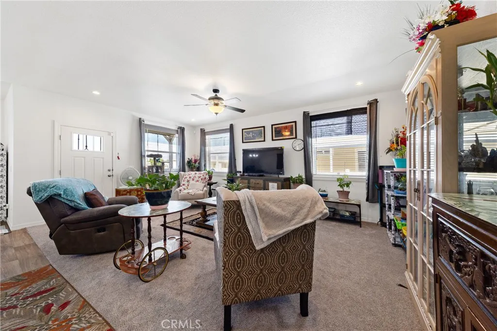Like new 3 bedroom 2 bath manufactured home with mountain view from the brick-accented front porch, located in ALL-AGE Villa Del Sol Mobile Home Estates within close proximity to restaurants and shopping. Open great room style living area with high ceilings, vinyl plank flooring, and ceiling fan. Spacious kitchen has island breakfast bar, standing pantry, farmhouse-style sink with decorative glass/tile backsplash, and stainless steal appliances including 5-burner gas stove, dishwasher, and refrigerator. Master bedroom boasts a walk-in closet and ceiling fan, and en suite bathroom with accessible shower and dual-sink vanity. All bedrooms have convenient center-ceiling light fixtures. Full guest bath has ample counter space and built-in medicine cabinet. Inside laundry includes washer/dryer. Extra tall carport to accommodate over-size vehicle with lattice privacy screening, vinyl fencing, and electric car charging station. Easy care rockscape landscaping and large shed. Security front and side screen doors and home automated HVAC and security system. Gated family park. Amenities include: Swimming pool (heated during summer), spa, Club house with banquet facilities, billiard room with ice hockey and ping pong tables, Community Laundry Facilities, Boat/RV Storage ($35/mo), kids playground and picnic area.
