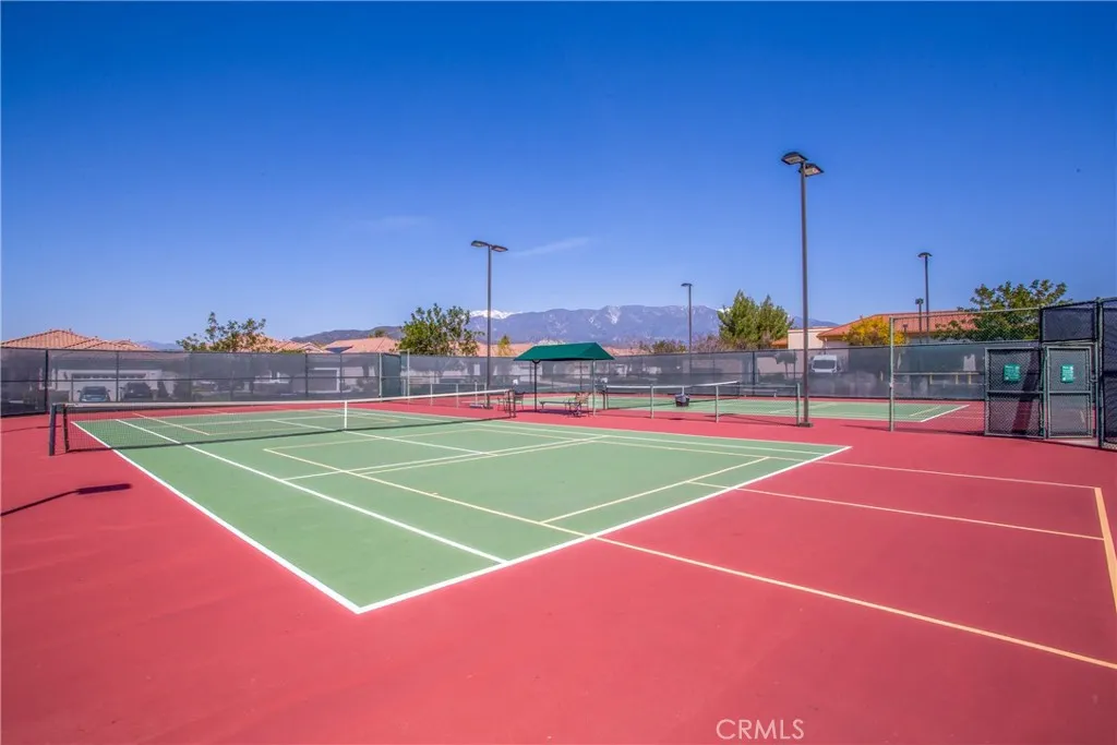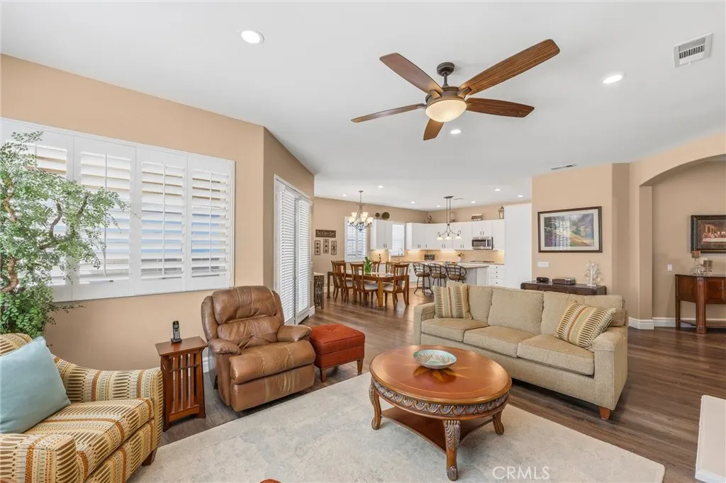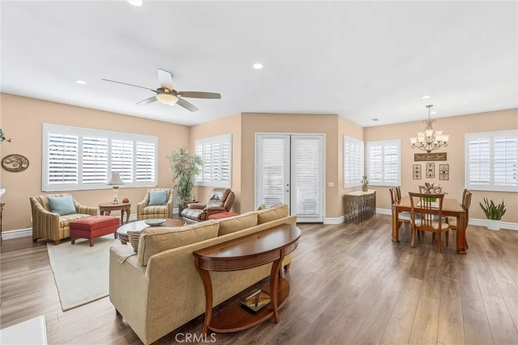 Beautifully upgraded single story home in the highly sought after 55+ community of Solera at Oak Valley Greens, offering comfort, style, and low maintenance living. This popular floor plan features 2 bedrooms, 2.5 bathrooms, plus a versatile office or den that can easily be converted into a 3rd bedroom. The open layout is both functional and inviting, featuring plantation shutters throughout and luxury vinyl flooring in all living areas, with carpet in the bedrooms and tile in the bathrooms. The family room is highlighted by a custom wall unit that adds both character and everyday functionality. The upgraded kitchen features a center island with bar seating and opens directly to the dining area and family room, creating a natural flow that works perfectly for both daily living and entertaining. The primary suite includes a remodeled bathroom with clean, modern finishes and a true move in ready feel. Step outside to a private backyard with a covered patio that feels like an extension of the home, ideal for relaxing or spending time with friends and family. Additional features include an indoor laundry room, a 2 car garage plus separate golf cart garage, and an HVAC system installed in May 2022 and serviced regularly under a maintenance plan. Solera offers a vibrant, active lifestyle with resort style amenities including a clubhouse, pool, spa, fitness center, tennis, walking paths, and a full calendar of activities. Conveniently located near the 10 freeway with easy access to Palm Springs, Oak Glen, golf courses, shopping, dining, and the Cabazon Outlets.