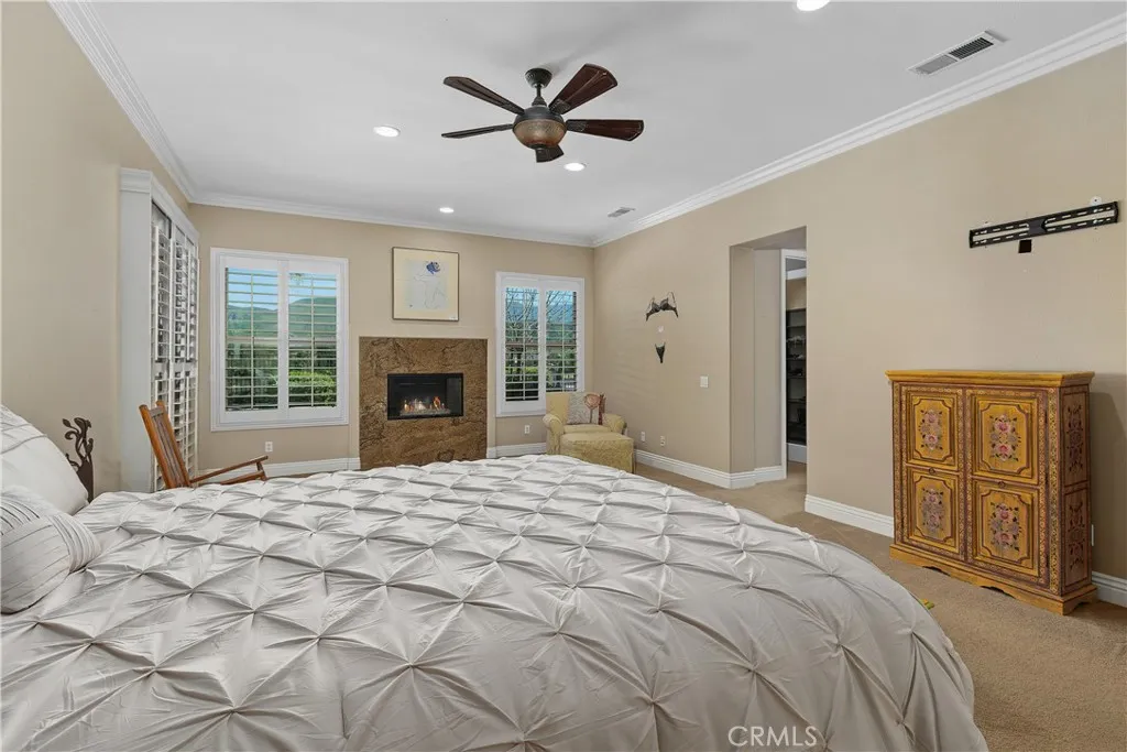 Panoramic views of mountains and ranches await in this dream residence, on Frogs Leap Streetthe Location, Location to be in the Temecula area of Morgan Hill. This expansive single-level, 5 bedroom, 3 bath home sits on approximately half an acres, creating an idyllic setting for relaxation and inspiration. Host events by the shimmering pool with spa, stay active with a dedicated lap pool, or unwind in the hot tub. Through the double door entry, elegant tile flooring leads seamlessly to every room throughout the home. Interior finishes feature neutral palettes, crown moldings, and custom shutters, while the newly painted dining room with coffered ceilings adjoins a quiet living room. The gourmet kitchen presents beautiful wood cabinetry, granite countertops, a spacious island with an under-counter wine refrigerator, stainless steel appliances, reverse osmosis water systems, a walk-in pantry, all overlooking a relaxing family room with a cozy fireplace and unobstructed outdoor views. The main bedroom offers stunning scenery and direct access to a large backyard covered by a roofed lanai. 5 generously sized bedrooms include one currently used as an office. The tranquil primary suite features a fireplace, mountain views, dual walk-in closets, and a spa-like bathroom with 2 separate vanity areas, a soaking jetted tub, and an oversized tiled rain shower. Hallways are enhanced with attractive wood-grain cabinetry and convenient granite countertops. Additional amenities include a picturesque rose-lined Zen garden path, 38 paid solar panels with battery storage, an in-garage EV charg