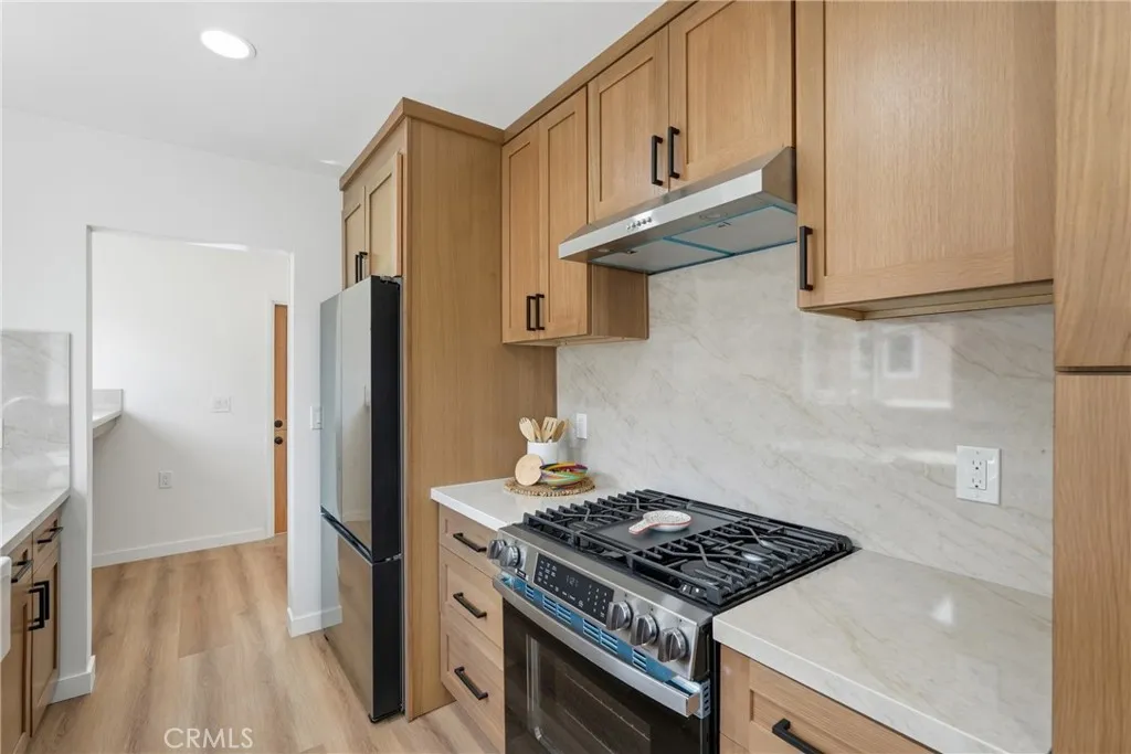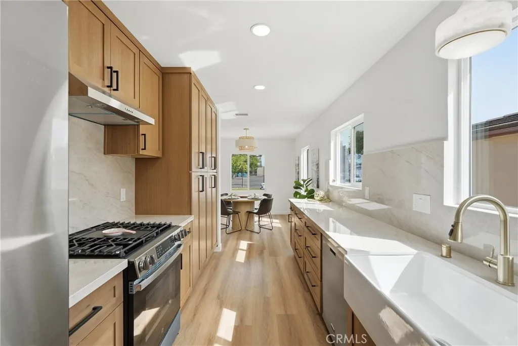 Welcome to 6926 e Peabody. Step inside to appreciate its transformation. You will enjoy the natural light pouring in from the large living room window, luxury vinyl flooring, and recessed lighting, creating a warm and welcoming space to entertain. The dining area chandelier complements the natural tones of the soft-closing drawers, cabinets, and quartz countertops in the remodeled kitchen, which connects to the laundry space, separated by a barn door. The primary bedroom suite includes indoor-outdoor living, with French Doors leading out to a covered back patio. The two bedrooms down the hall have recessed lighting and spacious closets. The backyard includes a finished two-car garage with epoxy flooring, a large covered porch with an outdoor kitchen, new grass, and a permitted den with a powder room, offering the new owner plenty of possibilities for their remodeled home. From the solar, the home remodel, AC, the beautiful outdoor space, and the location, we are excited to bring you this Long Beach home.
