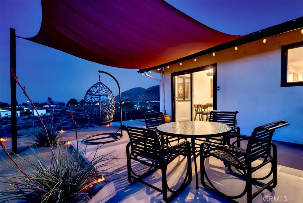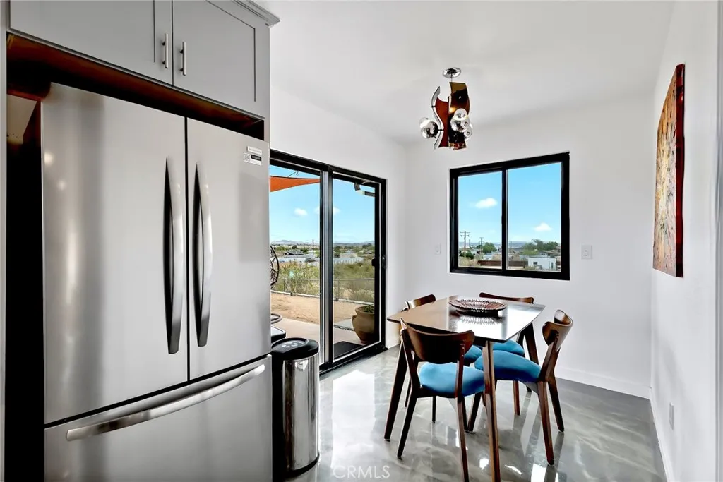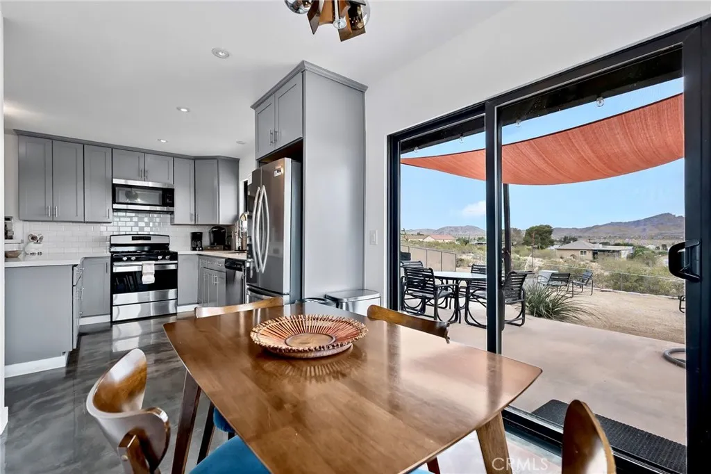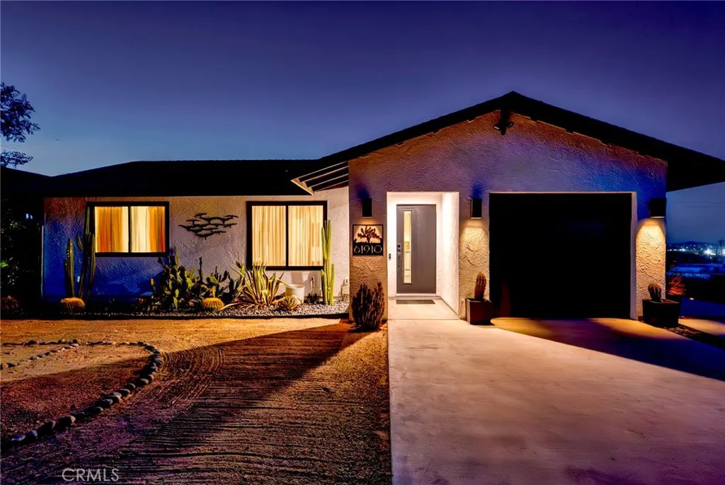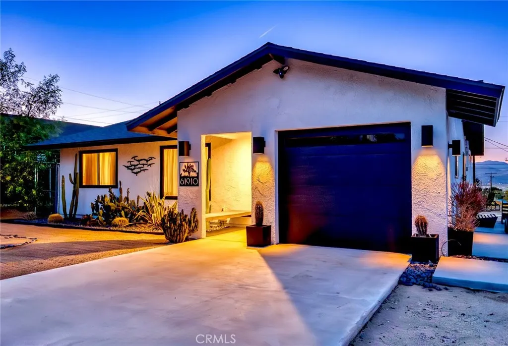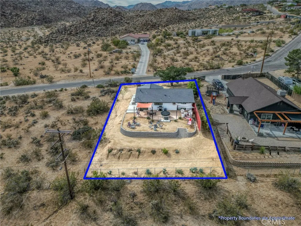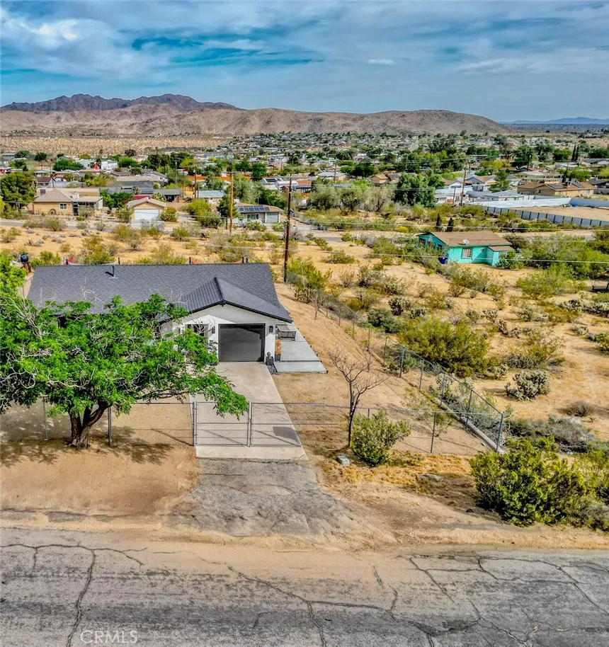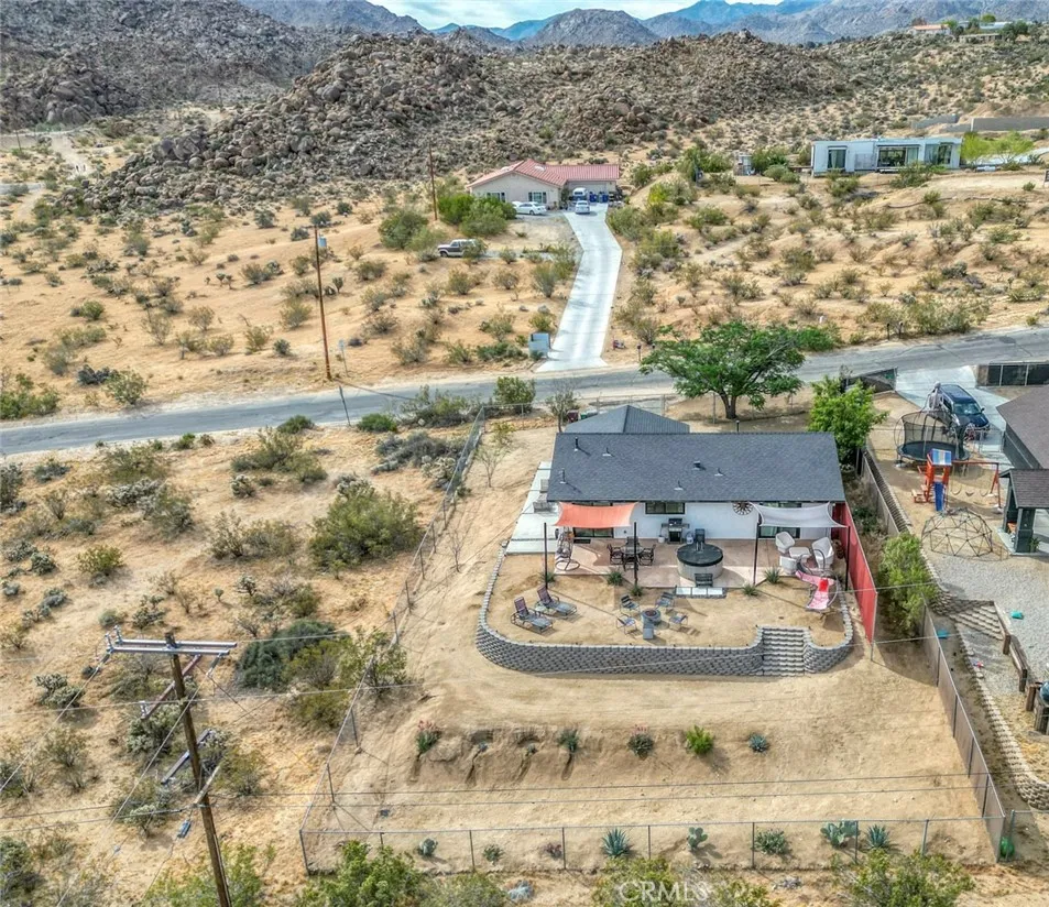 Perched walking distance from the heart of Joshua Tree Village and uniquely positioned across from protected land at Coyote Hole Canyon, home to ancient petroglyphs, this beautifully curated two-bedroom, one-bathroom home offers an exceptional blend of modern design, comfort, and iconic desert surroundings. Set on a thoughtfully situated lot with sweeping views of boulder formations, the valley and the Bartlett Mountain Range, all just minutes to Joshua Tree National Park. Inside, the home is bright and intentionally designed, featuring custom concrete epoxy flooring and an open concept layout. The living room flows into a stylish kitchen with a breakfast bar for casual dining. Through a large glass expanse, the kitchen sink frames dramatic northern mountain and valley views, while the dining area is bathed in natural light from generous windows and a sliding glass door that opens to the backyard. Updated modern Milgard windows enhance energy efficiency, comfort, and quiet while showcasing the surrounding landscape, and mini-split systems throughout provide year-round comfort. Both bedrooms serve as inviting retreats with abundant natural light, with one offering direct access to the backyard through a sliding glass door, while the bathroom is tastefully finished with a single-sink vanity and a spacious walk-in shower with glass enclosure. The attached garage has been finished to include laundry hookups and an electric garage door, adding both convenience and everyday functionality. Designed for both relaxation and entertaining, the outdoor space features wraparound views o