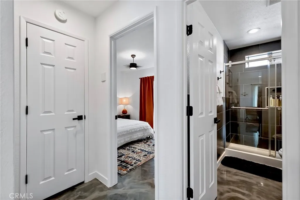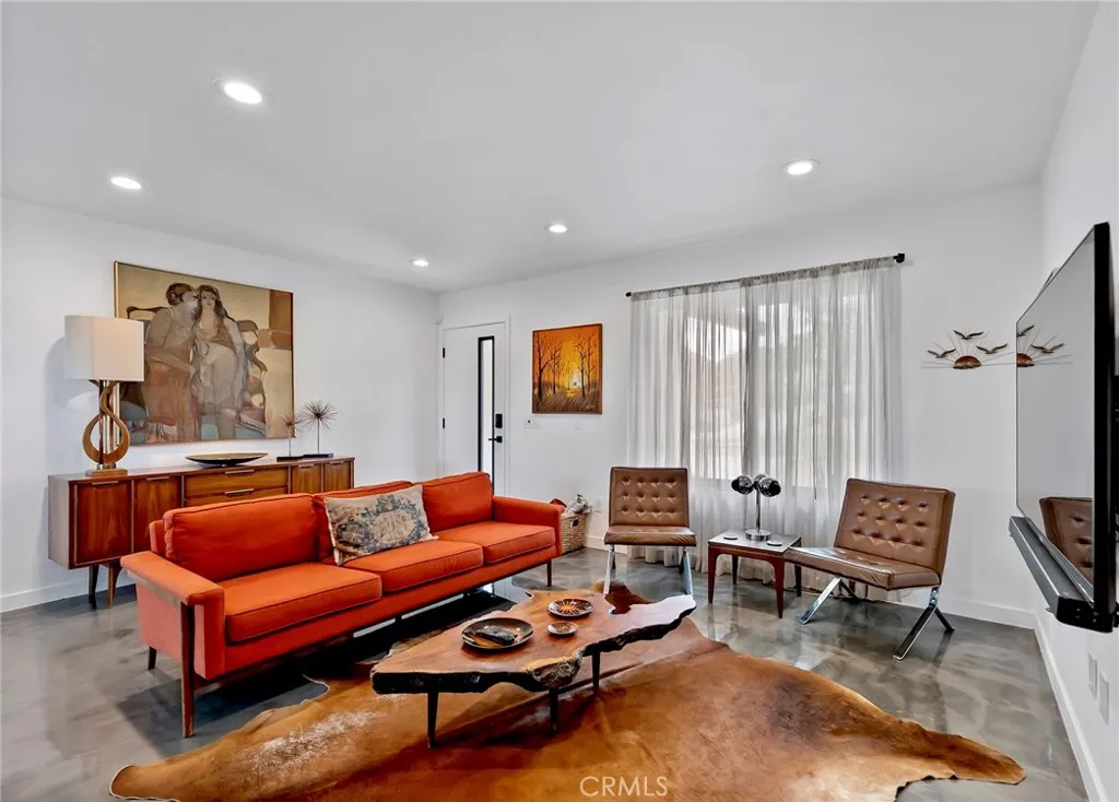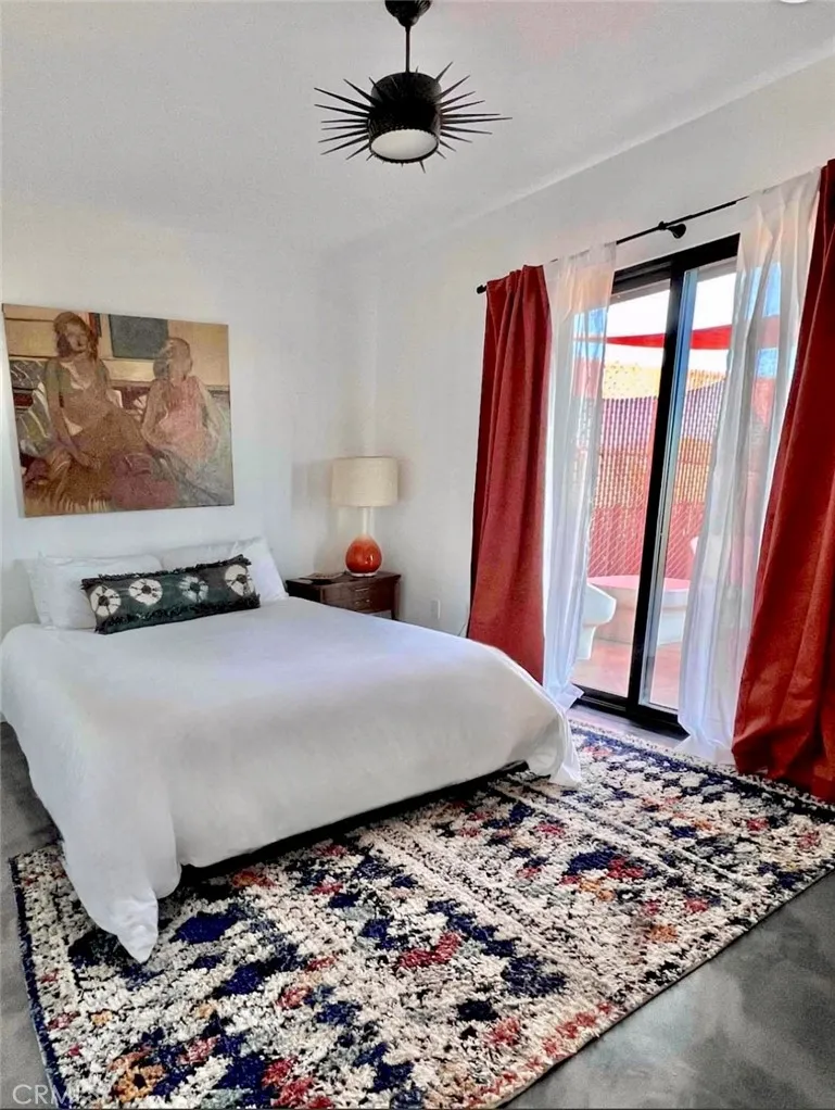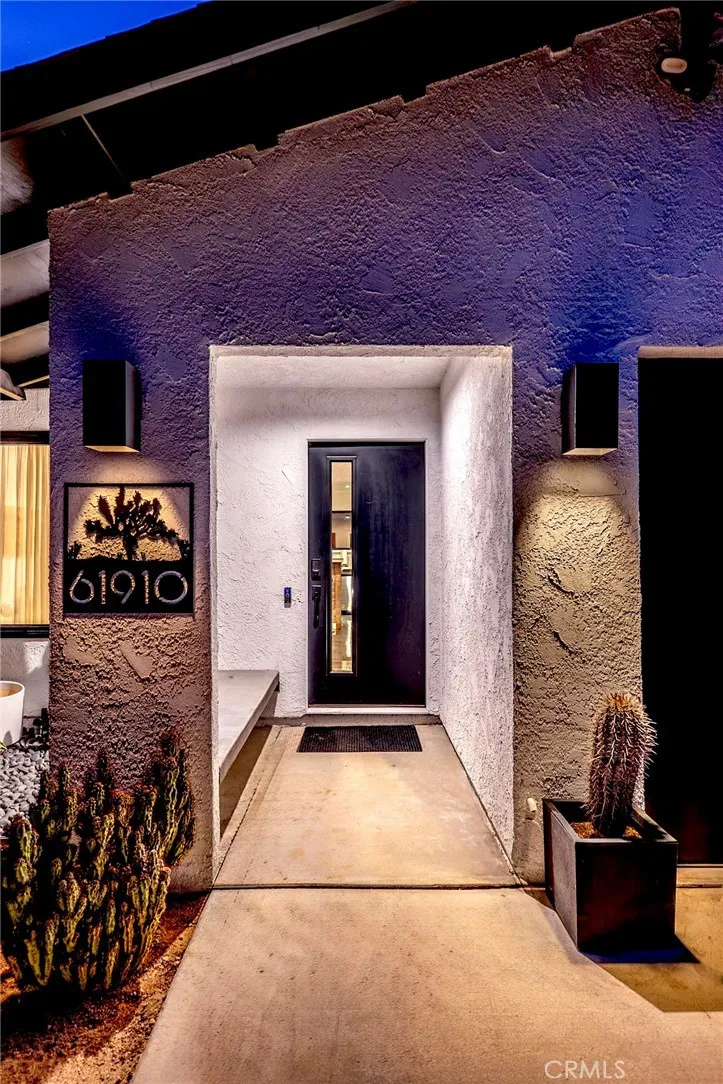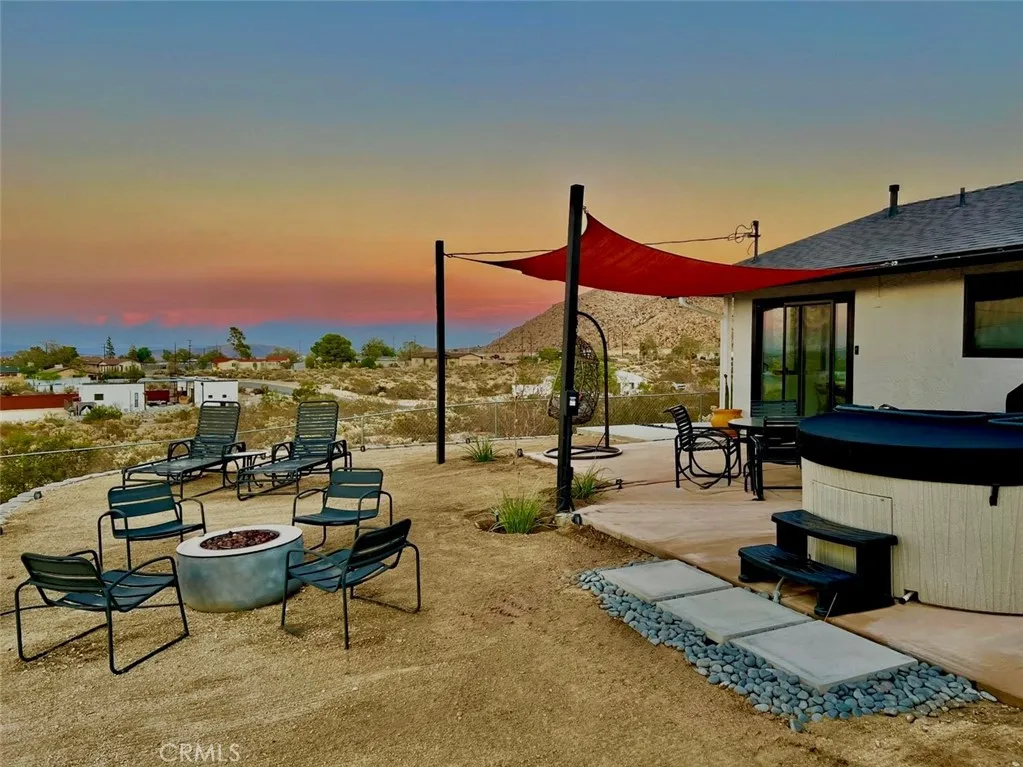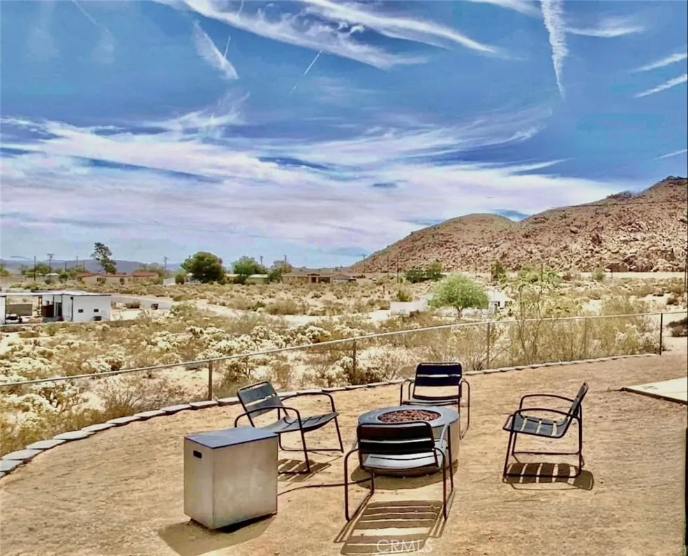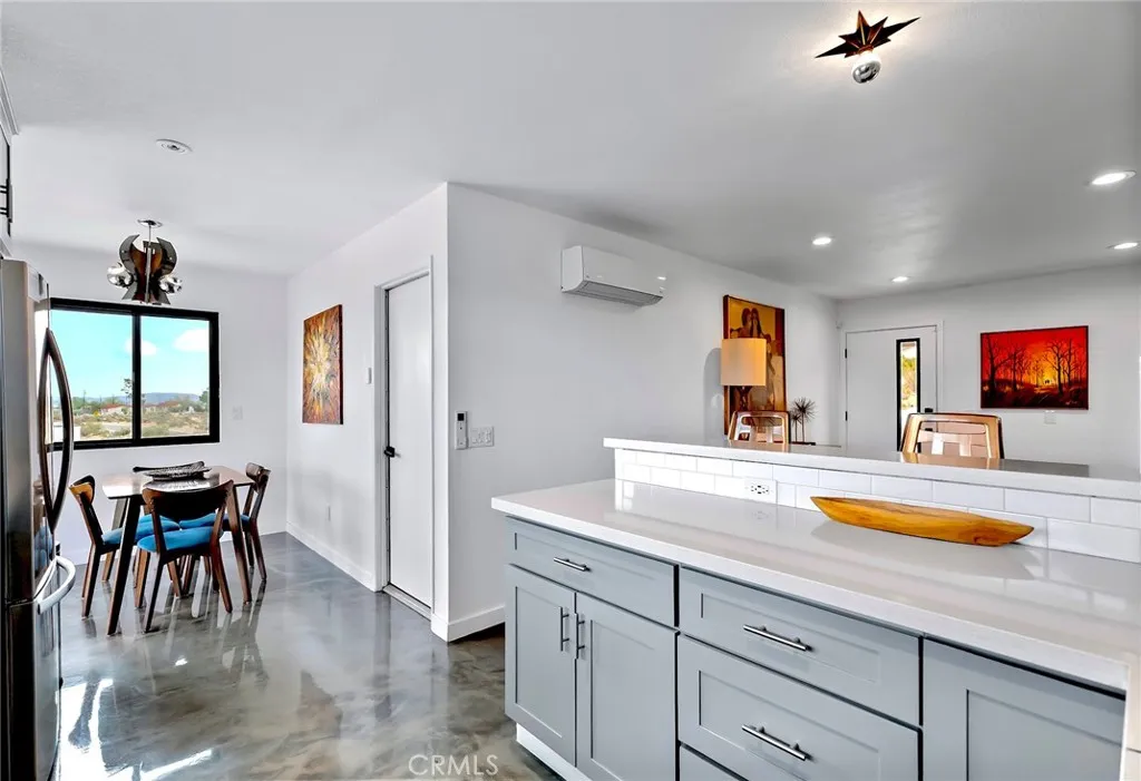Perched walking distance from the heart of Joshua Tree Village and uniquely positioned across from protected land at Coyote Hole Canyon, home to ancient petroglyphs, this beautifully curated two-bedroom, one-bathroom home offers an exceptional blend of modern design, comfort, and iconic desert surroundings. Set on a thoughtfully situated lot with sweeping views of boulder formations, the valley and the Bartlett Mountain Range, all just minutes to Joshua Tree National Park. Inside, the home is bright and intentionally designed, featuring custom concrete epoxy flooring and an open concept layout. The living room flows into a stylish kitchen with a breakfast bar for casual dining. Through a large glass expanse, the kitchen sink frames dramatic northern mountain and valley views, while the dining area is bathed in natural light from generous windows and a sliding glass door that opens to the backyard. Updated modern Milgard windows enhance energy efficiency, comfort, and quiet while showcasing the surrounding landscape, and mini-split systems throughout provide year-round comfort. Both bedrooms serve as inviting retreats with abundant natural light, with one offering direct access to the backyard through a sliding glass door, while the bathroom is tastefully finished with a single-sink vanity and a spacious walk-in shower with glass enclosure. The attached garage has been finished to include laundry hookups and an electric garage door, adding both convenience and everyday functionality. Designed for both relaxation and entertaining, the outdoor space features wraparound views o