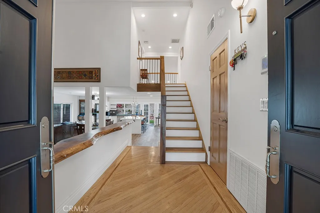 A Private Retreat Defined by Craftsmanship, Comfort, and Elevated Living Tucked behind a custom iron gate, this beautifully reimagined residence offers thoughtful upgrades, and comfortable California living. Curated landscaping, drought-tolerant succulents, and custom brick accents create a sense privacy, polished, and inviting living. Inside, there are hardwood floors, a handcrafted iron staircase with a walnut handrail, and solid wood doors speak to the quality infused throughout. Natural light fills the interiors, highlighting a seamless flow within the living spaces, ideal for everyday comfort and sophisticated entertaining. At the heart of the home, the kitchen is anchored by a striking quartz waterfall island and custom cabinetry and a premium Fisher & Paykel range. Thoughtfully remodeled in 2022 along with the homes bathrooms. French doors open to the outdoors, with hidden retractable screens that invite in fresh air and extending the living experience beyond the walls. The adjoining family room offers vaulted wood-beamed ceilings, custom built-ins, and a dedicated media wall create the perfect environment to relax and unwind. One of the homes most compelling features is the first floor primary suite. Spacious and serene, the suite features a large walk-in closet with custom built-ins and abundant storage. The spa-inspired primary bathroom, showcases custom tilework, and a walk-in glass shower. Also on the main level is a versatile bedroom with loft, ideally suited as a guest quarters or private home office. Upstairs, additional bedrooms feature vaulted ceilings, nat