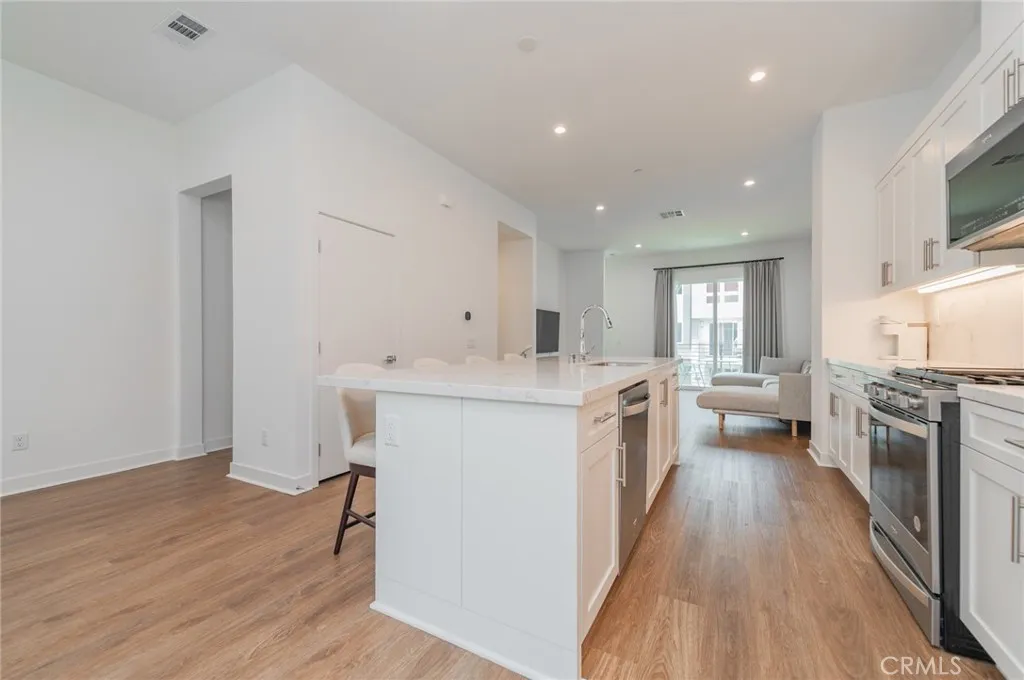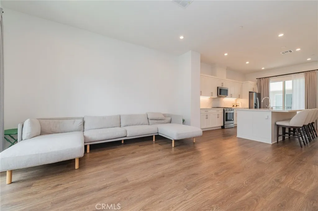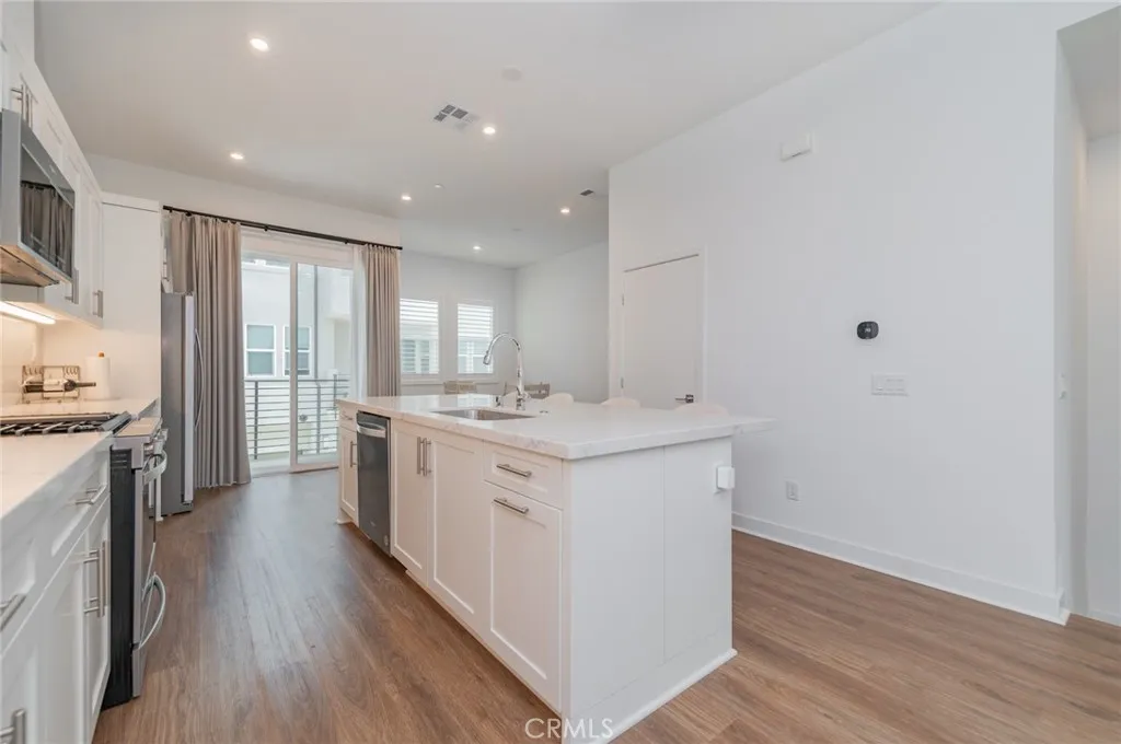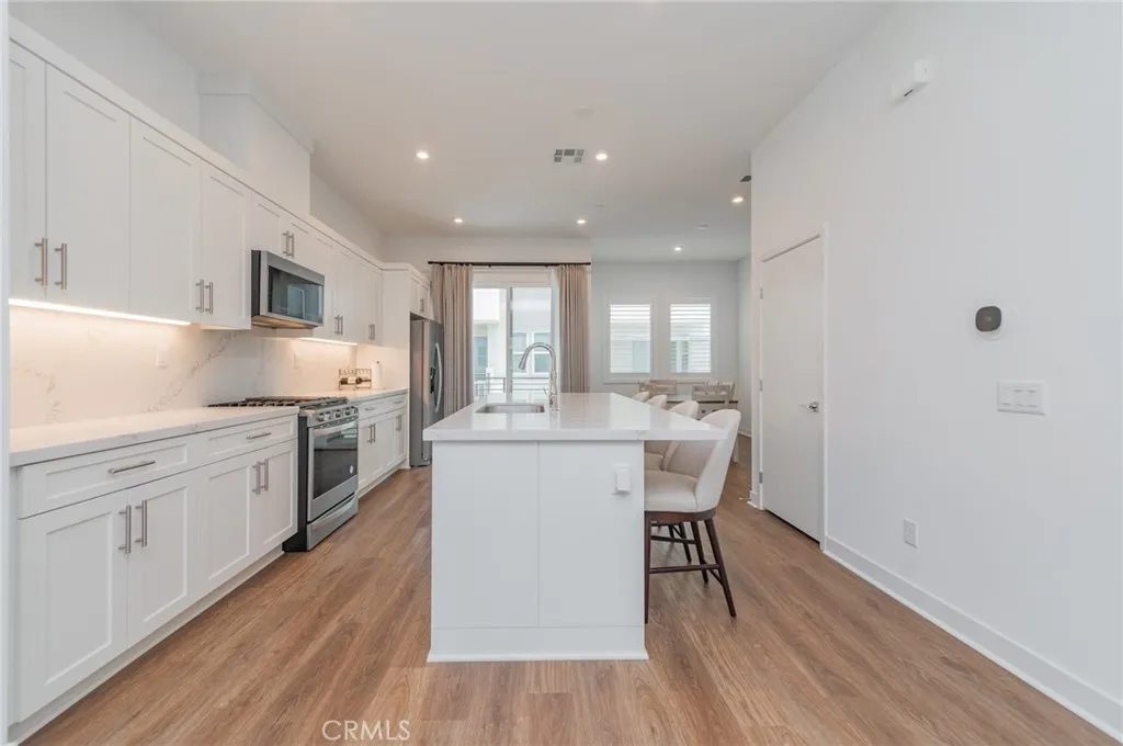 Welcome to this contemporary townhome in the highly desirable gated community of 100 West in Anaheim, built by Toll Brothers. Featuring one of the most versatile floor plans, this home is ideally situated in one of the communitys premier locations. Enjoy resort-style amenitiesincluding a sparkling pool, relaxing spa, landscaped park, and BBQ areasjust steps from your front yard, making it effortless to enjoy outdoor grilling and swimming anytime. The open-concept main level showcases a spacious living and dining area filled with natural light, seamlessly connected to a gourmet kitchen with a large center island, lustrous quartz countertops, stainless steel appliances, and ample cabinetry. Experience indoor-outdoor setting with private balconies view of community greenbelt and a rooftop deck perfect for entertaining offering city views and Disneyland fireworks. A first-floor bedroom with full bath provides flexibility for guests, office, or multigenerational living. Upstairs, the primary suite features a walk-in closet and spa-inspired bathroom with dual vanities and a glass-enclosed shower. Additional highlights include in-unit laundry, central HVAC, energy-efficient features including owned solar panels and a direct-access 2-car garage. Ideally located just minutes from Disneyland, Honda Center, Angel Stadium, top dining and shopping destinations, major medical centers, Chapman University, UCI School of Medicine, and Cal State Fullertonwith convenient access to freeways and transportation hubsthis home offers an unparalleled lifestyle of comfort, convenience, and modern el