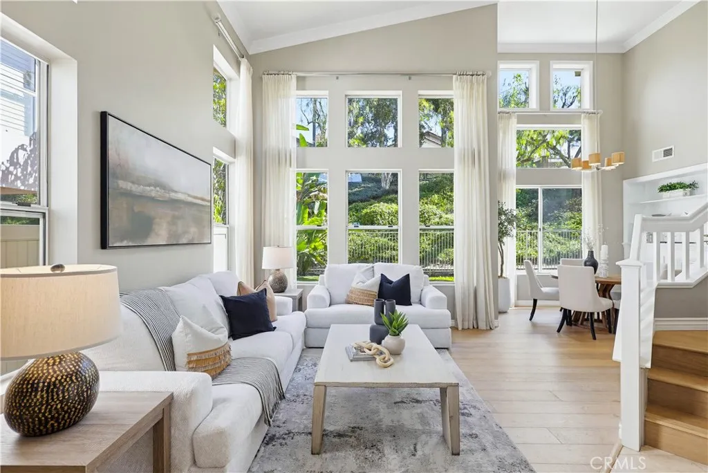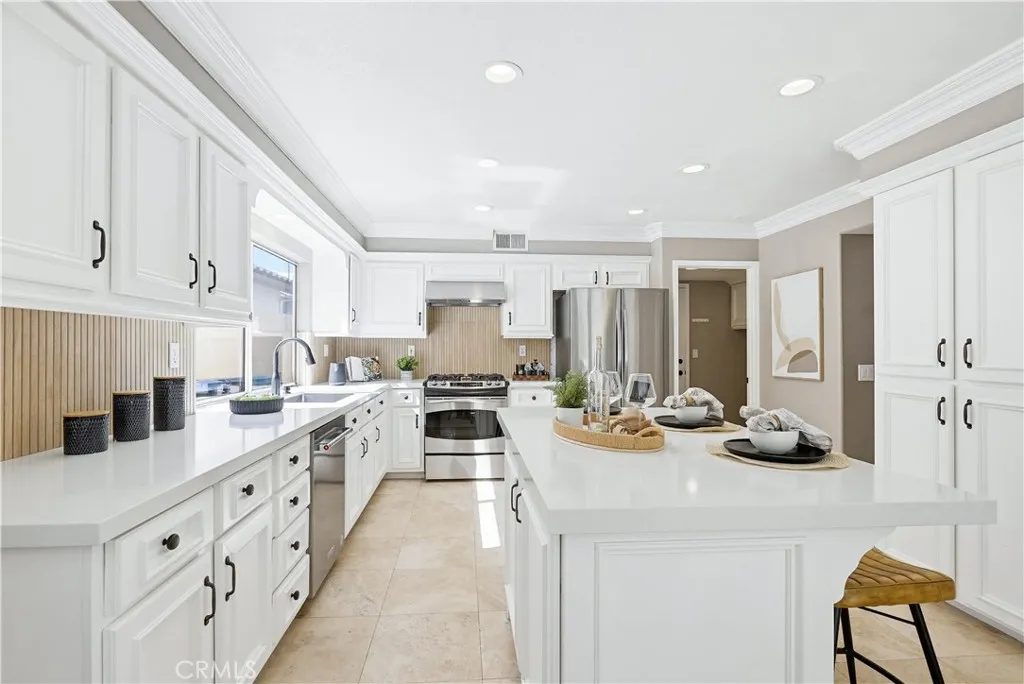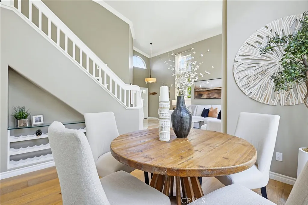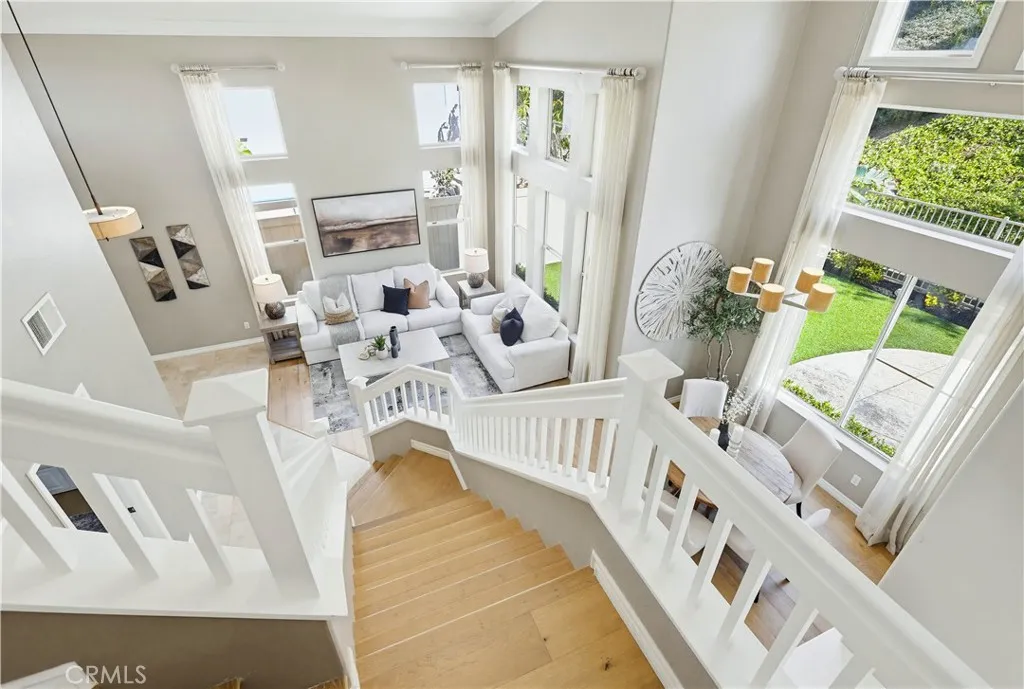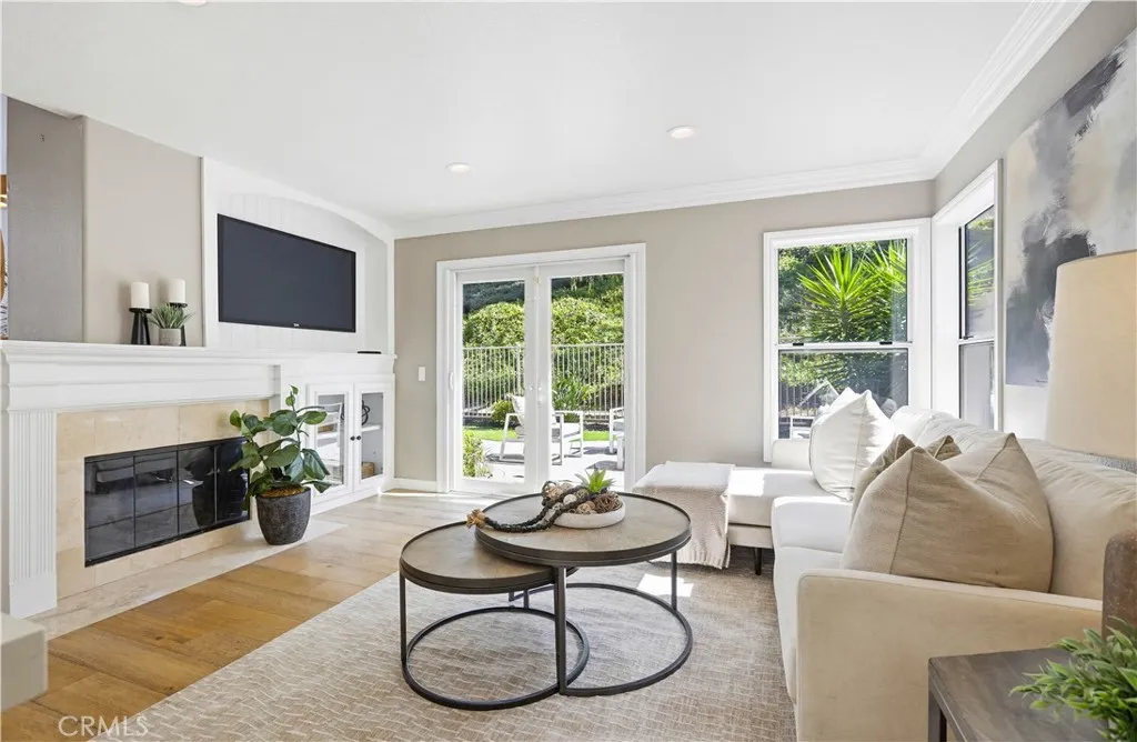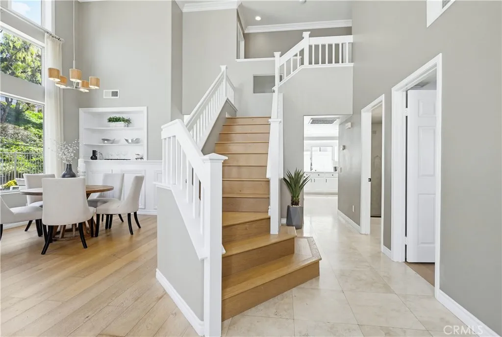 Prepare to fall in love with this spacious and beautifully updated California Crest home, a perfect example of pride in ownership! Ideally located on a family friendly cul-de-sac street in a highly desirable Pacific Hills neighborhood, this home pushes all the right buttons! Pass through the double door entry and soak in the soaring two story ceilings with an abundance of natural light streaming through the floor to ceiling windows. Extra wide crown molding, gorgeous wide plank wood floors, custom light fixtures, and a stunning centerpiece staircase set the stage for an impressive living environment. The formal living area is open to the formal dining room which features built-in cabinetry and wine rack, providing an elegant setting for dining and entertaining. Pass through to the sunny Kitchen which is open to the family room with built-in media center, cozy fireplace, and French doors opening to the backyard patio, a perfect indoor-outdoor living space. The beautifully updated and spacious kitchen features Quartz countertops and a stylish backsplash, timeless white cabinetry, Stainless-Steel appliances, and a prized center prep island with breakfast bar. The main level includes a stunning full bathroom with walk-in shower and a desirable bonus room perfect for a 4th bedroom or an executive home office with built-in bookcases and workstation. Travel up the light filled staircase to the large primary bedroom suite featuring vaulted ceilings, crown molding, two closets including a walk-in closet with built-in organizers, and a newly remodeled primary bath with custom Quartz