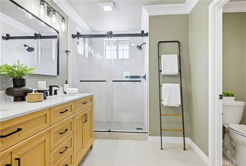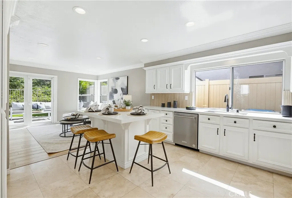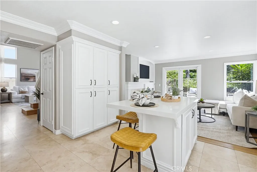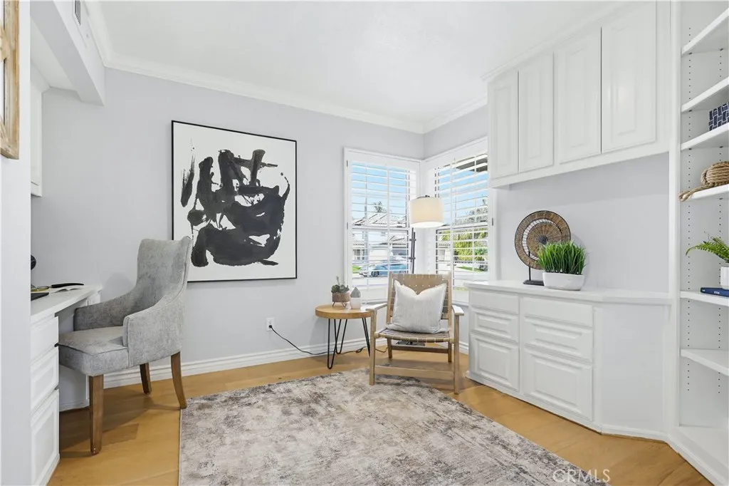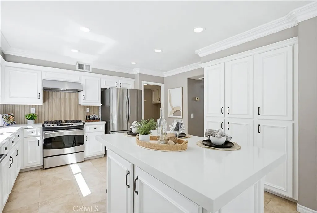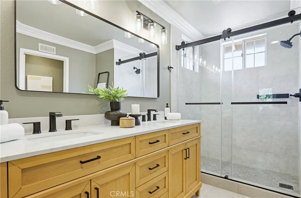 Prepare to fall in love with this spacious and beautifully updated California Crest home, a perfect example of pride in ownership! Ideally located on a family friendly cul-de-sac street in a highly desirable Pacific Hills neighborhood, this home pushes all the right buttons! Pass through the double door entry and soak in the soaring two story ceilings with an abundance of natural light streaming through the floor to ceiling windows. Extra wide crown molding, gorgeous wide plank wood floors, custom light fixtures, and a stunning centerpiece staircase set the stage for an impressive living environment. The formal living area is open to the formal dining room which features built-in cabinetry and wine rack, providing an elegant setting for dining and entertaining. Pass through to the sunny Kitchen which is open to the family room with built-in media center, cozy fireplace, and French doors opening to the backyard patio, a perfect indoor-outdoor living space. The beautifully updated and spacious kitchen features Quartz countertops and a stylish backsplash, timeless white cabinetry, Stainless-Steel appliances, and a prized center prep island with breakfast bar. The main level includes a stunning full bathroom with walk-in shower and a desirable bonus room perfect for a 4th bedroom or an executive home office with built-in bookcases and workstation. Travel up the light filled staircase to the large primary bedroom suite featuring vaulted ceilings, crown molding, two closets including a walk-in closet with built-in organizers, and a newly remodeled primary bath with custom Quartz