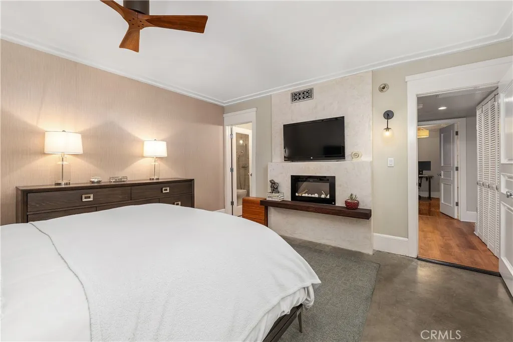 This stunning and sophisticated condo is located in prime Valley Village, offers the feel of a house with incredible design elements and well appointed features throughout. You are welcomed by a charming garden courtyard, flanked with stones, plants and a peaceful fountain. Upon entry you will immediately notice the decorator-finishes such as beam ceilings, wood-like vinyl floors (real ebony hardwood floors underneath) and recessed lighting. Continue into the open and bright living area with custom electric fireplace, home office nook with built-ins and double-pane slider that opens to the large patio-complete with zen-garden style and perfect for those early morning cappuccinos. The cooks kitchen features custom cabinets, Carrera marble counters and large pantry. The dining area is highlighted by built in bench seating with storage and beautiful light fixture. Views of greenery from every window and no expense spared in the details! Notice the arched doorways, solid core doors and custom niches to display treasures. The oversized master suite features exposed concrete flooring, crown molding, a second custom fireplace, white washed brick accent wall and nice size closet with organizers. Large picture window overlooks the private garden patio. Remodeled spa-like bathroom features Carrera marble counters, a large shower with bench, rain shower head and travertine counters. The second spacious bedroom has large closet with custom designed organizers and crown moldings. It is adjacent to the guest bathroom, with custom cabinets and a large stone-floor shower with rain shower h